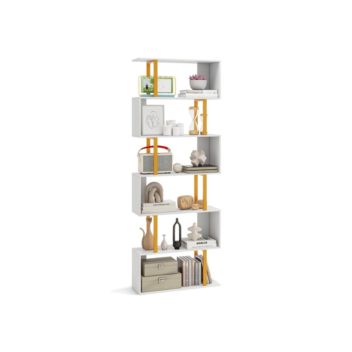Discover the modern centrepiece to elevate your interior! Imagine the allure of a stunning gold frame and sleek S-shaped shelves transforming your room into a showcase of modern elegance. This chic, towering bookshelf not only captivates the eye but offers an abundance of space on its multi-tier shelves - perfect for your books and beloved treasures. Built with stability in mind and mindful of your safety with anti-tipping features, this freestanding marvel seamlessly blends sophistication with practicality.