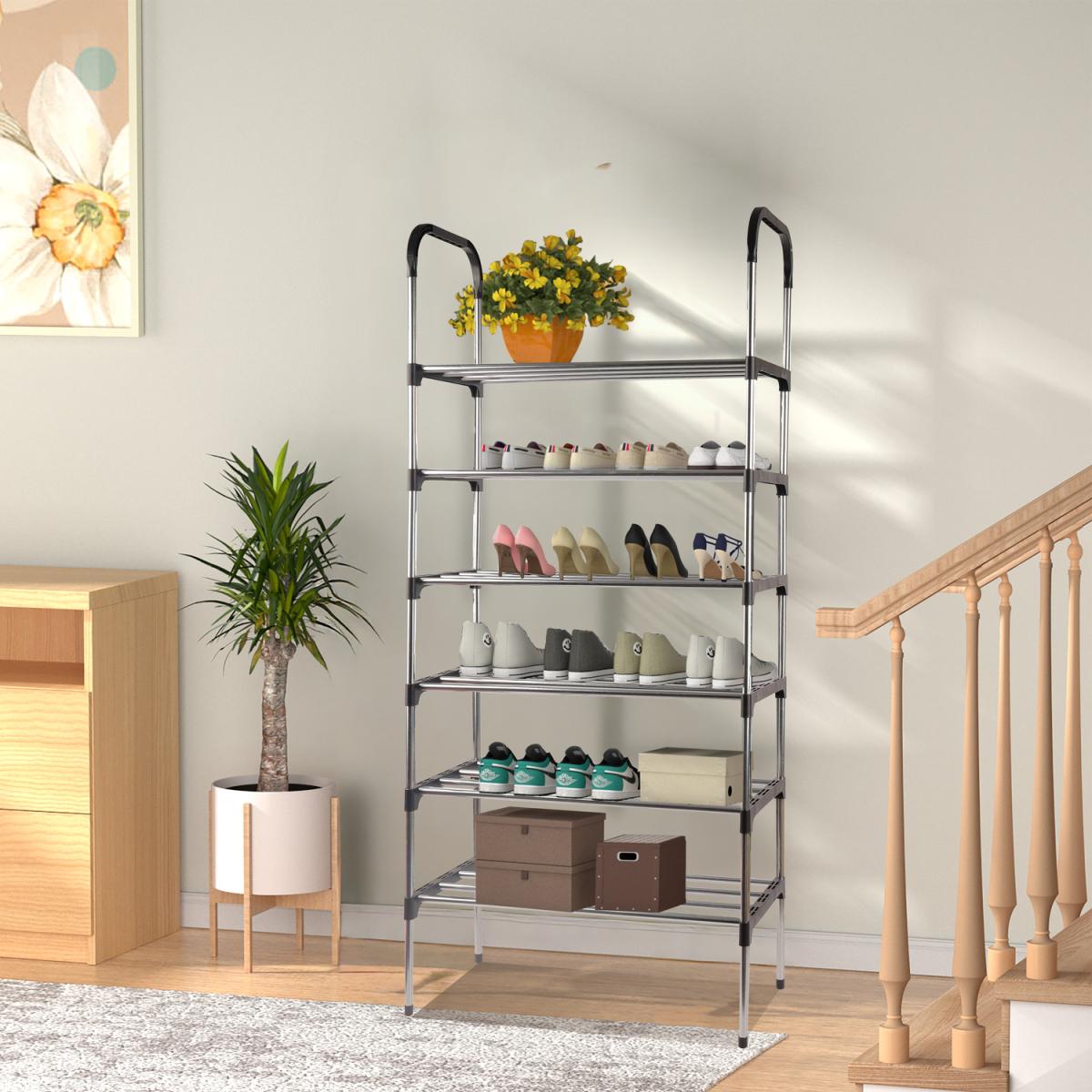 Say goodbye to messy entryways and cluttered closets with this sleek and functional 6 Tier Organising Shoe Rack. Designed to hold up to 18 pairs of shoes, this space saving storage solution is perfect for busy households, small apartments, or anyone looking to bring order to their footwear collection. With a sturdy metal frame, its lightweight yet strong enough to keep your shoes neatly displayed and easily accessible. Whether its trainers, heels, boots, or slippers, there is a spot for everything.