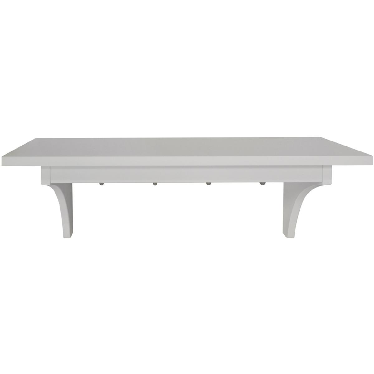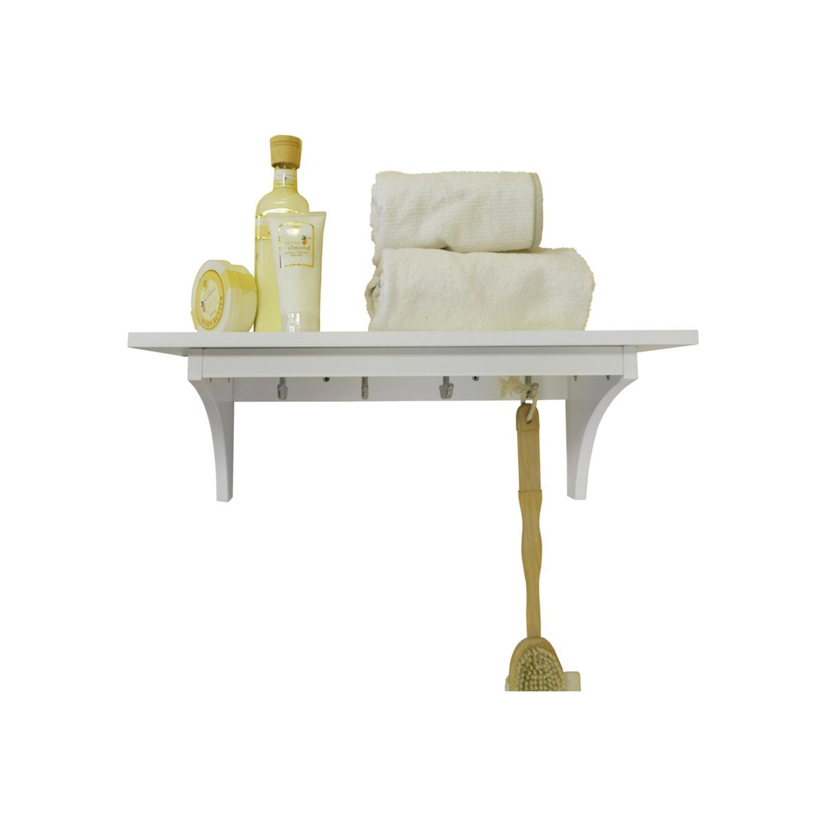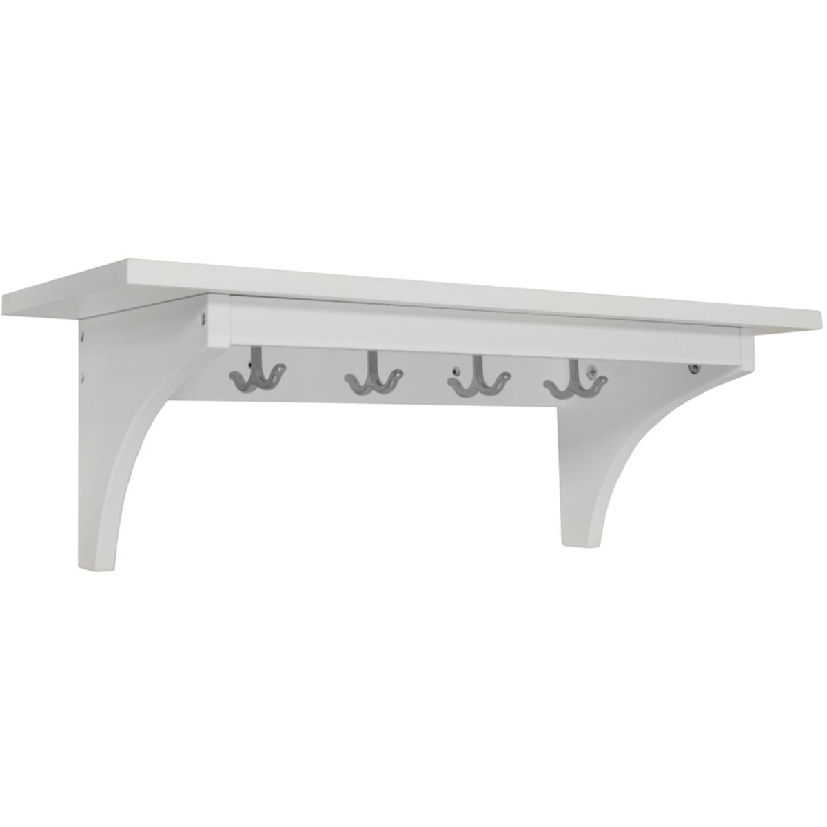 This versatile crisp white wall shelf is perfect all-round solution for keeping everything you need tidy and in one place. Use in the hallway for coats, bags, keys and essentials. In the kitchen as a drinks station, utensil organiser or for tea towels and oven mitts. In the bathroom for towels and toiletries. In a children's room for their everyday clothes or their dress up clothes. Each of the four sturdy double metal hooks are more than up for the job. Hooks measure 3.5cm each side x 4cm high (8w x 6h total size).