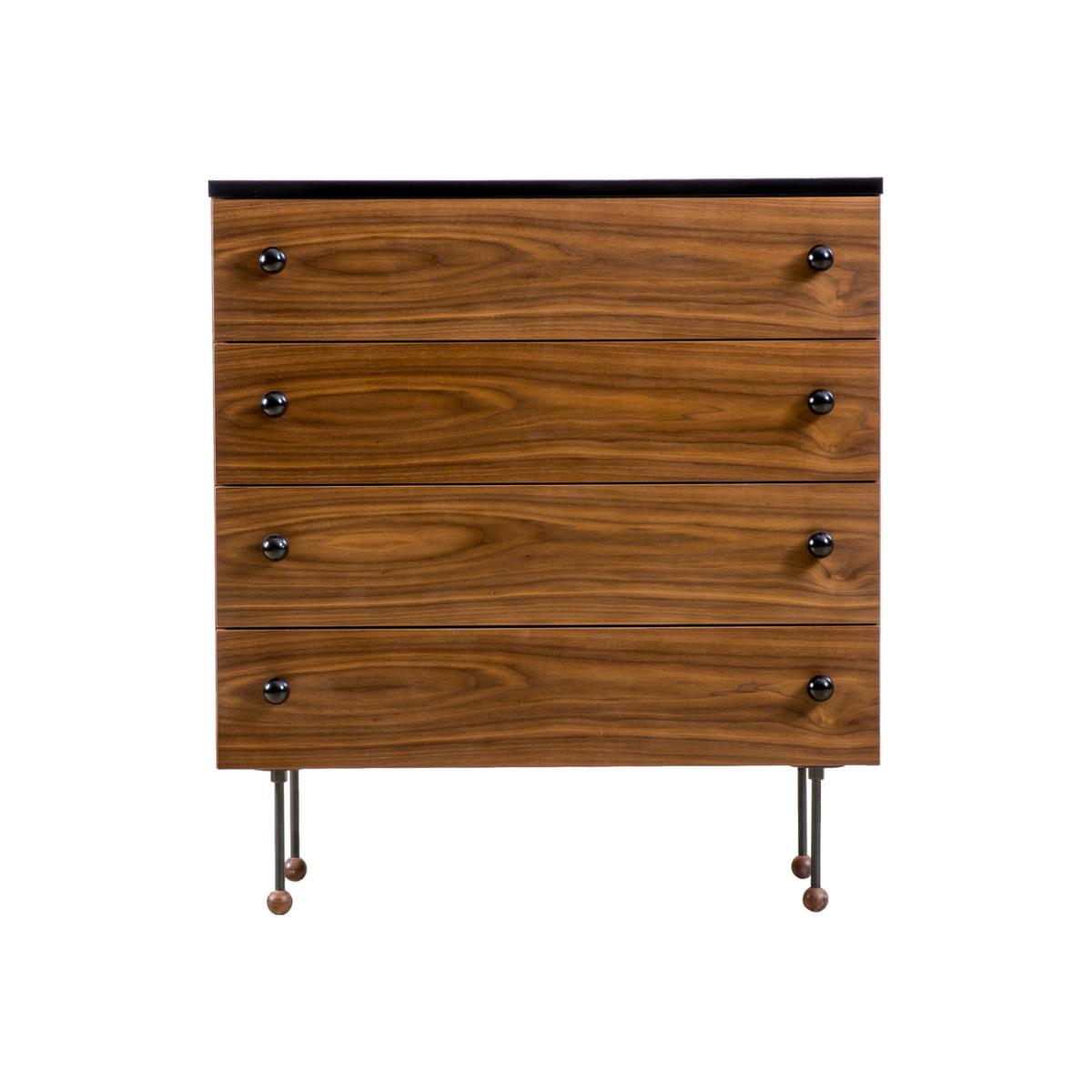 A simple light and dark colour scheme mixed with sophisticated shapes creates the ultimate furniture statement. Case in point: the Dresser 3 62-Series by designer Greta Grossman. Exquisitely crafted from American walnut veneer with a high-gloss black laminate top, this piece will add a striking two-toned effect to a retro-inspired bedroom. Powder-coated steel legs are accentuated with solid clear-lacquered American walnut globes which mimic the doorknob. Adding warmth and interest to any interior space, this graceful 62 Series dresser offers simplicity, versatility and timeless appeal.