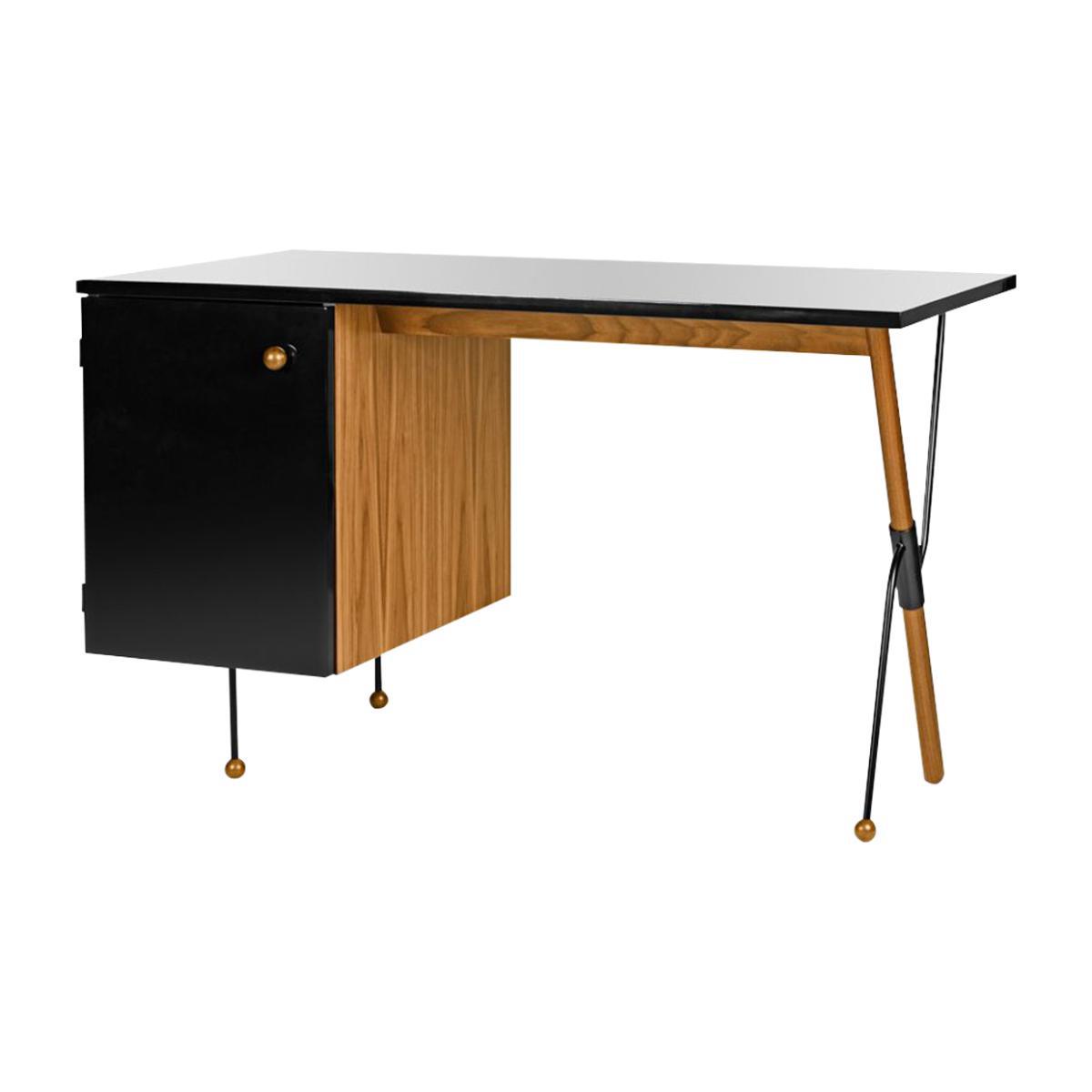 A simple light and dark colour scheme mixed with sophisticated shapes creates the ultimate furniture statement. Case in point: the Grossman Desk 62-Series. Exquisitely crafted from American walnut veneer with a high-gloss black laminate cabinet and tabletop, this piece will add a striking two-tone effect to a retro-inspired home office. Powder-coated steel legs are accentuated with solid clear-lacquered American walnut globes which mimic the doorknob. Adding warmth and interest to any interior space, this vintage-inspired desk offers simplicity, versatility and timeless appeal.
