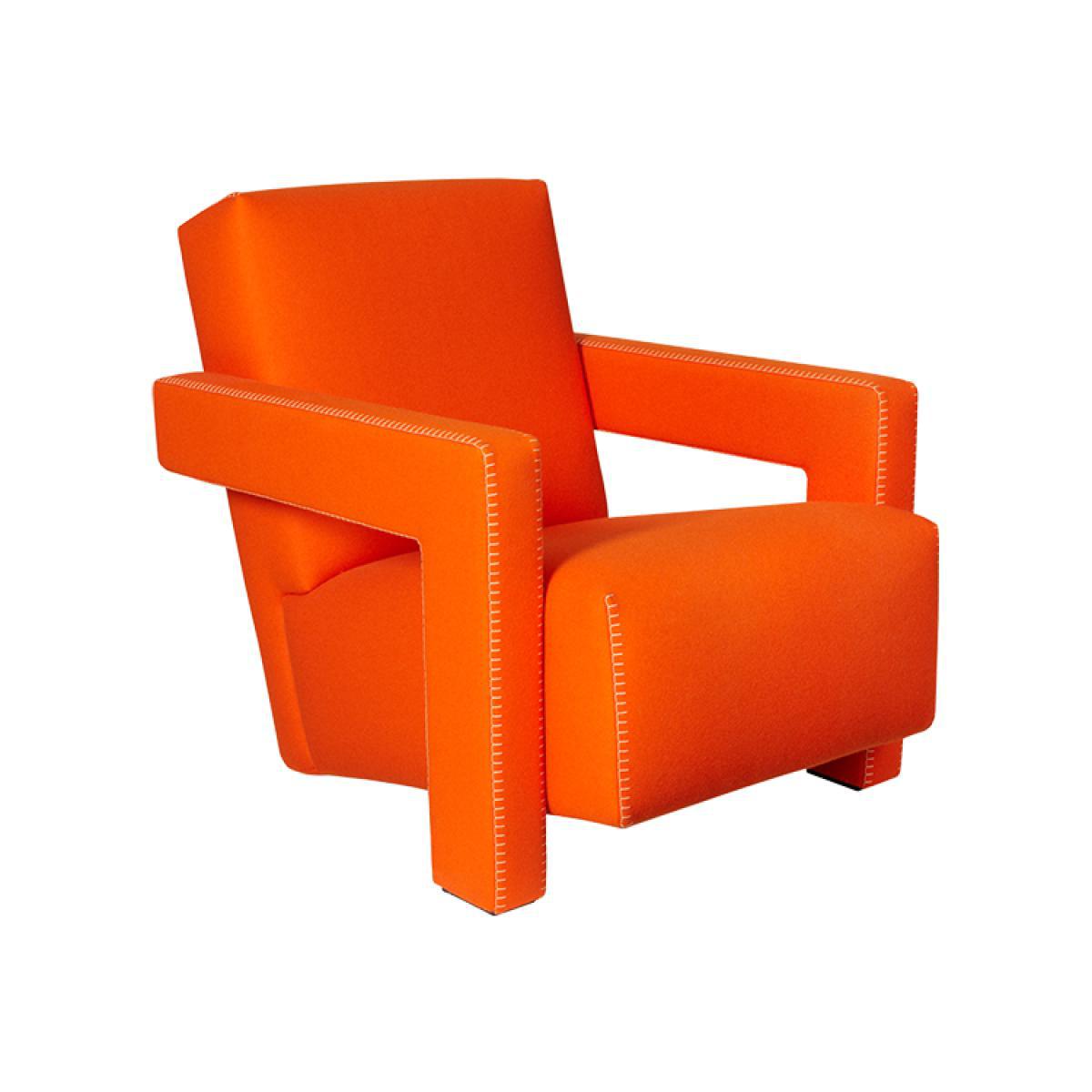 As unique and cutting-edge as ever, it's hard to believe the 637 Utrecht Armchair by Dutch designer Gerrit Rietveld is over 70 years old. Revolutionary for its time, this vibrant orange sculptural armchair continues to turn heads today. Originally conceived in 1935 for the Metz & co department store in Amsterdam, the 637 Utrecht Armchair has become a timeless design classic. Built around a steel frame with polyurethane foam and polyester padding, the chair gives the impression that it is floating, despite being as solid and sturdy as any well-designed armchair. Finished with contrasting fine stitch detailing, this vibrant orange design is sure to inject your home with eye-catching angles and vivid colour.
