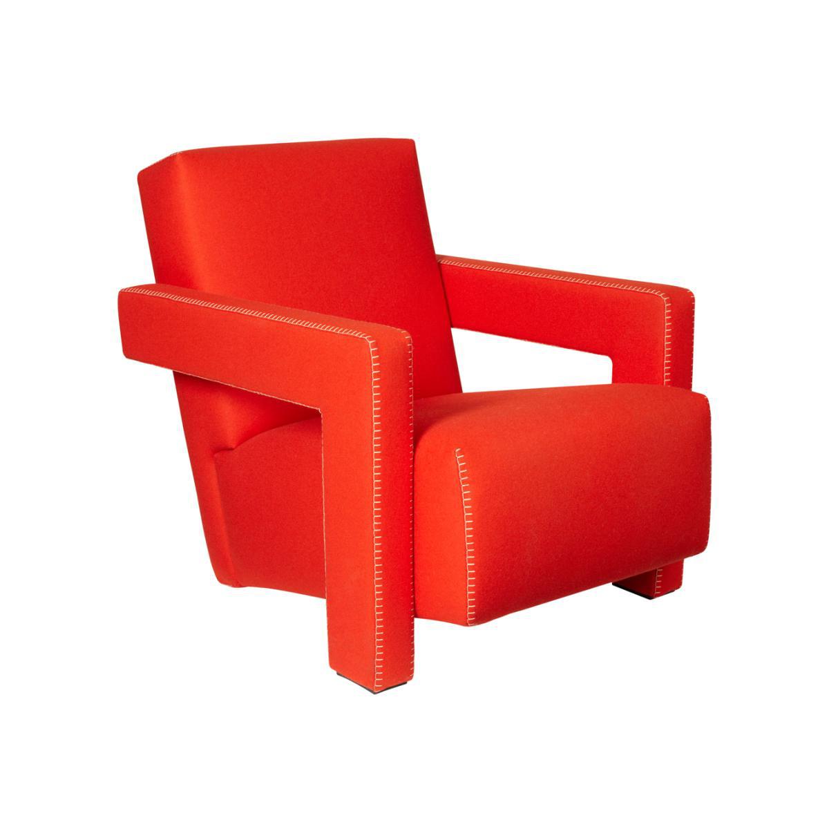 As unique and cutting-edge as ever, it's hard to believe the 637 Utrecht Armchair by Dutch designer Gerrit Rietveld is over 70 years old. Revolutionary for its time, this vibrant red sculptural armchair continues to turn heads today. Originally conceived in 1935 for the Metz & co department store in Amsterdam, the 637 Utrecht Armchair has become a timeless design classic. Built around a steel frame with polyurethane foam and polyester padding, the chair gives the impression that it is floating, despite being as solid and sturdy as any well-designed armchair. Finished with contrasting fine stitch detailing, this vibrant red design is sure to inject your home with eye-catching angles and vivid colour.