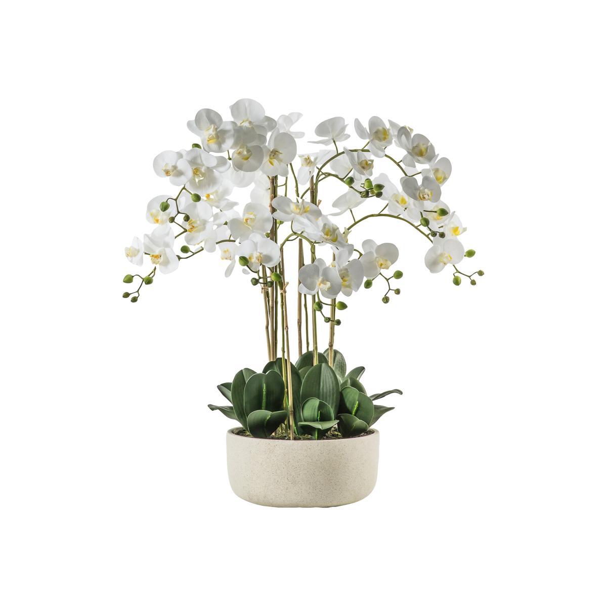 I love this faux white orchid in a bowl for its timeless elegance and versatility. It’s perfect for adding a sophisticated touch to side tables, office desks, or open shelving without the maintenance of real plants. The clean white blooms and lush green leaves make it adaptable across various interior styles, from modern and minimalist to classic and traditional. For styling tips, try pairing it with neutral tones or metallic accessories for a fresh look, and consider placing it in a shallow bowl or shallow decorative tray to create a more polished display. Its height means it works well as a statement piece on a console table or as an eye-catching centrepiece on a dining or coffee table.