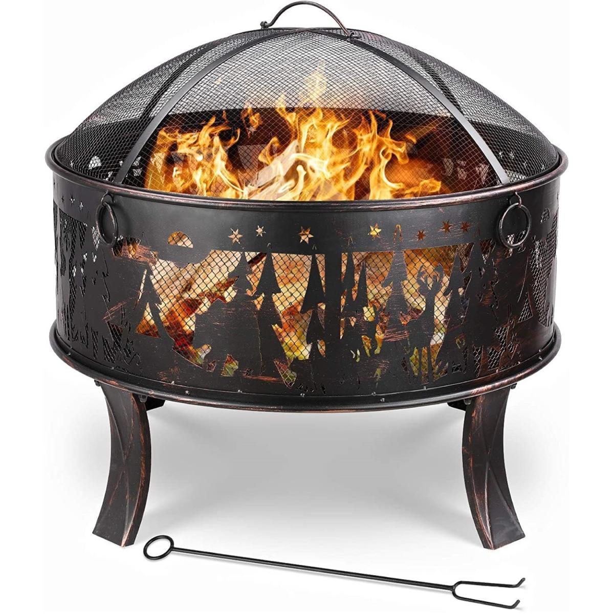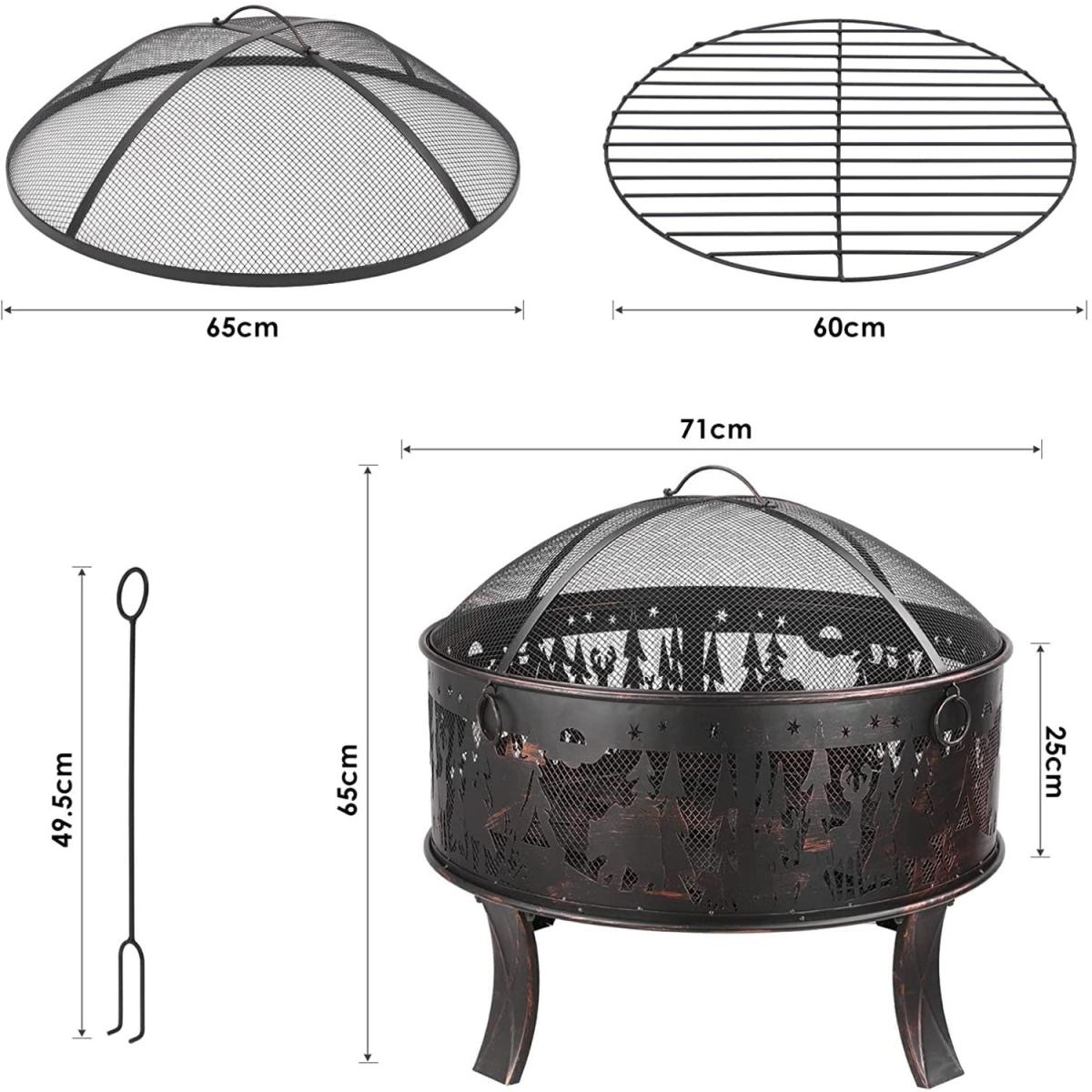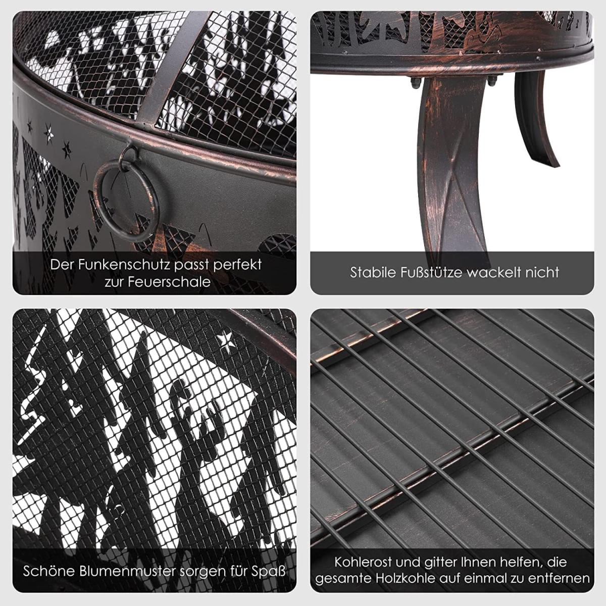 The circular hearth can circulate air and heat, providing continuous warmth and comfort. A well-ventilated iron grille can provide more heat. Also, you can clearly see the internal fire source and add wood or estimate the end time. The flower and grass pattern on the outside of the fire bowl looks very elegant. The fire bowls are made of durable thick iron and are coated with high-temperature-resistant bronze paint. It has excellent rust resistance and heat resistance up to 932 Fahrenheit Degree. The frame, which consists of 4 legs, ensures general stability. Safe: The protective grille prevents sparks or dirt from splashing. The poker can easily check the flame and raise the flame guard. The fire basket can be used for heating and grilling. You can also roast hot dogs or marshmallows, which are great for entertaining guests. It has a beautiful Elk Pattern, and adapts to all environments. Perfect for cold winter nights offers warmth and creates a warm atmosphere. In addition, it is equipped with four rings for carrying to make it easier to carry the fire bowl. The large capacity fire bowl can hold more charcoal or wood, the large garden fire bowl 69 * 69 * 65cm can meet the needs of a campfire party and a multi-person barbecue, and is very suitable for meeting with family and friends. Equipped with a charcoal grate that leaves enough air gaps for the burning carbon and wood, which makes the wood easier to burn.