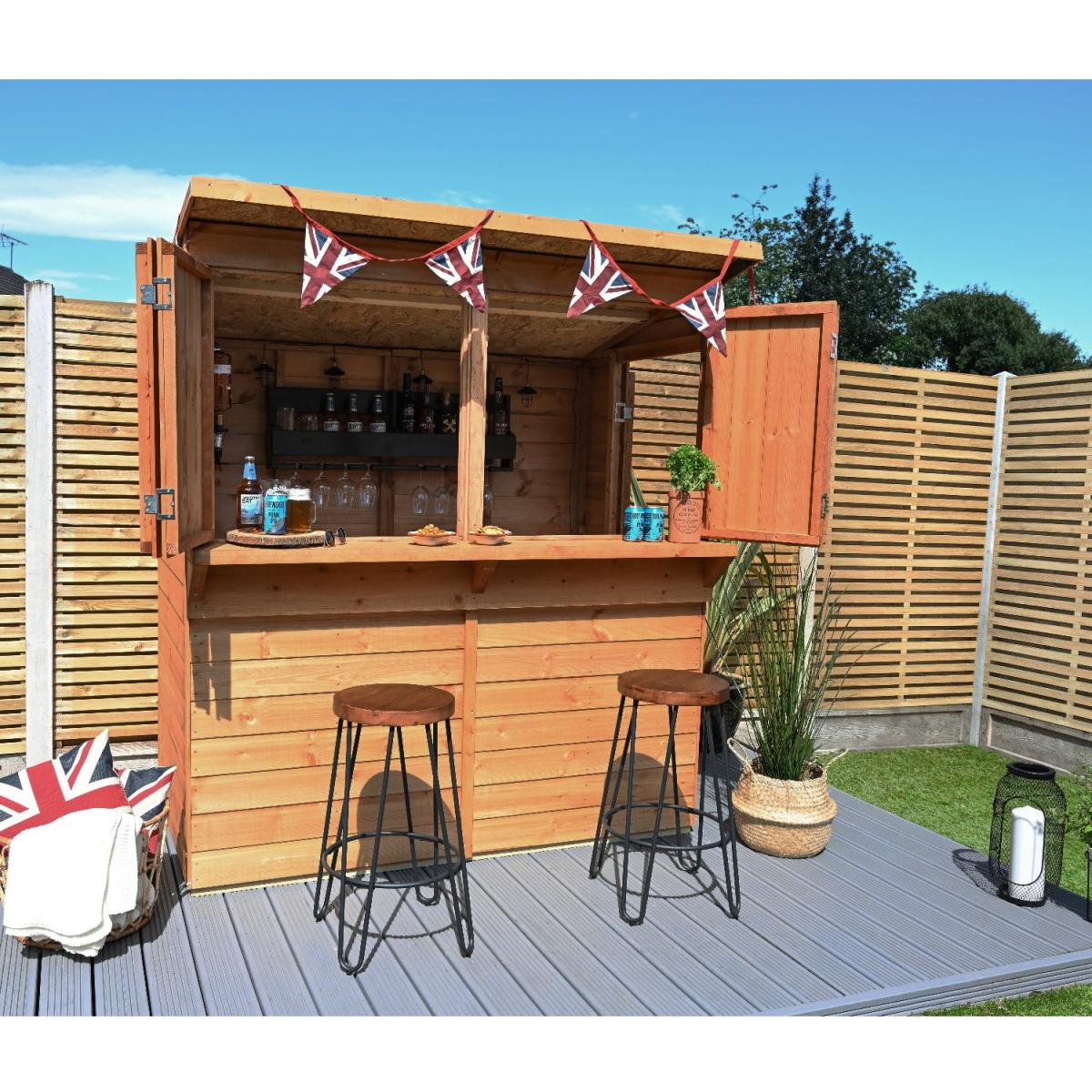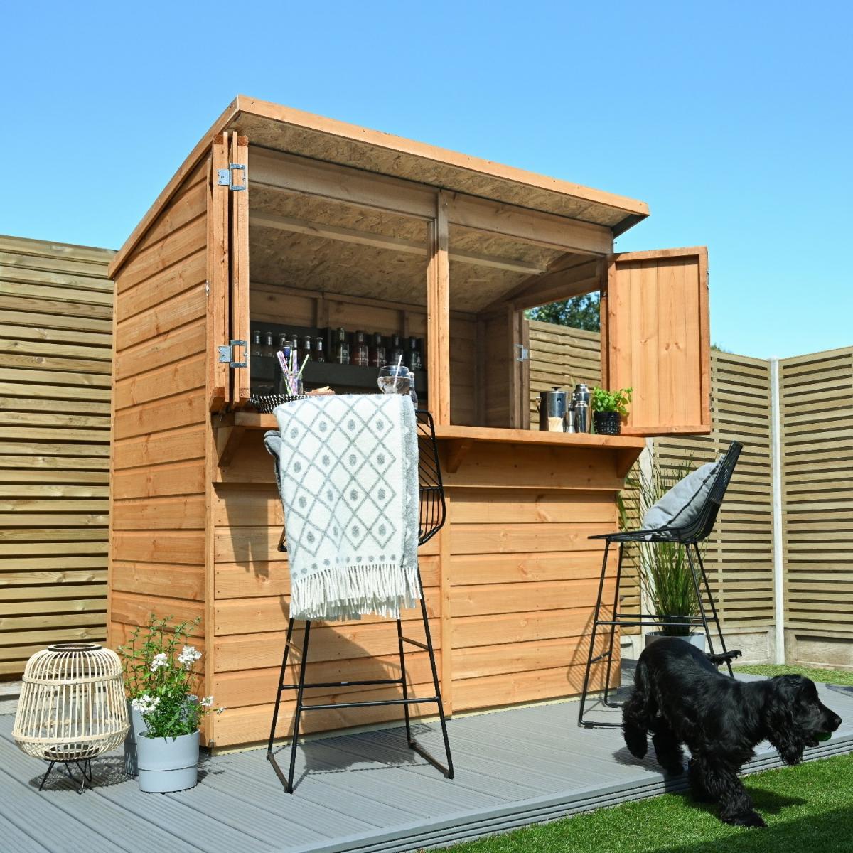 Quality smooth T&G cladding boards provide improved weather resistance Can be used as a garden bar in the summer and for storage during winter months Strong solid timber boarded floor, pressure treated Bi-fold shutters provide protection from the elements when closed, but can be easily opened when entertaining Hidden door hinges, can't be unscrewed from the outside