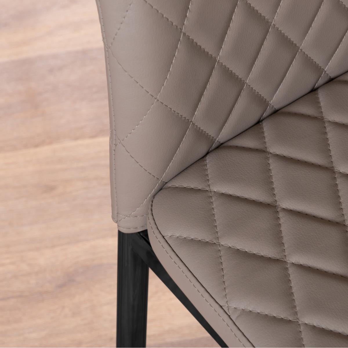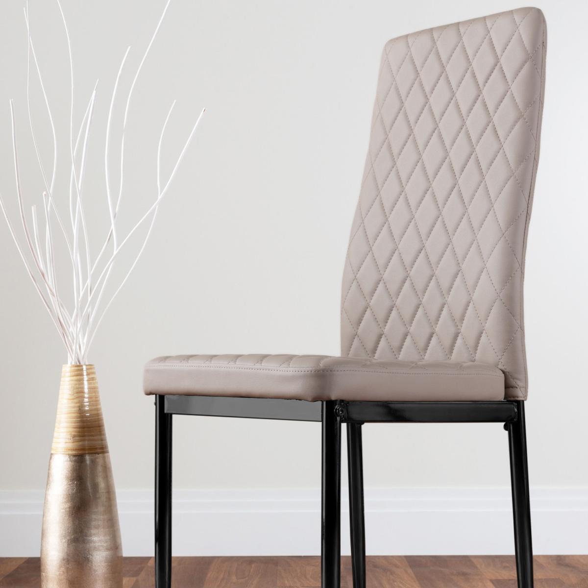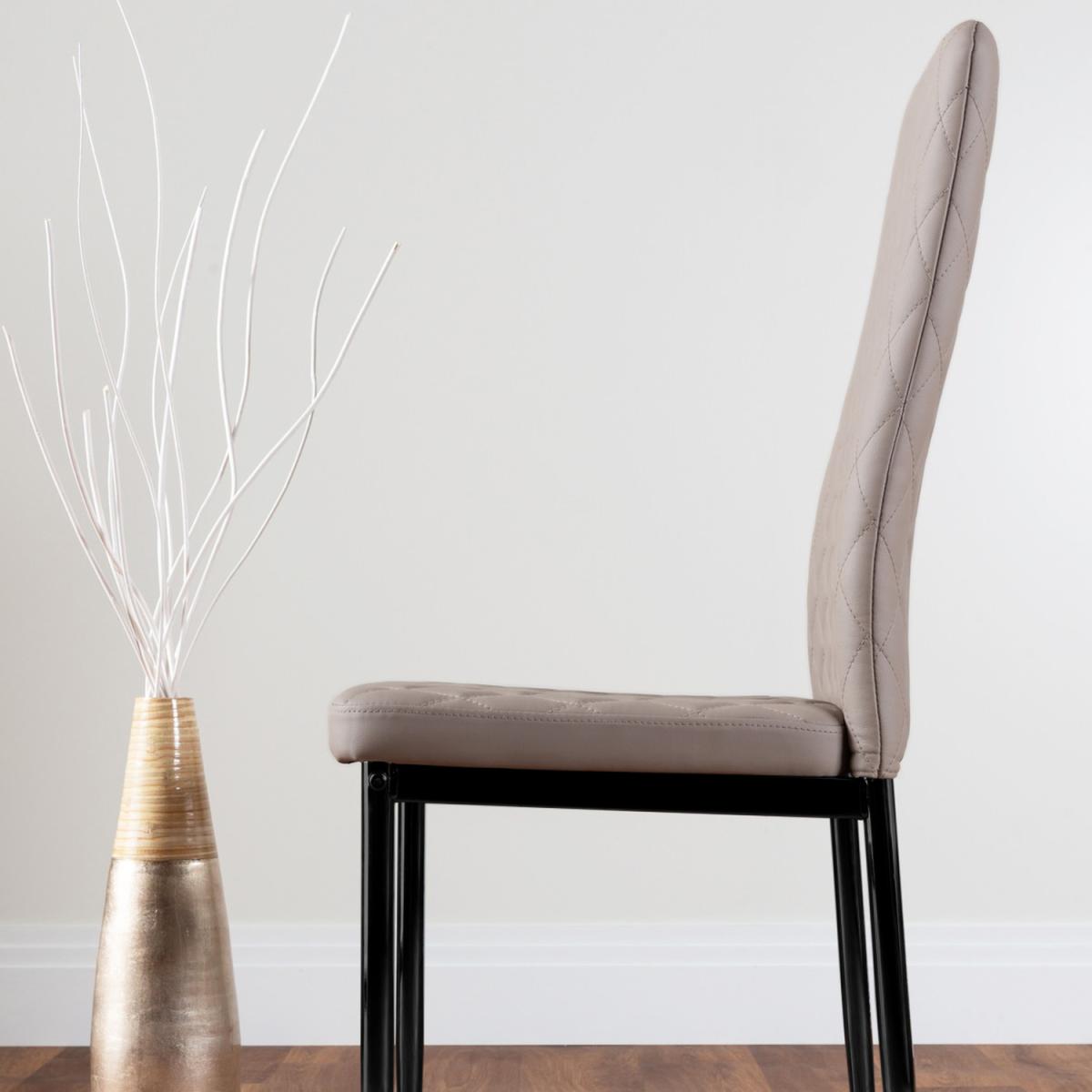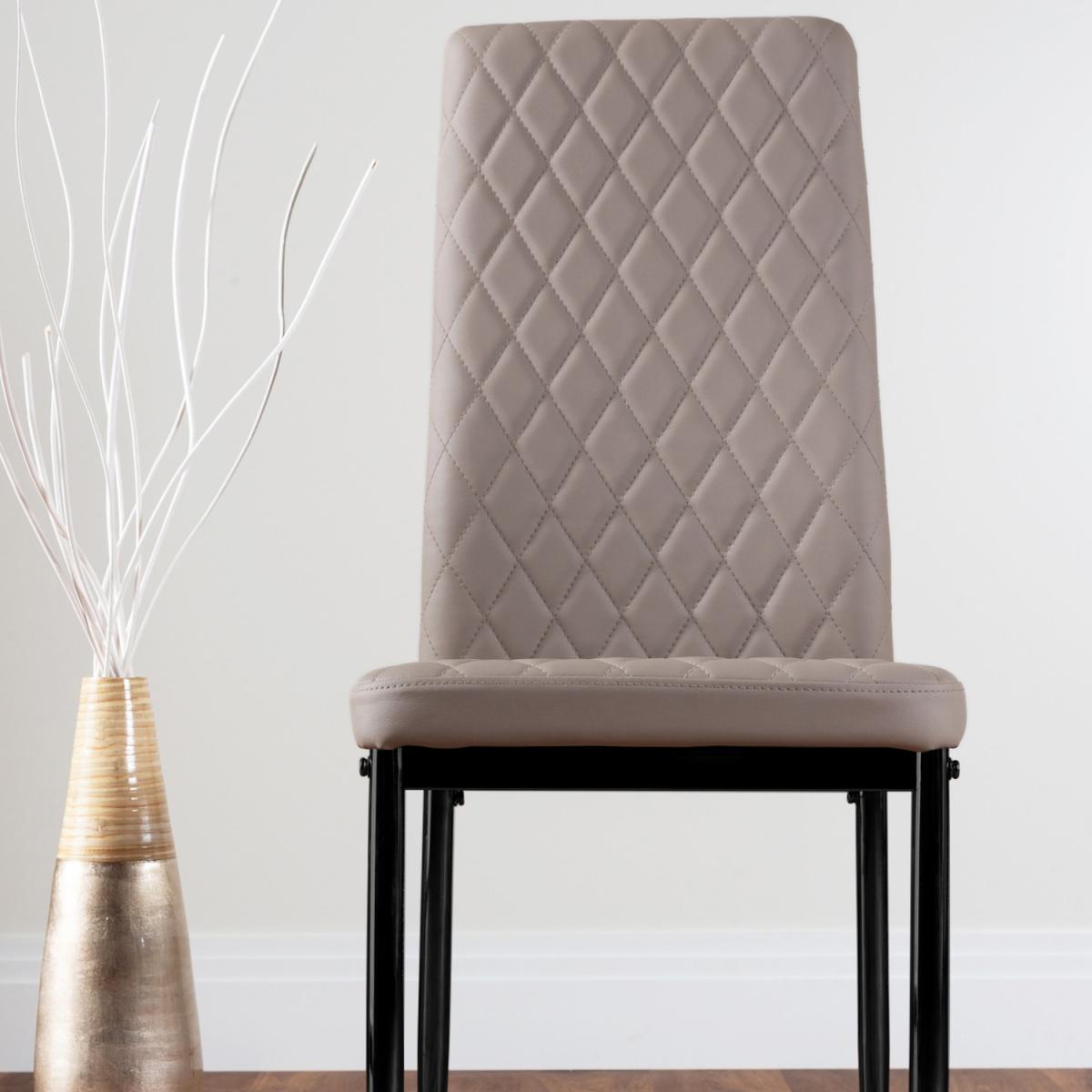 Upholstered in soft faux leather and finished with diamond pattern stitching the Milan dining chairs would seamlessly fit in with most dining spaces, whilst not compromising on either style or comfort. Upholstered with soft faux leather which is smooth to the touch but also easy to wipe clean. Perfect for families with messy eaters! The stitched diamond design of the seat and back cushion adds a plush appearance to this popular dining chair. The seat and back are tightly stitched to ensure the longevity of the chairs even with regular use. The complimentary sleek black finish chair legs offer a strong base for this faux leather dining chair which has been load tested up to 130kg. Plastic feet help to protect your flooring without intruding on the elegant design. Our Milan dining chairs offer a simple yet elegant dining chair design with its angular design being softened by the slight curve of the back for lumbar support. The diamond stitching on the back and seat is replicated on the back of the dining chair so it looks good out on the show and also when tucked underneath the table. The design of this chair has been perfected over many years here at Furniturebox to create a perfectly designed and affordable dining chair. The thick seat cushion is comfortable and the chair has been ergonomically designed for maximum comfort and support.