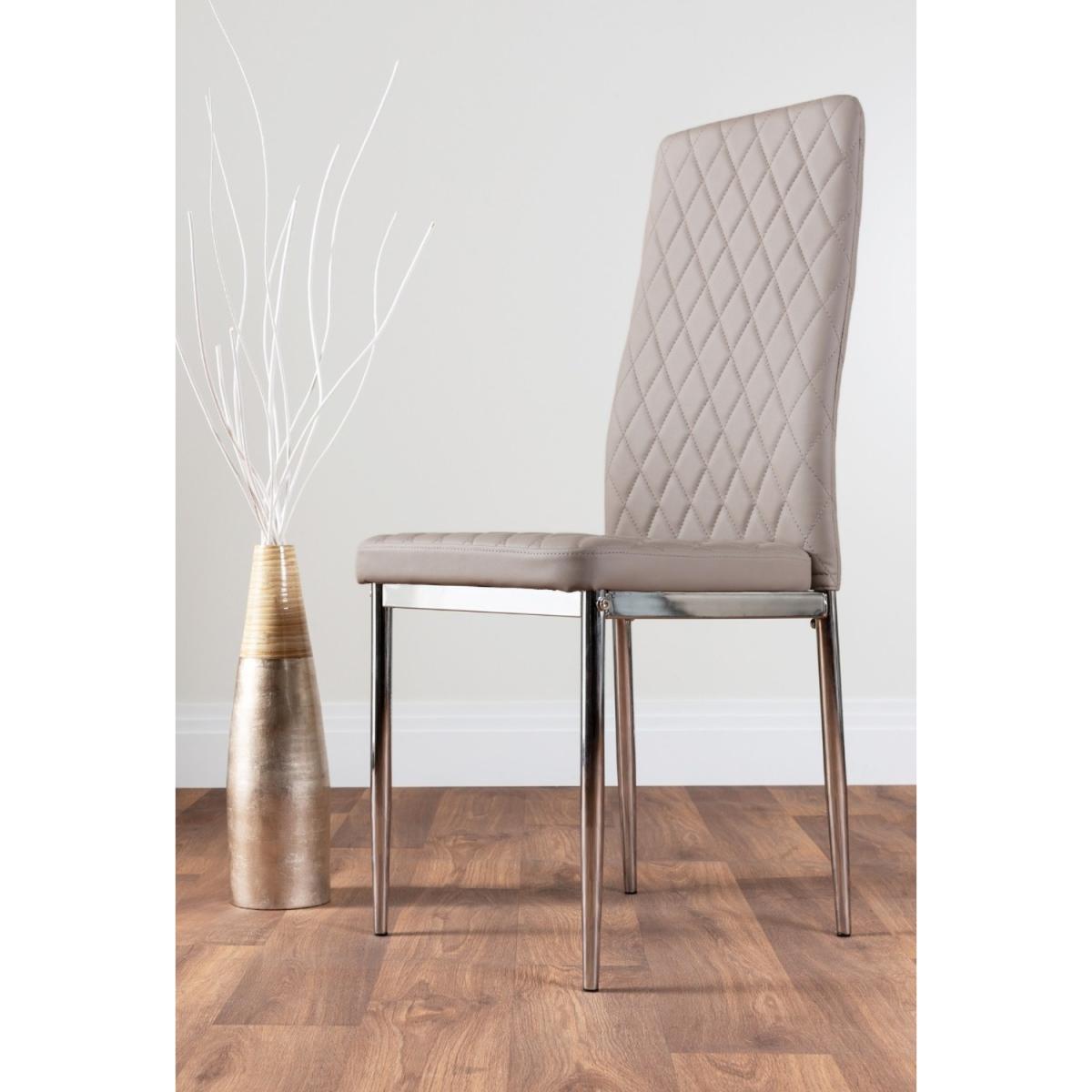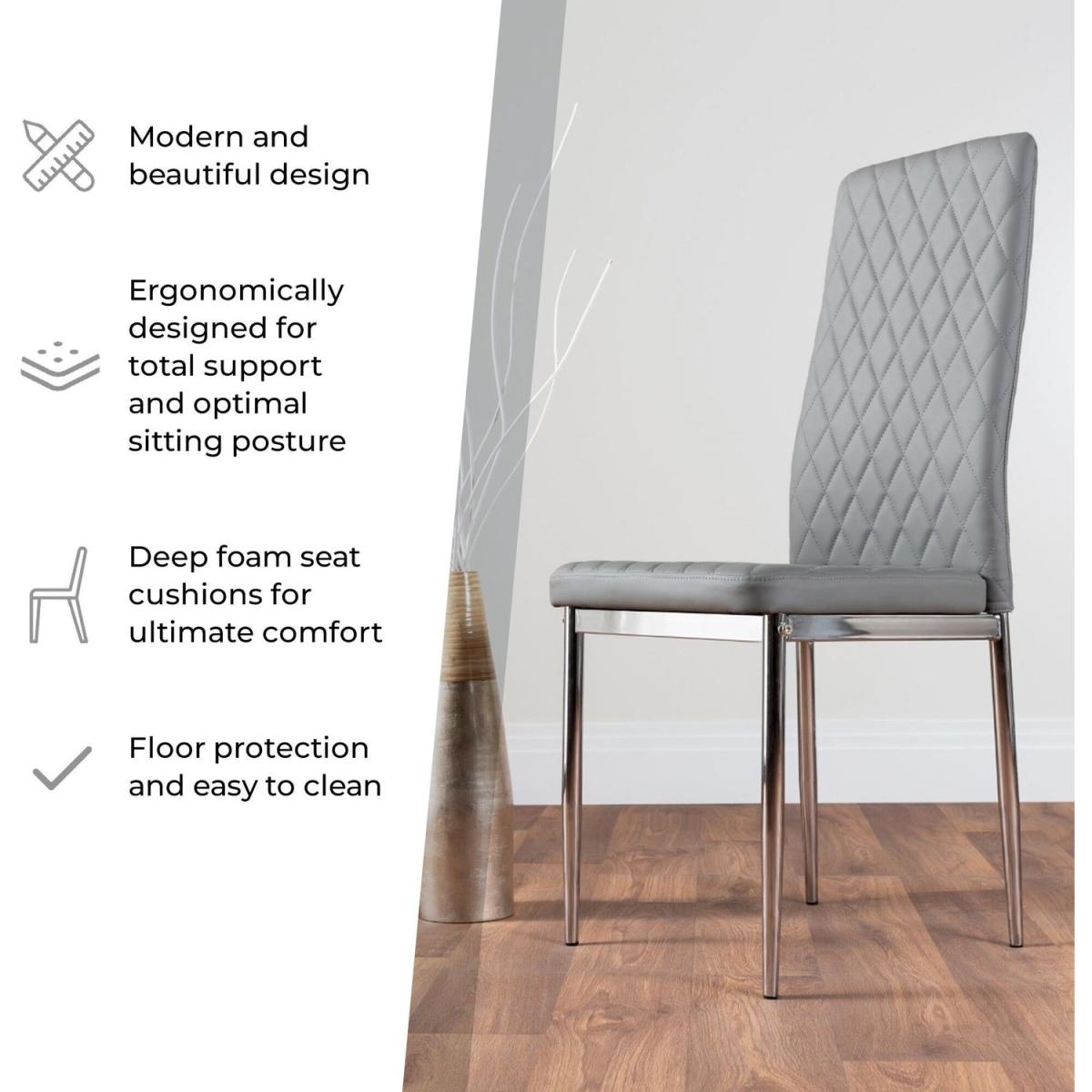 Upholstered in soft faux leather and finished with diamond pattern stitching the Milan dining chairs would seamlessly fit in with most dining spaces, whilst not compromising on either style or comfort. The stylish chrome leg and hatched leather combination gives this chair a contemporary edge, whilst its simple design allows for practical everyday usage. The chairs are made from high-quality faux leather and are ergonomically designed for maximum comfort and support.