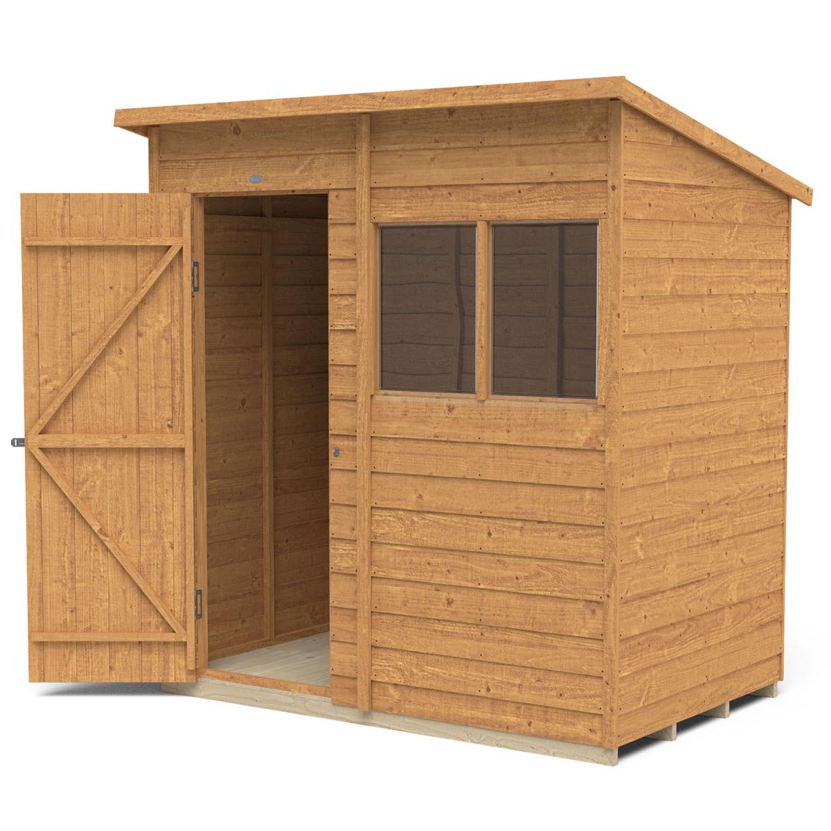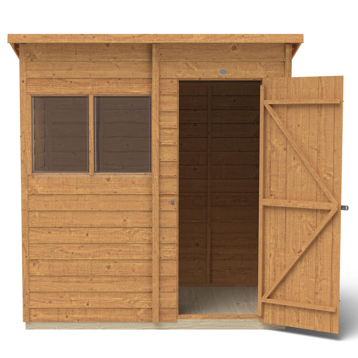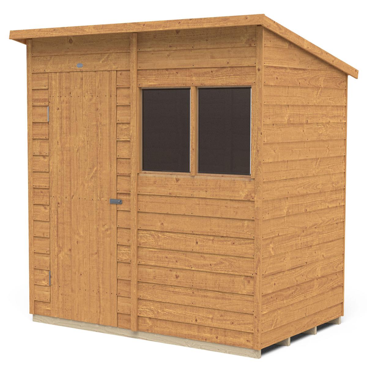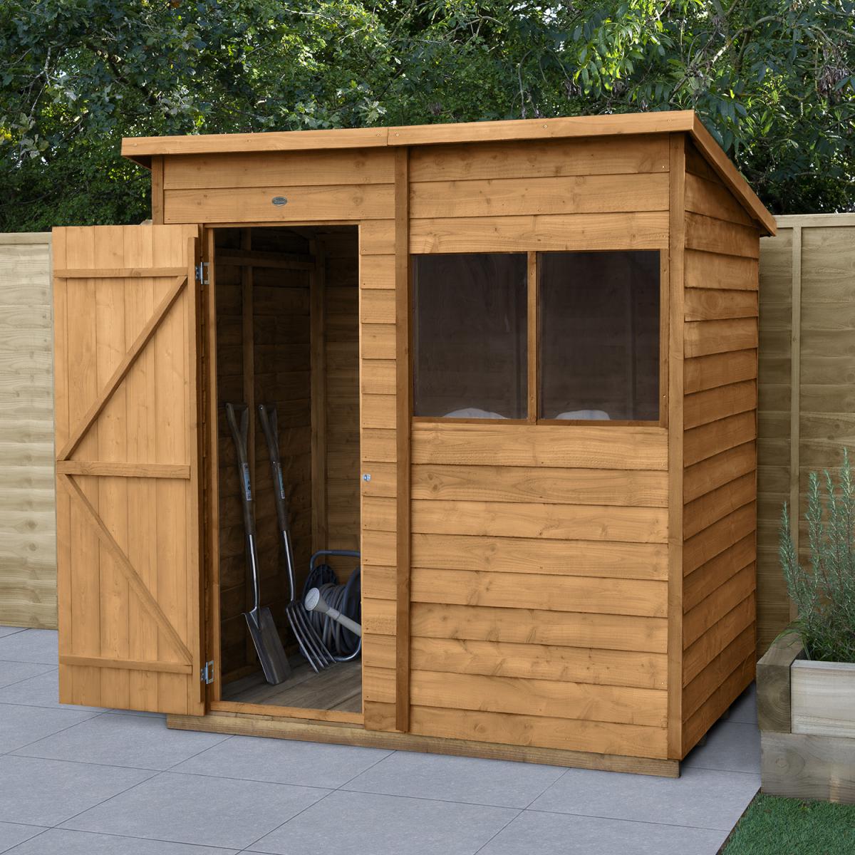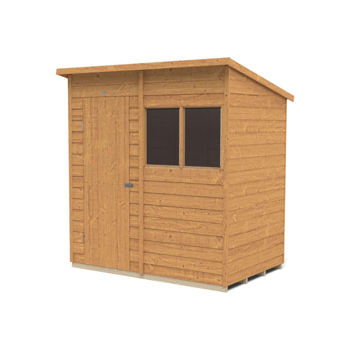 The 6x4 Overlap Dip Treated Pent Shed is the ideal garden storage shed, helping you keep your garden neat, tidy, and stylish. The slanted pent roof is perfect for placing this shed against a wall or fence and will look brilliant in your garden. It’s perfect for storing away garden machinery and tools, bikes, kids' outdoor toys, and much more. Constructed using pressure treated timber, the Overlap Pent Shed will stay strong and durable for years to come. It is resistant to rot and fungal infections, and the overlap design of the timber boards allows for natural movement of the timber during changing weather conditions and aid in water run-off. With increased framing to give the building a stronger construction, the shed comes with a solid timber floor, which is much sturdier than more common OSB, making it ideal for storing heavier gardening equipment. The windows are made from shatter-proof PET glazing, which won't become yellow and brittle over time, making sure your shed always looks attractive. The shed also comes with hidden security measures, featuring anti-tamper hinges that can't be seen or accessed from the outside, as well as a hasp and staple latch that allows you to padlock the door. The dip treating of the timber allows for the burnt gold colour and natural wood grain to really shine through. This paired with the understated yet stylish construction will help this Pent Shed become a decisively sweet and charming structure within your garden, complimenting all natural foliage and any colour scheme of your decor. Installation by a team of professionals is available for an extra yet affordable price, and all fittings and fixtures are included with this shed, as well as easy-to-follow instructions are included for any DIY hobbyists who want to really make this shed their own by building it themselves.
