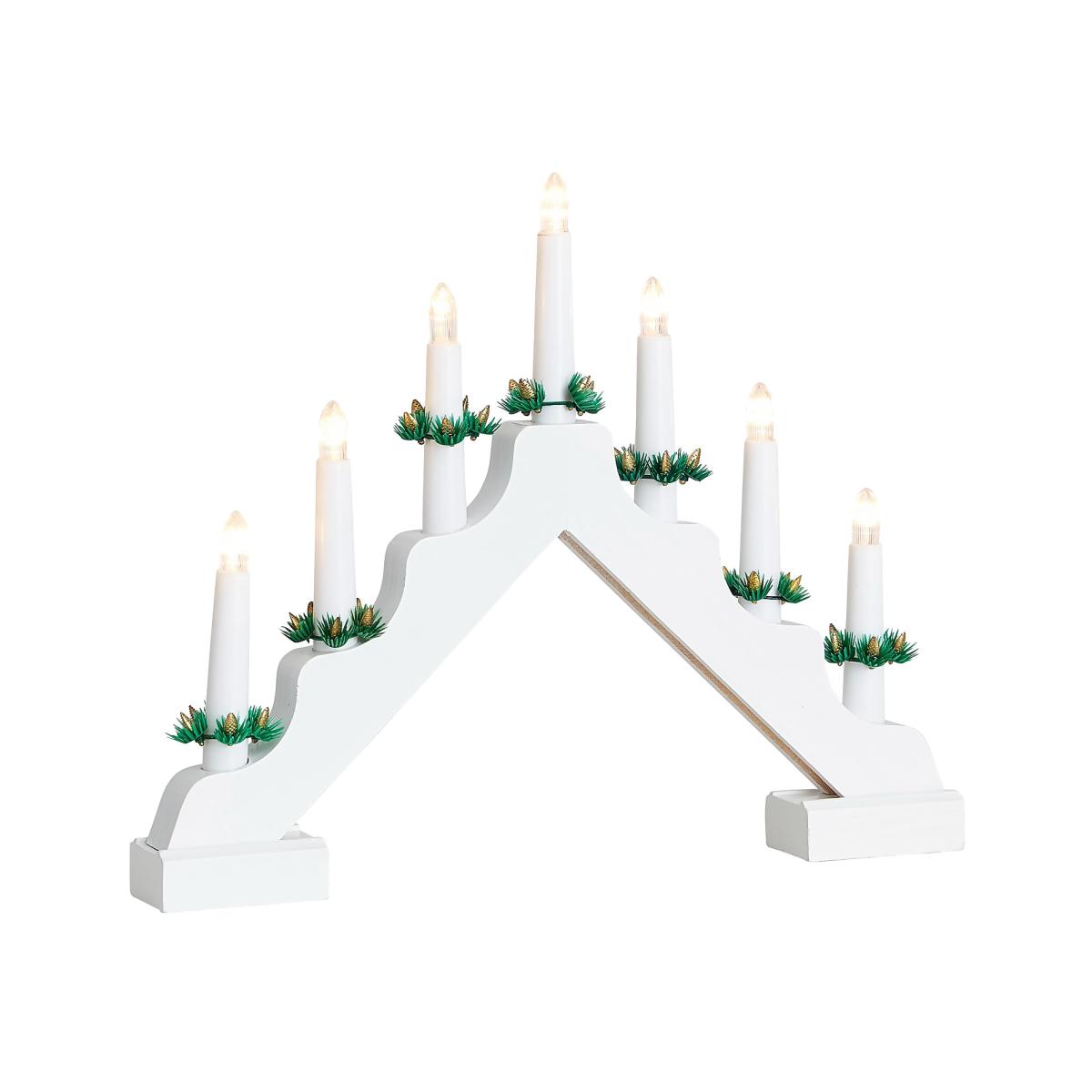 Bring a warm glow to your festive display. This white wooden candle bridge is topped with static LED candles and is battery operated, so it will illuminate your mantlepiece or windowsill wonderfully.