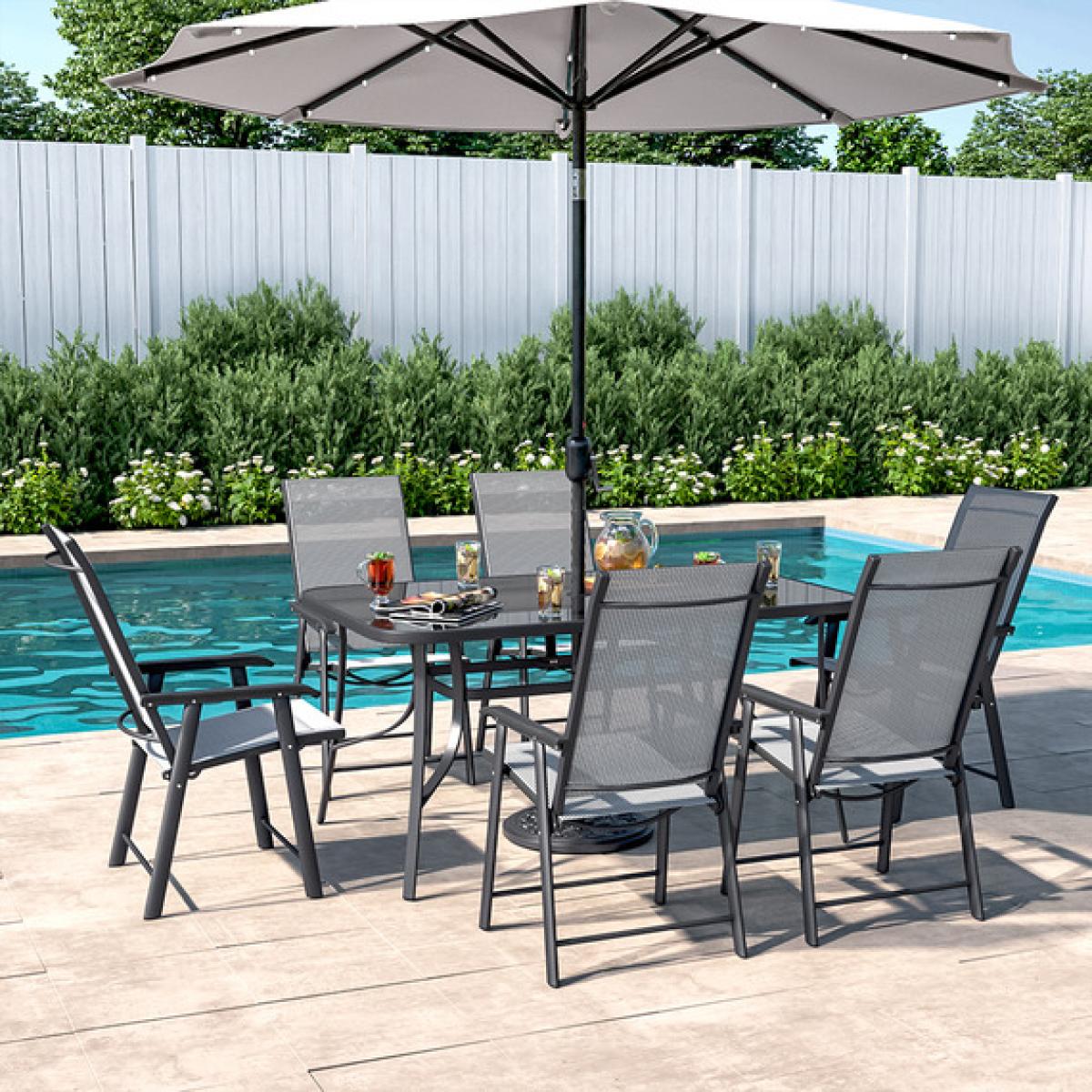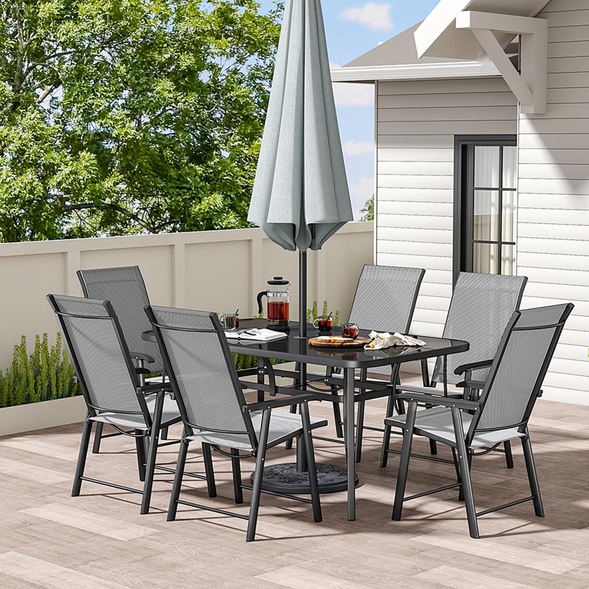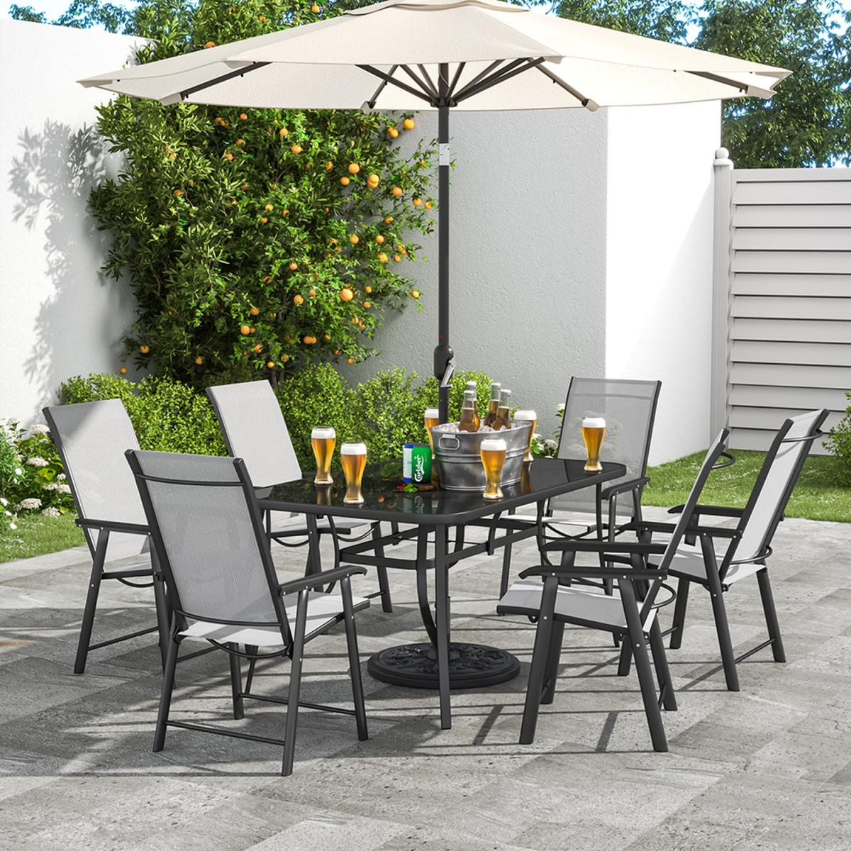 The 7-Piece Outdoor Dining Set beautifully transforms any backyard into an elegant dining area with its superior quality and deep comfort feel. Included in this set are 6 folding chairs and a 120cm Rectangle dining table with umbrella hole. This decorative set is weather-resistant and boasts beautiful powder coated framework for a long-lasting use.