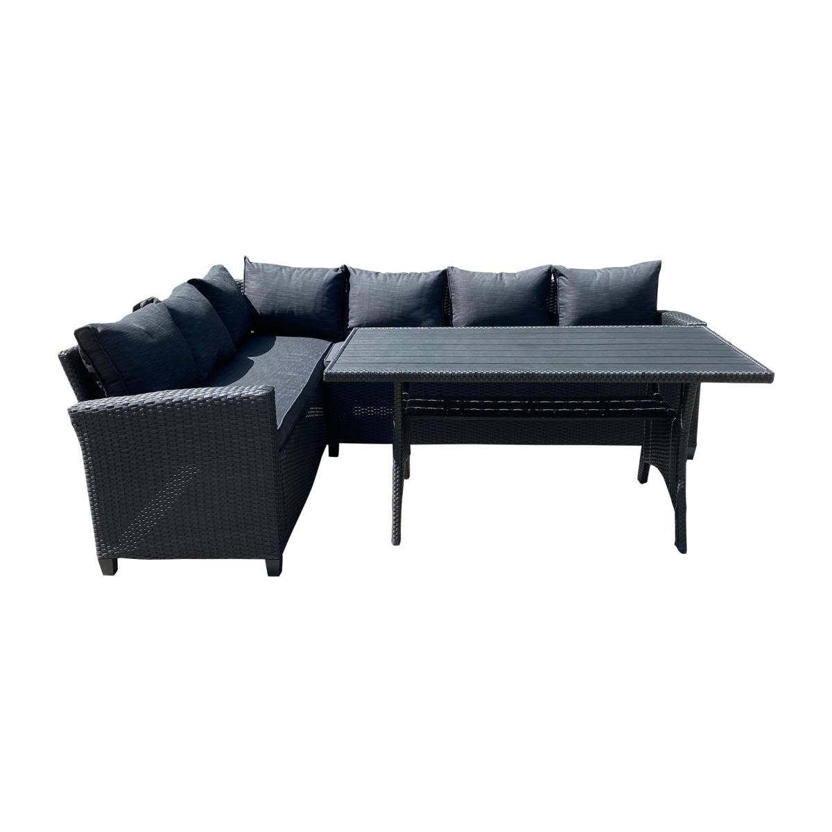 This outdoor sectional backyard furniture has a steel frame and beautiful hand-woven PE rattan. All-weather rattan is more UV and water-fighting than normal wicker, so it's perfect for outdoor dining. The thick padded seat and back cushions of the patio sectional furniture set offers maximum comfort for your lounging experience. The cushion cover is easy to clean with a water-repellent and stain-resistant polyester cover. The long rectangle rattan table with a matching bench of the outdoor sofa set creates a centrepiece for the sectional and a place for you to eat and drink with friends.