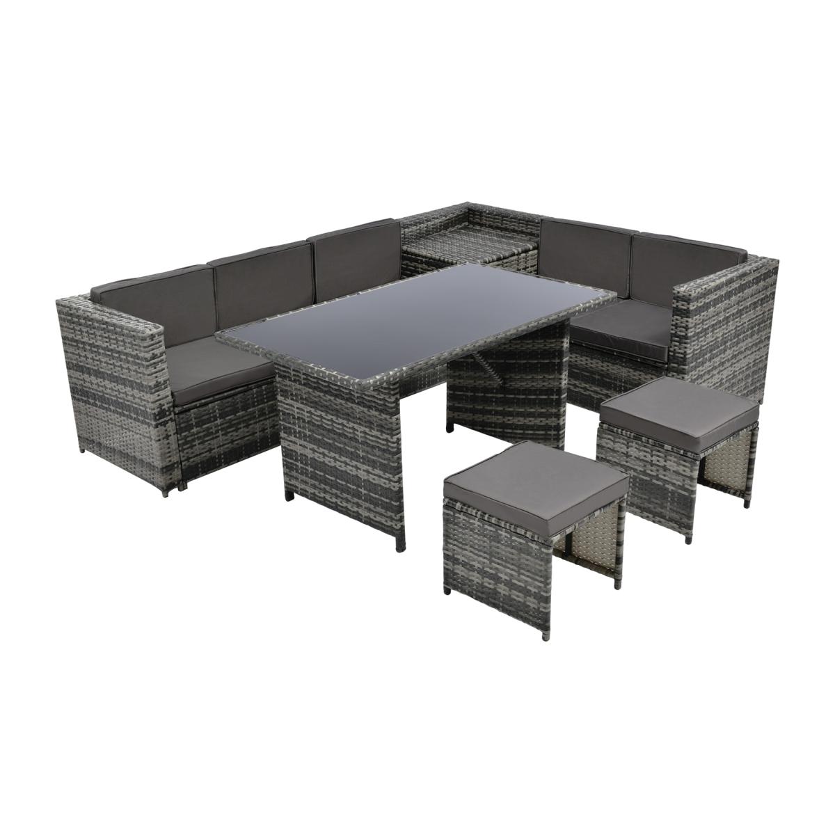 Compact Design:This 7-seat Rattan Garden Sofa Set consists of a 5-seat L-shaped sofa with storage box, a dining table and 2 stools. Wonderfully Versatile: The corner storage features with hinges can be used as a table and storage box, great for quickly and conveniently storing away any mess in a hurry. Ultra-deep capacity design for easy storage of sundries. Two extra stools can be stored under the dining table for a compact design. High-Quality Material: Constructed with a PE rattan weave material, UV protected, fade resistant, weatherproof leave outside all year around. The metal frame is sprayed with black anti-rust powder, suitable for any weather. For Real Comfort-Lovers: The soft cushions and the stools, which can be used as extra seats or comfortable footrests, ensure relaxed lounge vibes in the great outdoors. Quick Assembly: Includes all necessary hardware and detailed instructions. Each piece is engineered for easy assembly. (Notice: Full set comes in 4 packages, which might not arrive at the same time. Contact us immediately if you find any damage caused during transport)