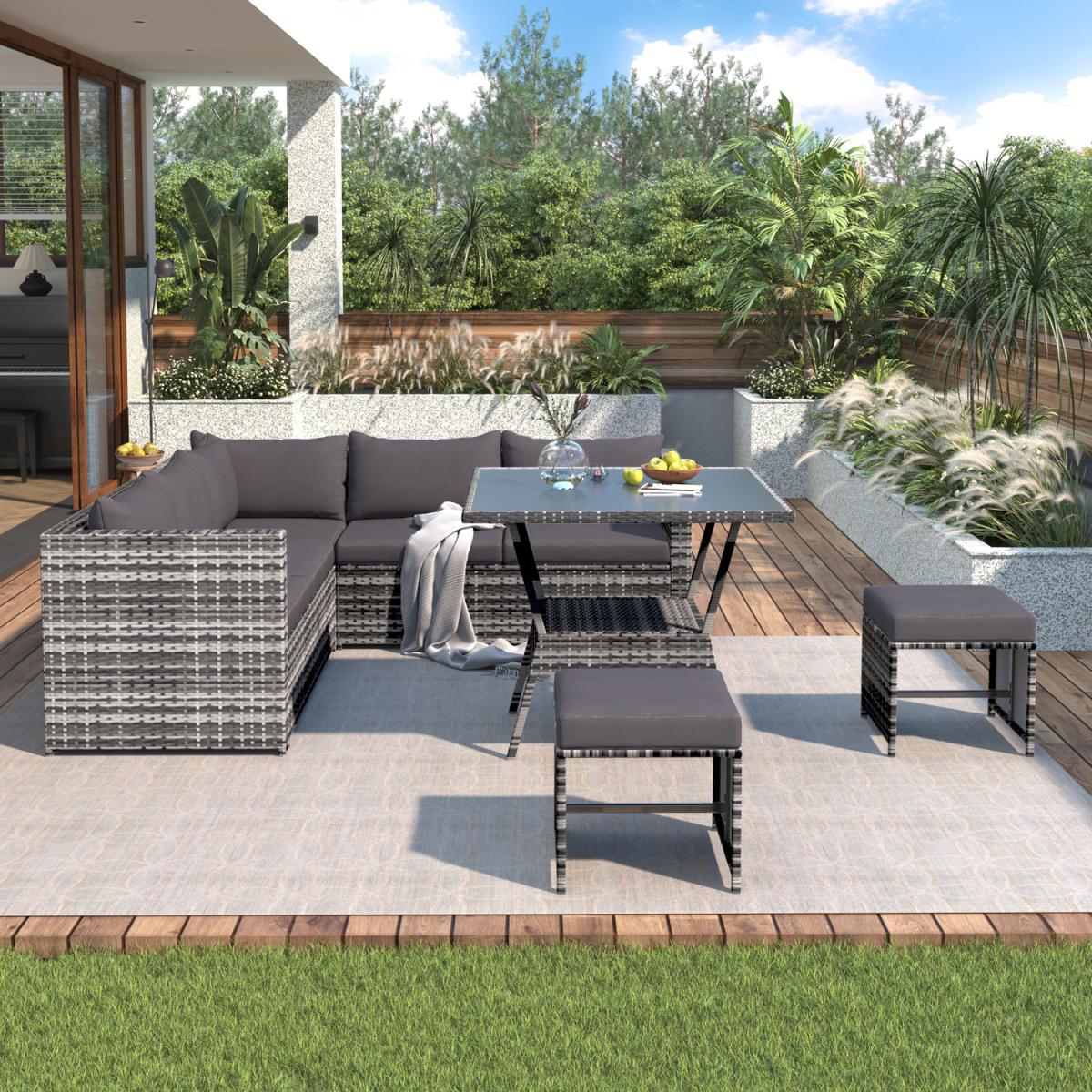 Multifunctional design: This set includes a 7-seater corner sofa and a high glass-top dining table, which can meet the needs of outdoor leisure and dining. Whether you are gathering with family and friends to chat or enjoying outdoor dining, you can easily handle it. Strong applicability: This set of furniture is suitable for indoor and outdoor use. It can be placed in outdoor spaces such as gardens, courtyards, and balconies, and can also be moved into indoor places such as living rooms and balconies for use. It has great flexibility and applicability. PE rattan manufacturing: Made of PE rattan, it is UV-resistant, waterproof and anti-corrosion. It can be used in outdoor environments for a long time without being damaged by natural elements, ensuring the long-term stability and beauty of the furniture. High glass top dining table: Equipped with a high glass top dining table, it not only has a good visual effect, but is also easy to clean, has a flat and smooth surface, can accommodate multiple people, and provides a comfortable dining experience. Comfortable Gray Cushions: Equipped with grey cushions, they are not only beautiful and stylish, but also comfortable and soft, providing good sitting feeling and support, allowing you to enjoy maximum comfort when relaxing outdoors.