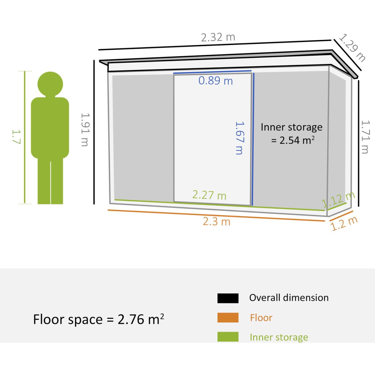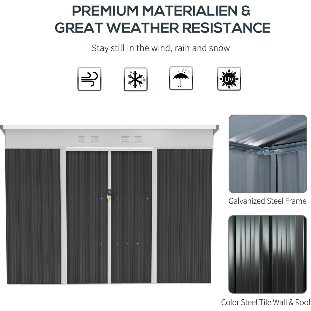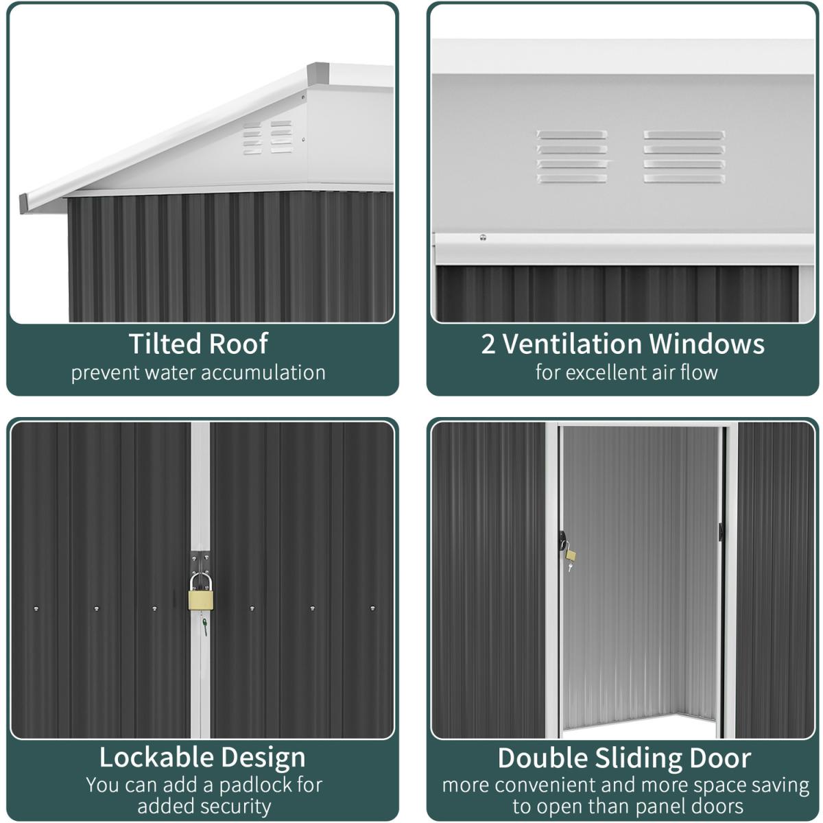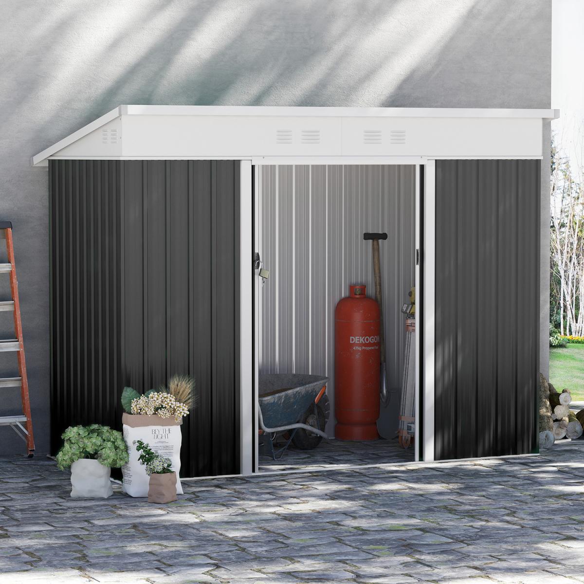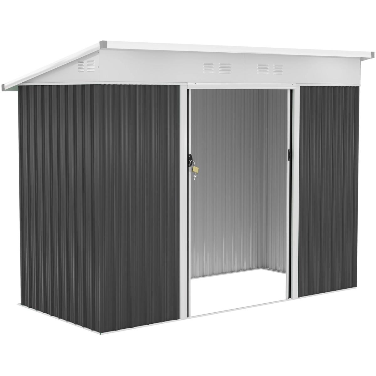 Transform your garden with this Outsunny storage shed. The roomy interior is ideal for storing large tools and equipment to keep your outdoors clean. Made from reinforced steel, the structure is rustproof, UV-resistant, sturdy and durable. It is fitted with a sliding double door for easy access, alongside two vents to keep inside dry and aerated. It's finished with a tilted roof and lock on the door.