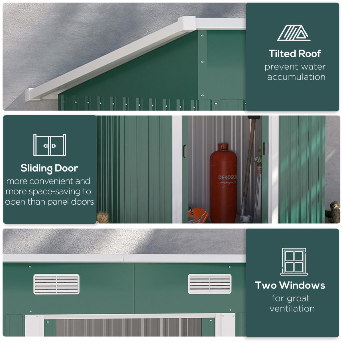 This Outsunny garden shed is a safe and protective way for keeping tools, equipment and outerwear stored. It's also spacious enough as a bike storage shed too - great for the outdoor adventurers. Made from corrugated steel, it's strong, fitted with a sloped shed to prevent rainwater building up. Two front vents and a window for air - keeps inside fresh as possible. A sliding door for easy access, shed comes complete with a floor foundation.