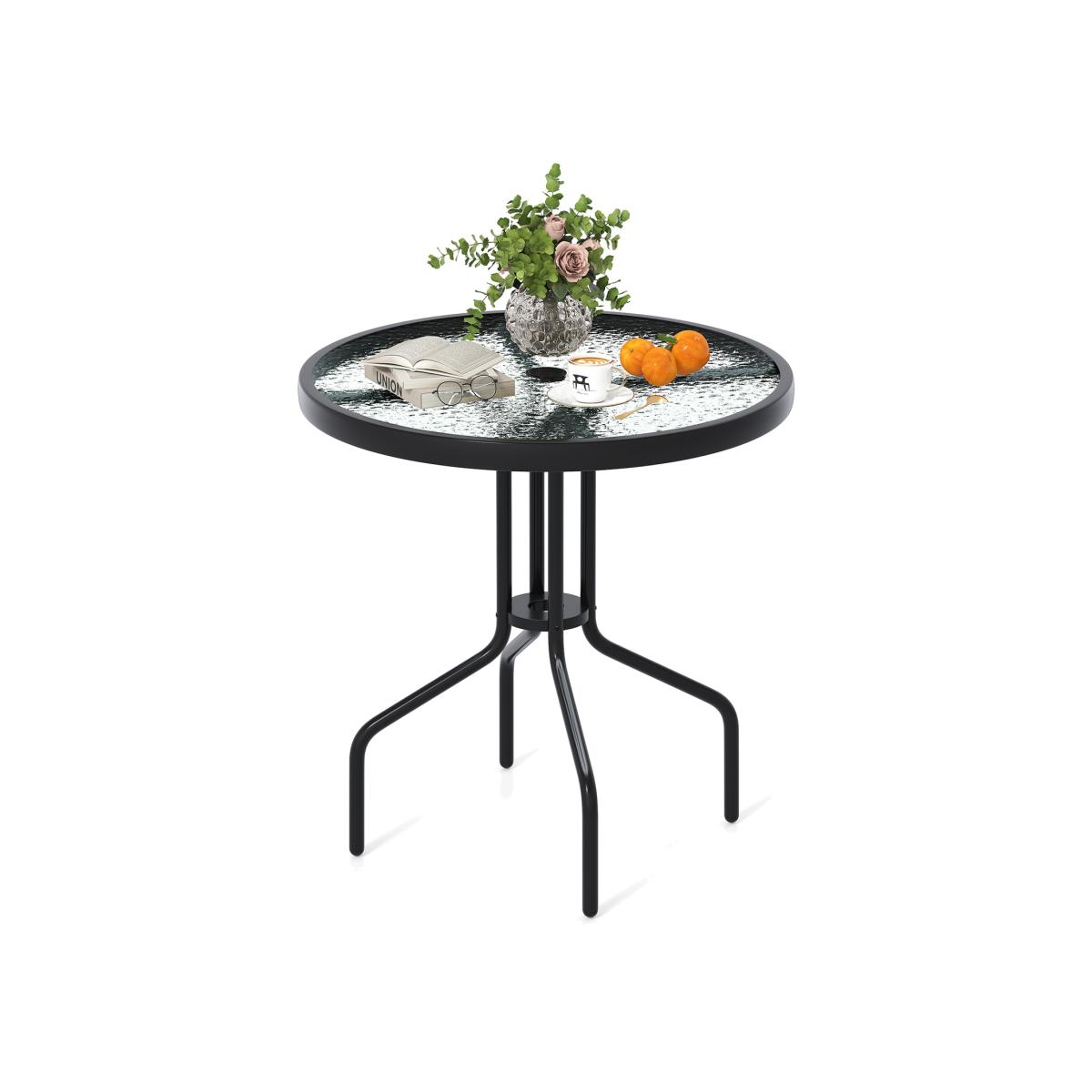 Elevate your outdoor and indoor spaces with this round bistro table, blending functionality with a sleek, modern design. The rippled tempered glass surface makes the dining table an elegant and long-lasting addition for relaxing. A built-in umbrella hole, with additional securing features, offers shaded comfort for sunny days. The robust metal construction ensures stability and durability, while the size of the table makes it perfect for intimate gatherings or quiet meals in small spaces. 70CM Patio Dining Table Bistro Table - Black