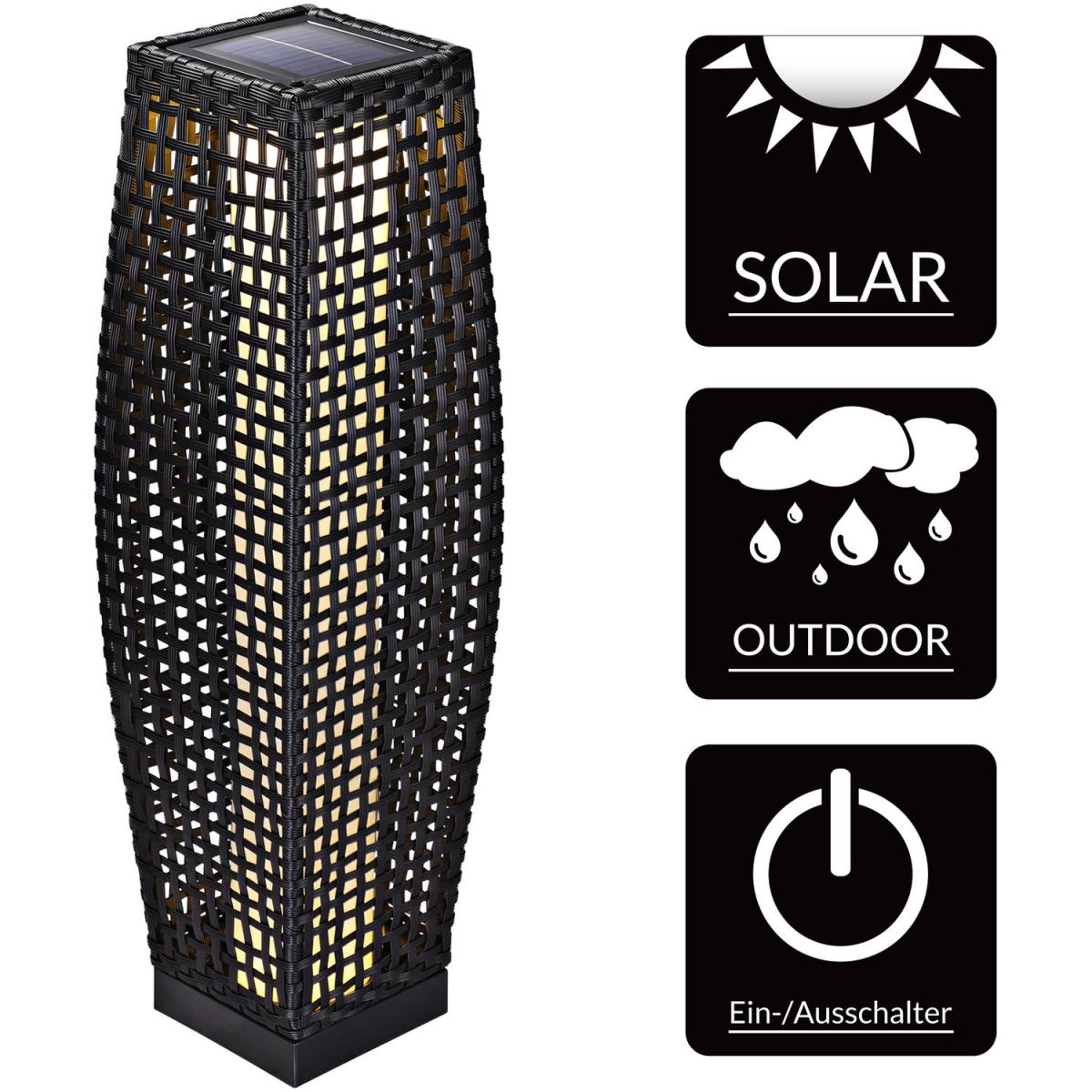 Lovely rattan light for garden and patio. This elegantly designed solar standard lamp fits well in your garden or on your patio. With its splashproof protection type IP44 it's ideally suitable for the outdoor area. Enjoy coming summer nights under the gentle glow of this lovely 25 LEDs rattan light with an integrated solar module. Weather resistant, UV resistant, easy care and very durable poly rattan braiding.