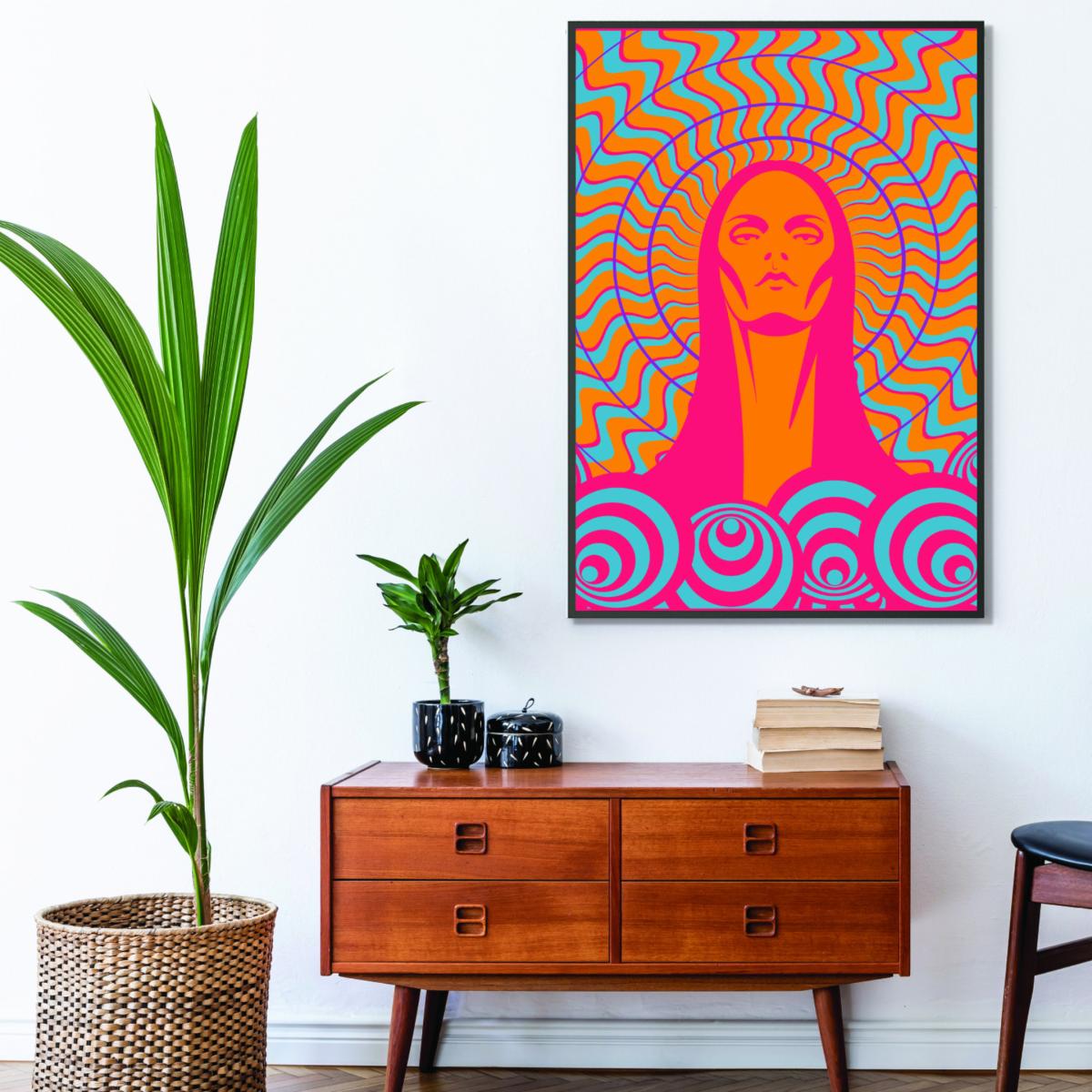 I love the 70’s woman print’s bold, psychedelic colour palette and retro aesthetic, which makes it a striking focal point in any room. It works particularly well in eclectic or bohemian interiors, adding a pop of colour and a vintage vibe. For practical styling, consider pairing it with neutral furnishings to let the artwork stand out, or mix it with other retro or abstract pieces for a curated, layered look. It’s also versatile enough for bedrooms, living rooms, or even a creative workspace - just make sure it has plenty of space around it to really shine.