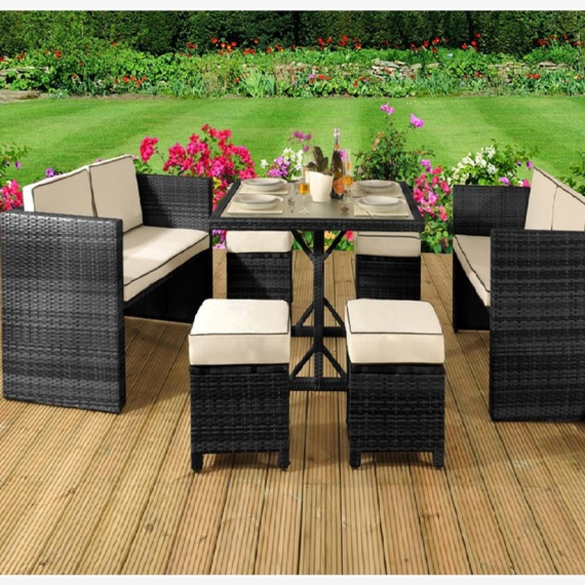 This 7 piece cushioned rattan furniture set that can seat 8 people with its contemporary cube design makes an ideal addition to your patio, garden or conservatory, offering a comfortable summer dining and lounging space for outdoor and indoor use. The seat cushions are cream coloured and designed to resist the elements with showerproof covers that are removable and machine washable. The ottoman footstools neatly store away under the table for a practical, space-saving storage solution when not in use. Made from high-quality poly-rattan material which is UV resistant to prevent colour fading and woven over a sturdy metal frame to provide durability over the years and requires no maintenance. The dining table features a scratch-resistant tempered glass top for safety and resilience.
