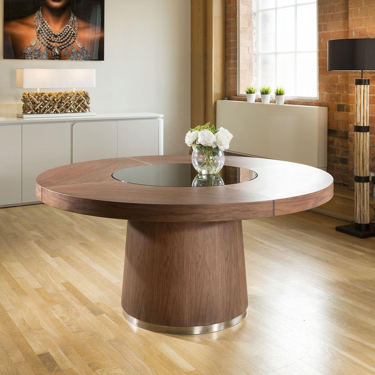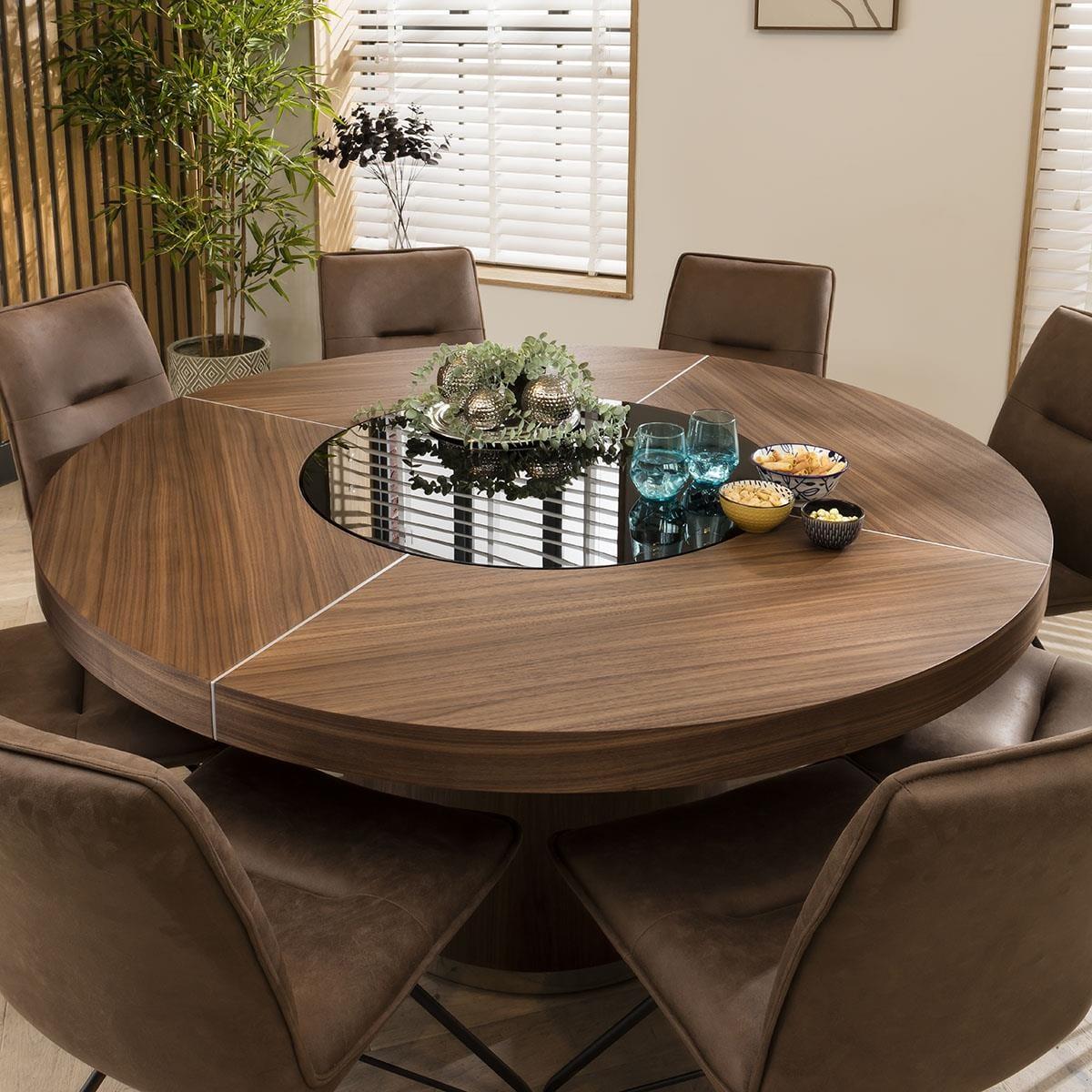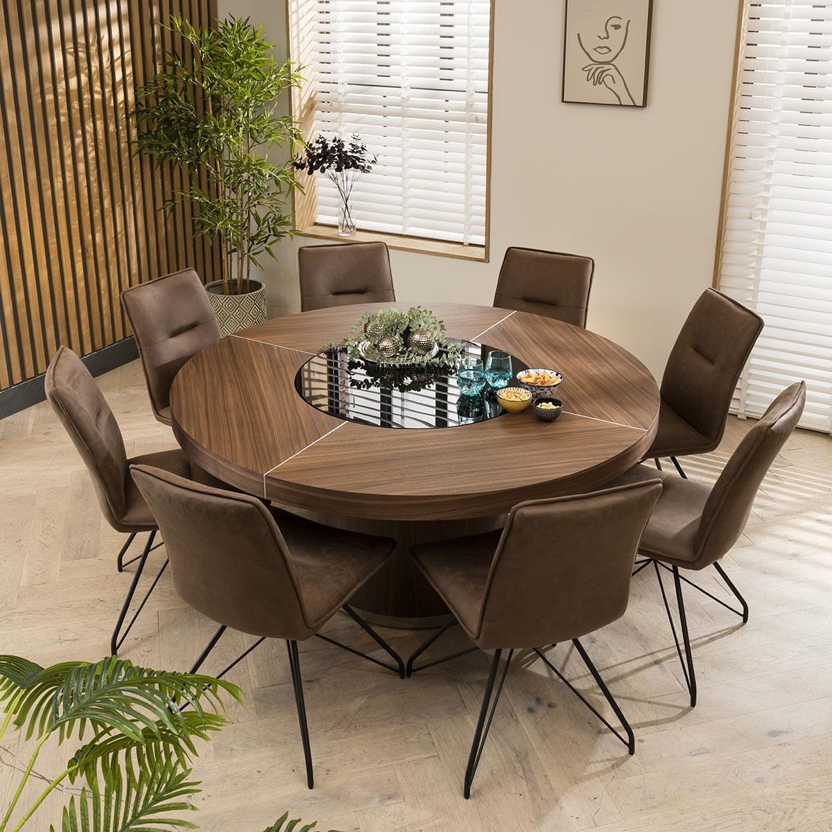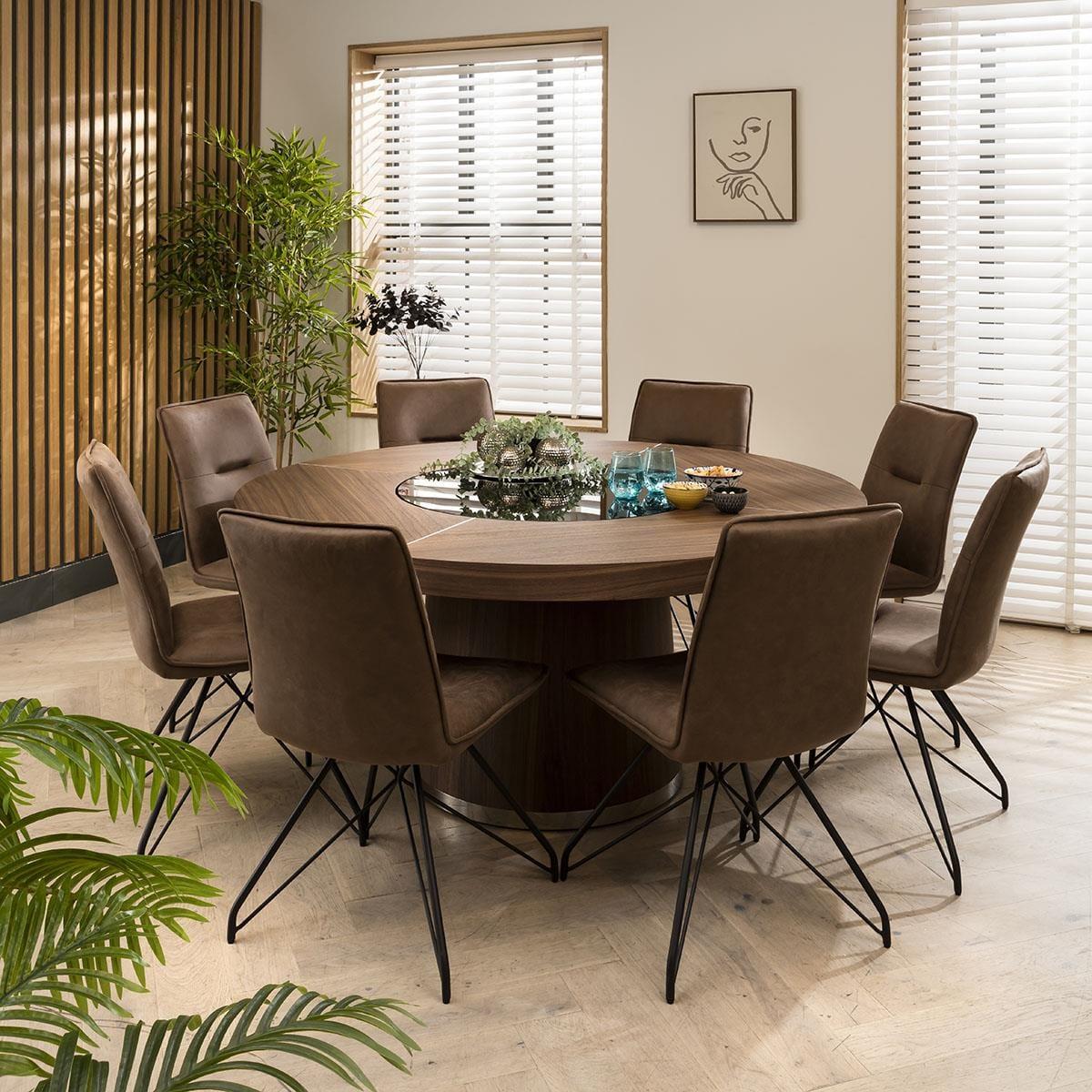 Seamlessly blending the inviting warmth of a walnut wood veneer round dining table, with a rotating glass lazy susan, and the rich sophistication of eight brown chairs upholstered in luxurious leather-look fabric. This 8 seater dining set allows you to experience the perfect harmony of social allure and comfort. This stunning round dining table will effortlessly seat 8 guests. For added convenience, the rotating lazy susan with LED lighting makes for a fun dining experience. Sleek in design, the rich walnut veneer dining table has a round 160cm top supported by a surdy pedestal base that adds stability for years of enjoyment. This set of 8 Detroit dining room chairs in the set are a perfect combination of style and comfort. Crafted with hardwearing brown leather-look fabric upholstery, the kitchen chairs add a touch of industrial-chic to any space. The dining chairs boast clean lines accentuated by simple tufting details bestow a modern edge in kitchen or dining room. This 8 seater dining set combines modern Detroit chairs with the stunning 850. T table. Whether you love the Detroit chairs and would like to purchase them individually, or you think the 850. T table would complete your interior scheme better with another chair, you can easily mix and match our modern dining tables and chairs to curate something truly unique. Table Size W160cm D160cm H73cm Chair Size W64cm D49cm H91cm Dining Table And Chair Set For 8