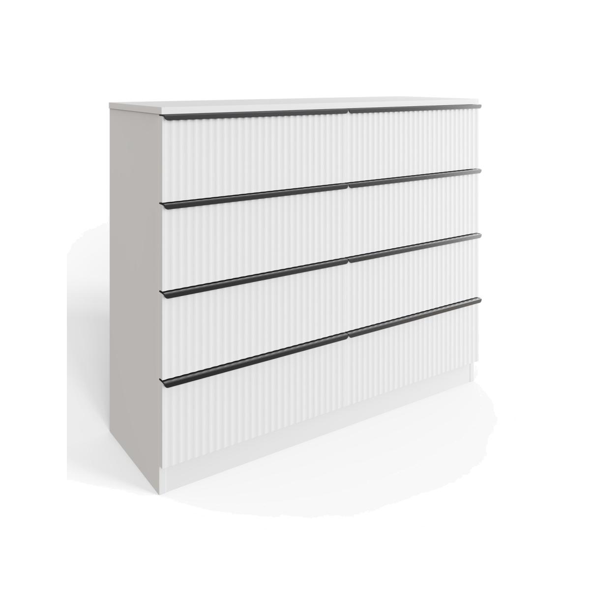 Introducing the White 8 Drawer Chest with a Scalloped Finish, a charming and stylish addition to your bedroom decor. This chest features drawer fronts with an elegant scalloped or ripple effect finish, adding a unique touch that enhances its visual appeal. Equipped with strong black metal pull-style handles, the drawers are designed for easy access and functionality. With side fixed drawer fronts that boast a depth of up to 14cm, these spacious drawers are perfect for storing all your essentials. Crafted from the highest quality materials available, this chest is finished with a robust scratch and UV-resistant melamine coating, ensuring it remains beautiful over time. The elegant matt-white finish complements any decor style, making it a versatile choice for your home.