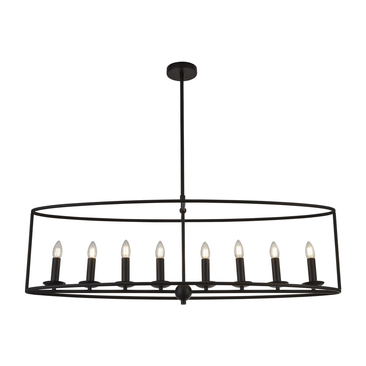 This fitting is a contemporary chandelier featuring a sleek, oval-shaped metal frame finished in matte black. It holds eight evenly spaced candle-style bulbs, offering both aesthetic appeal and ample illumination. Suspended from the ceiling by a single rod, its minimalist design makes it ideal for modern interiors, adding a touch of elegance and symmetry to dining rooms, living spaces, or entryways.