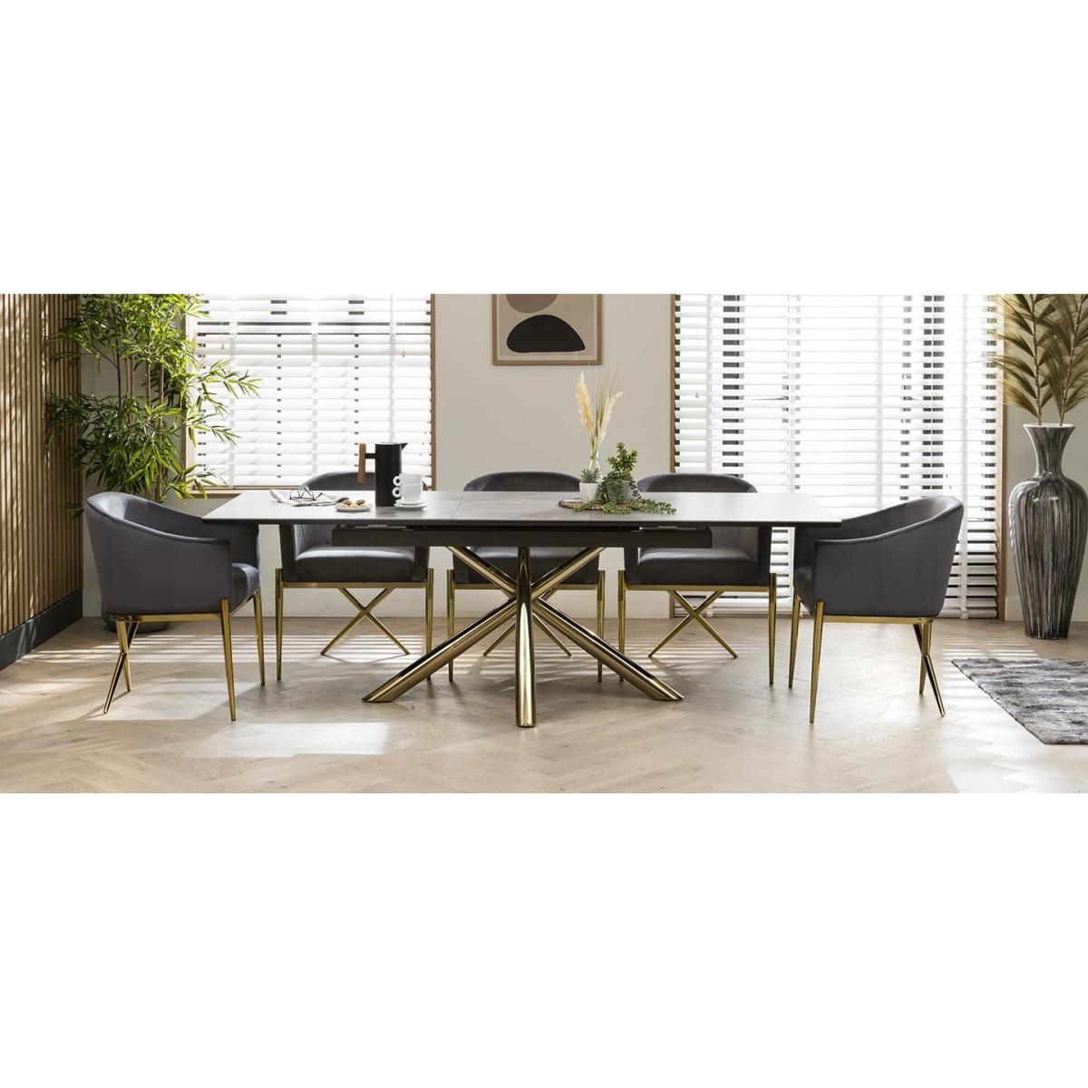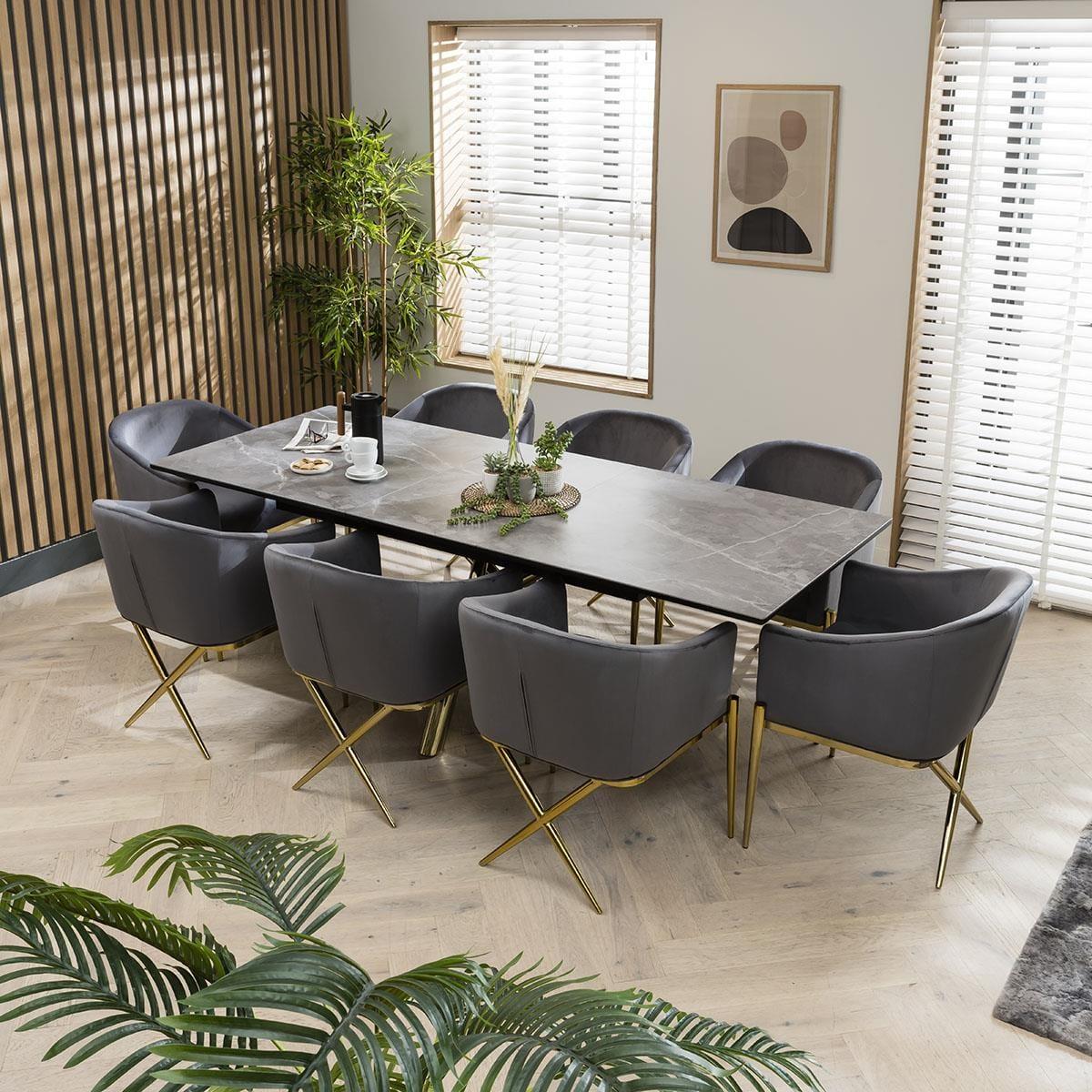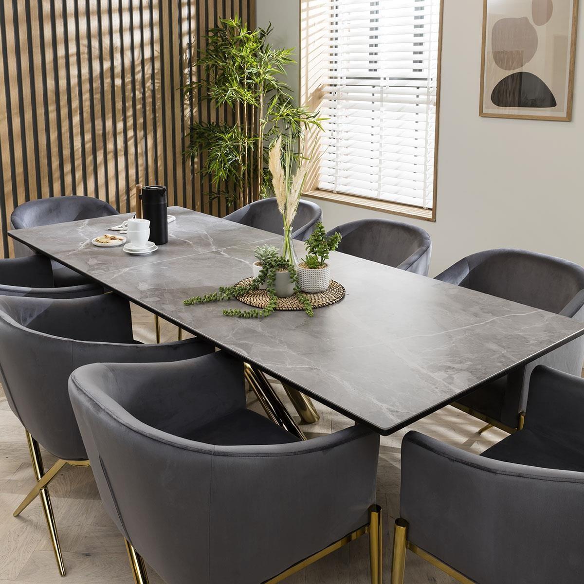 Glamify your space with this extending ceramic marble dining table. Sleek and elegant, the grey ceramic table is complete with gold-toned metal legs in a striking crossed design that supports the rectangular extendable ceramic top. This art deco inspired dining table has a 180cm tabletop that extends to 230cm. The JLA Performance Grey Velvet Carver Dining Chairs in this set introduce luxe elegance to your space. Resting on a golden tubular metal frame, this versatile dining chair has volumes of character and a charming curved shape. Sitting atop of a unique golden base, the chair design wraps around your back with its sweeping silhouette and supportive club chair design. These dining chairs are upholstered in stain-resistant performance velvet upholstery and feature dense foam padding to offer a very comfortable seat. W:180-230cm, D:89cm, H:76.5cm 8 Seater Dining Set Extendable Dining Table with Grey Ceramic Top Includes 8 Luxury Grey Velvet Chairs