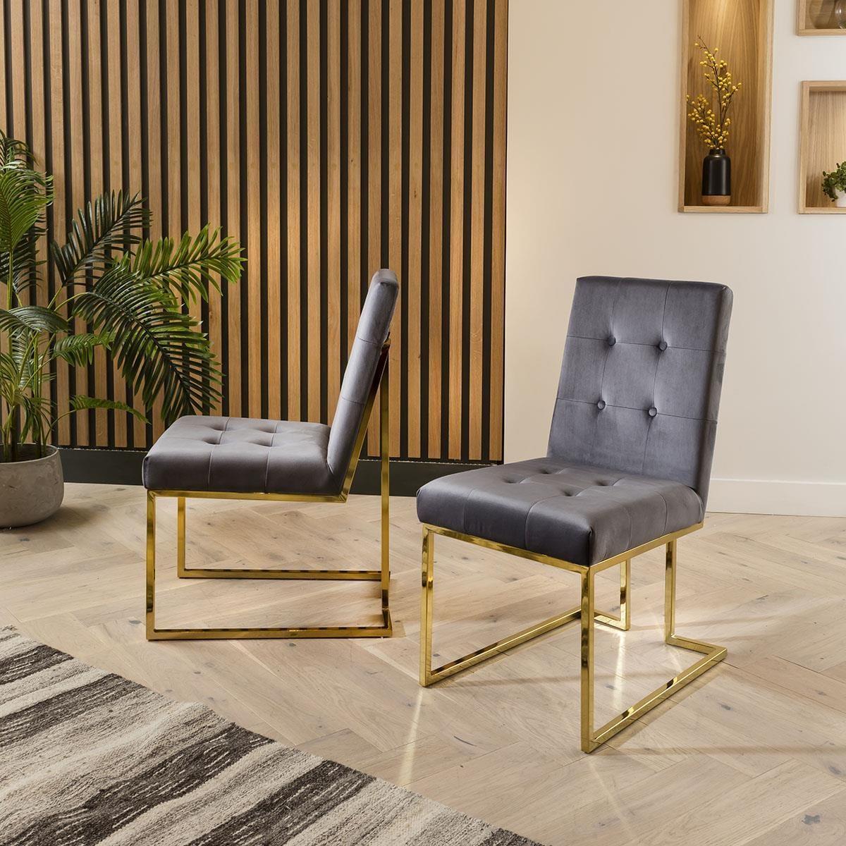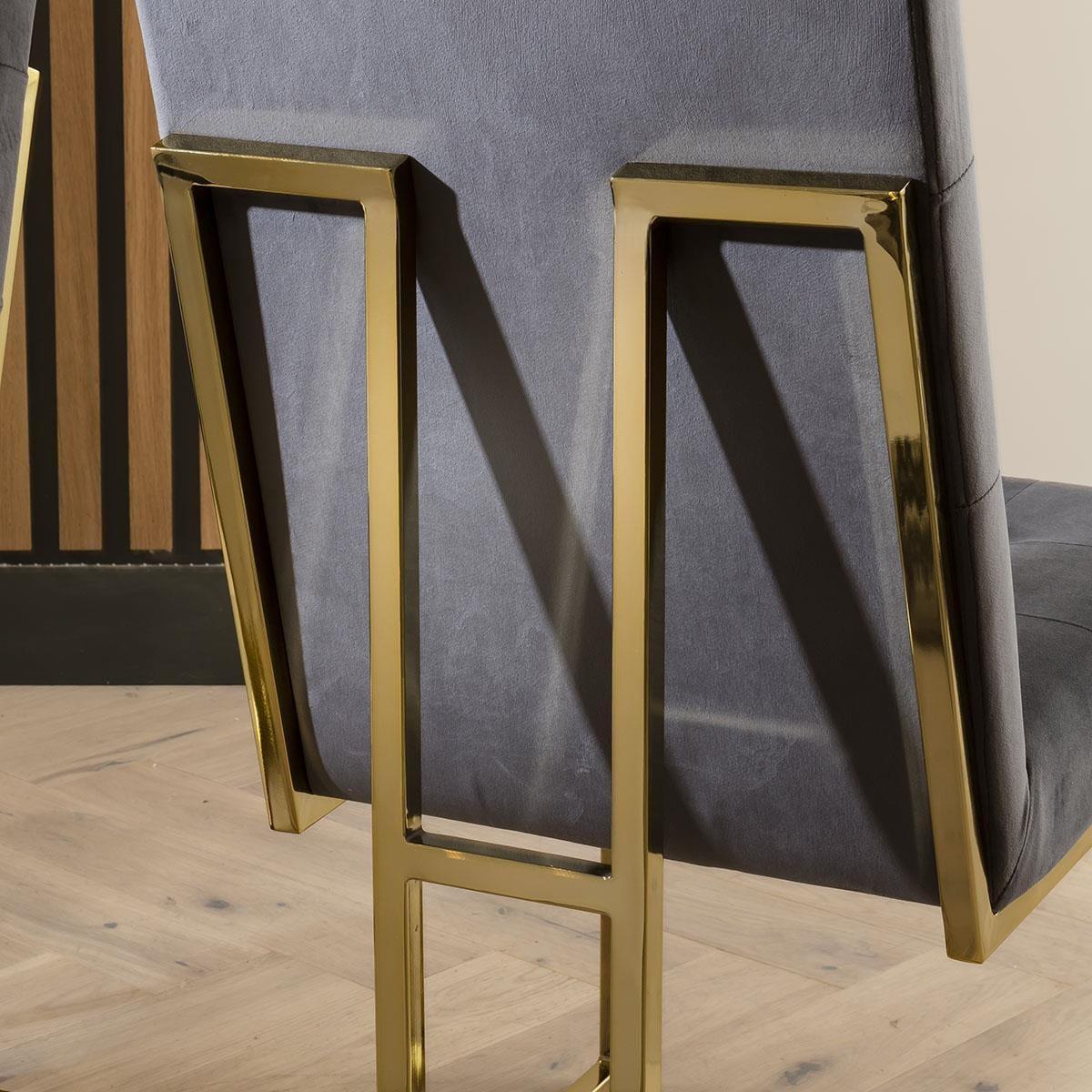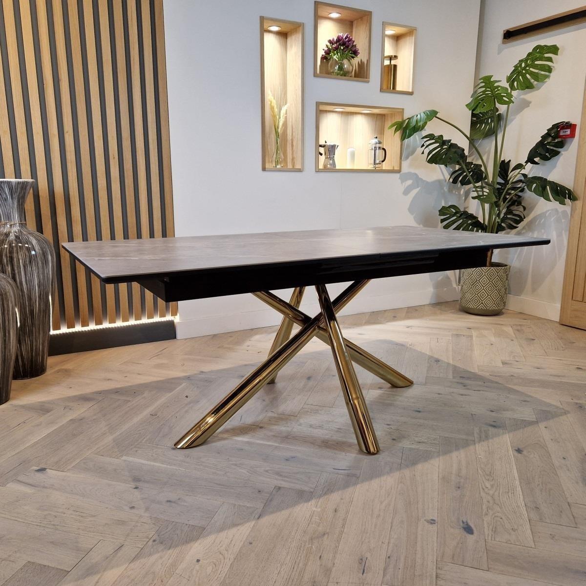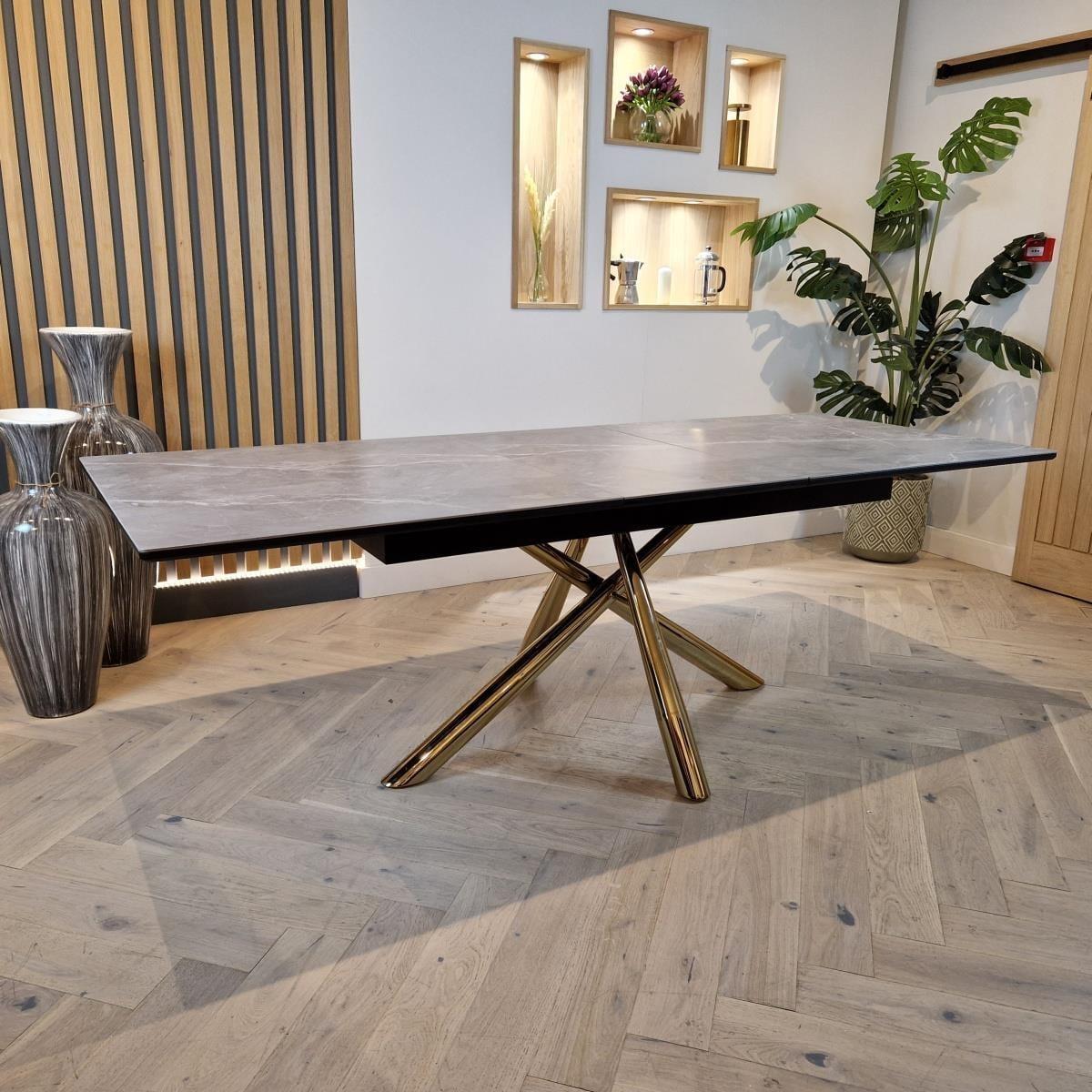 Glamify your space with this extending ceramic marble dining table. Sleek and elegant, the grey ceramic table is complete with gold-toned metal legs in a striking crossed design that supports the rectangular extendable ceramic top. This art deco inspired dining table has a 180cm tabletop that extends to 230cm. The JLA Performance Grey Velvet Carver Dining Chairs in this set introduce luxe elegance to your space. Resting on a golden tubular metal frame, this versatile dining chair has volumes of character and a charming curved shape. Sitting atop of a unique golden base, the chair design wraps around your back with its sweeping silhouette and supportive club chair design. These dining chairs are upholstered in stain-resistant performance velvet upholstery and feature dense foam padding to offer a very comfortable seat. W:180-230cm, D:89cm, H:76.5cm 8 Seater Dining Set Extendable Dining Table with Grey Ceramic Top Includes 8 Luxury Grey Velvet Chairs