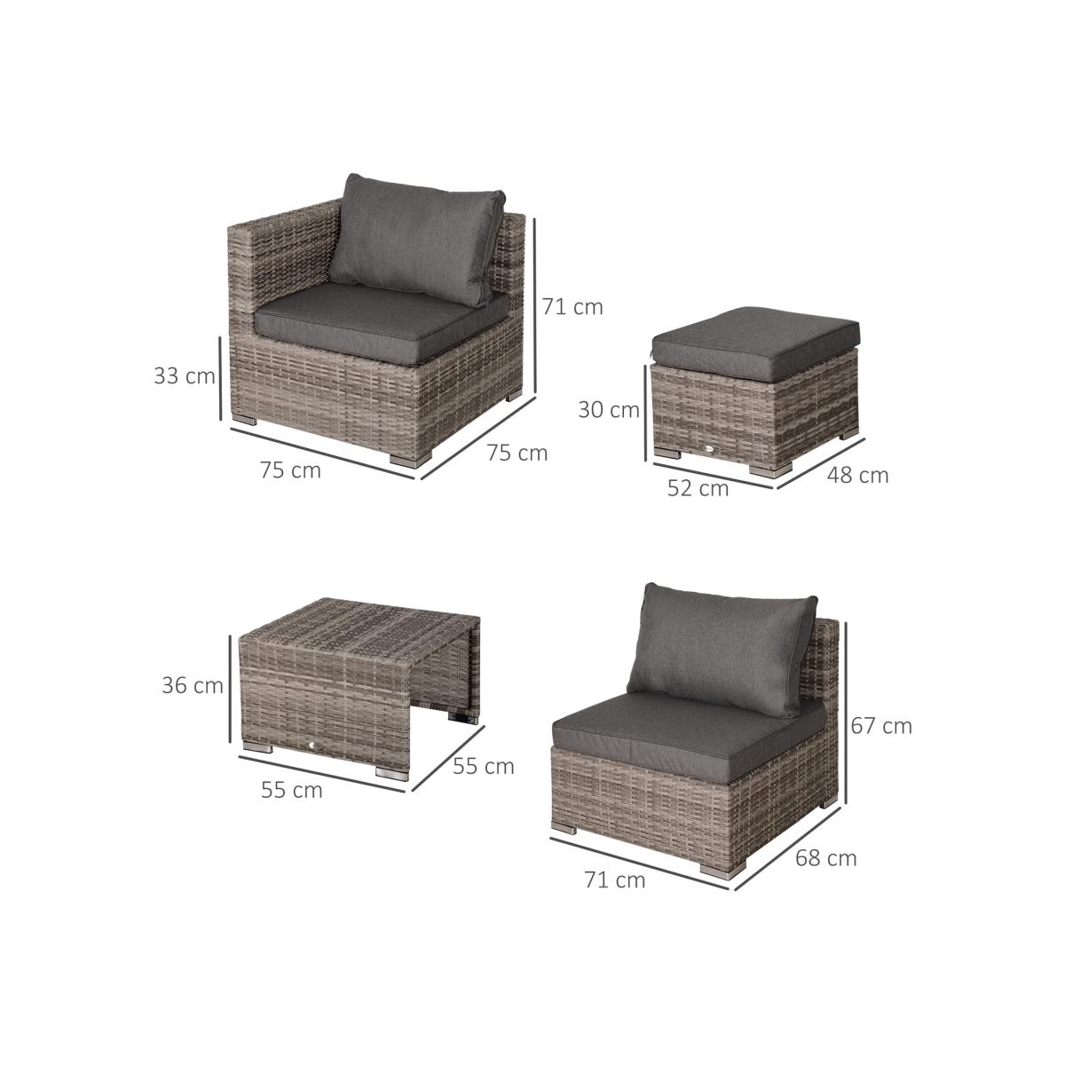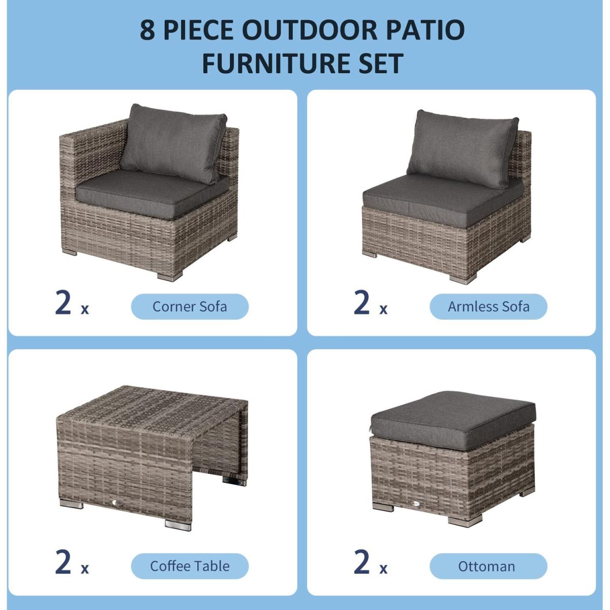 Please Note: We only offer curbside delivery for this item. We cannot deliver this item to your room of choice or to properties above ground level. Take comfort to your garden and beyond with this eight-piece rattan set from Outsunny. Using galvanised steel for the frame to ensure a strong and tough structure, each of the two single chairs, two corner chairs, two stools and two coffee tables are covered with PE wicker for long-tern use outdoors, with pieces but the table featuring heavily padded cushions for you to lounge comfortably. A fantastic blend of style, comfort and craftsmanship.