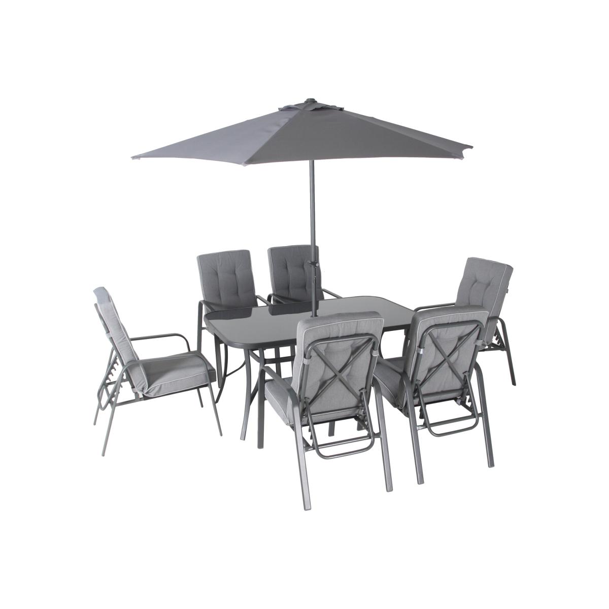 Perfect for al fresco dining, enjoying drinks, or hosting garden parties, this 8 Piece Rowly Dining Set is ideal for any special occasion. The modern, stylish design includes six comfortable chairs made with weather-resistant spun-poly fabric, ensuring your guests can relax and unwind in comfort. The set also has a dark grey parasol to provide ample shade and protection from the sun and elements. Featuring a beautiful glass tabletop, this stunning outdoor dining set will become the centrepiece of your garden, creating a lasting impression.