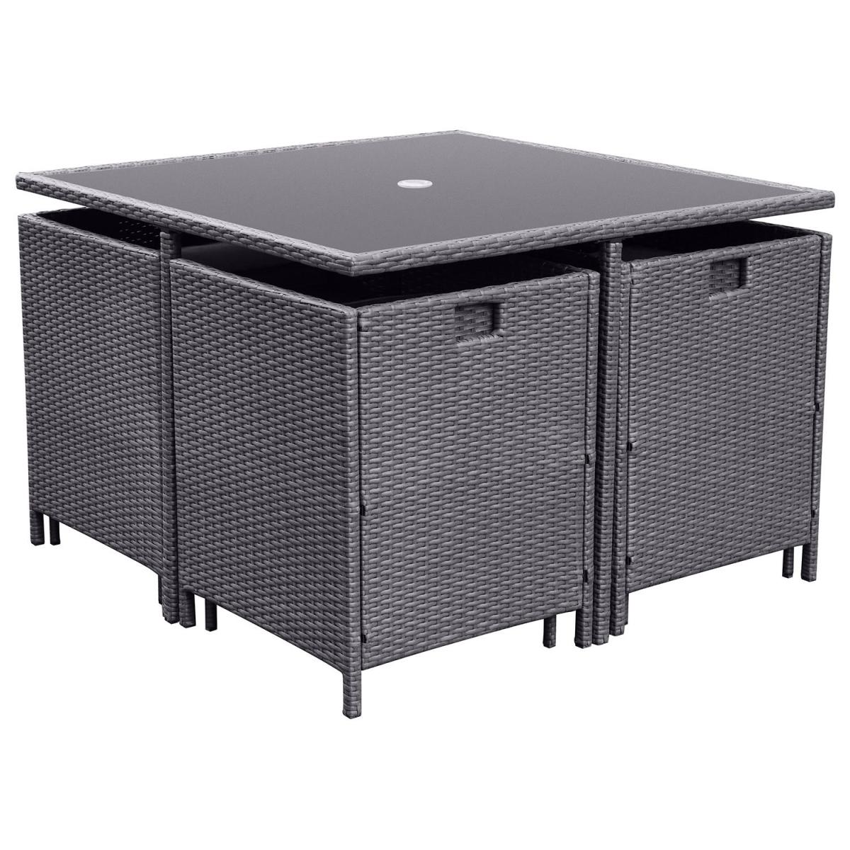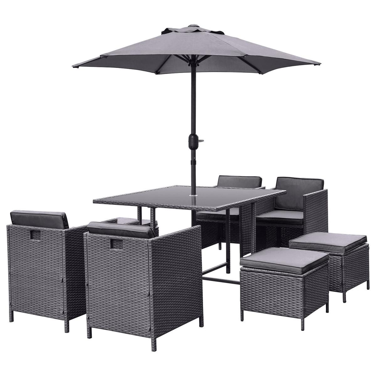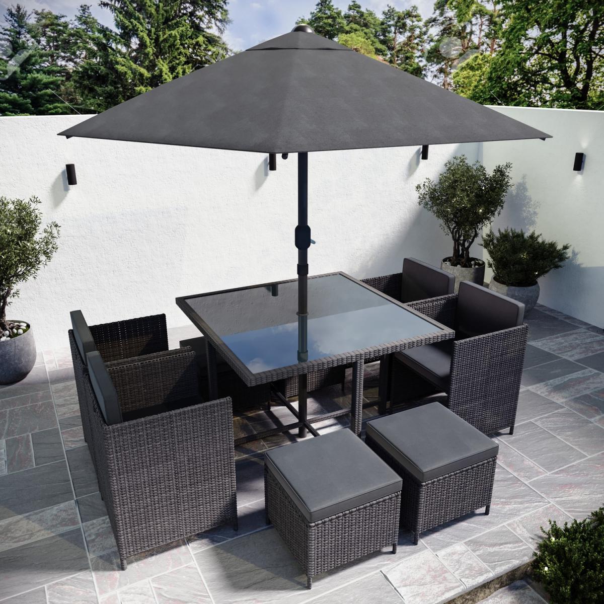When not in use, the chairs and stools tuck neatly under the table for a sleek, compact look. Built to withstand the elements, ensuring year-round durability. Stylish and sturdy, easy cleaning and a secure parasol fit. Plush, removable foam-filled seat and back cushions for added comfort. Provides excellent sun protection and easy adjustment. A strong, stable construction designed for long-term outdoor use. Upgrade your outdoor dining experience with this stylish, compact, 8-seater rattan cube dining set, designed with convenience in mind. The clever cube structure allows you to store the chairs and stools underneath when not in use, saving space and maintaining a tidy outdoor area. Made from high-quality, weather-resistant rattan in a charcoal, contemporary rattan weave, this durable and low-maintenance set is practical, elegant and effortlessly complements any outdoor décor. In addition, the included parasol with crank handle offers shade on sunny days and protection from a light shower and slots easily into the parasol hole in the centre of the table. This garden set is a must-have for any patio, decking, or garden space. Table dimensions:W110 x D110 x H74 cm Each chair dimensions:W53 x D53 x H66 cm Each footstool dimensions: W45 x D45 x H41 cm Parasol dimensions: W200 x D200 x H220cm Max supported weight per seat: 110kg Overall weight: 66.3kg Cushion thickness: 8 Colour: Charcoal Finish:Powder coated, rattan weaving, tempered glass tabletop and upholstery Material: Synthetic flat rattan, powder coated steel (table / chair frames), tempered glass (tabletop), polyester fabric (upholstery / parasol) and foam filled (cushions) Assembly required: Yes Total number of boxes: 5