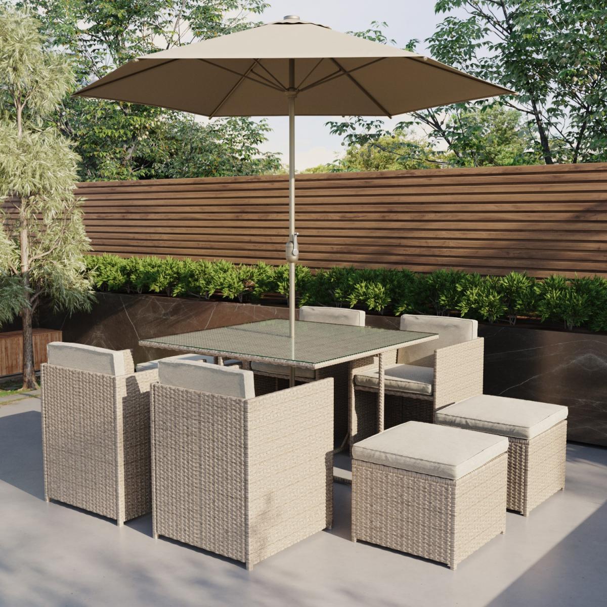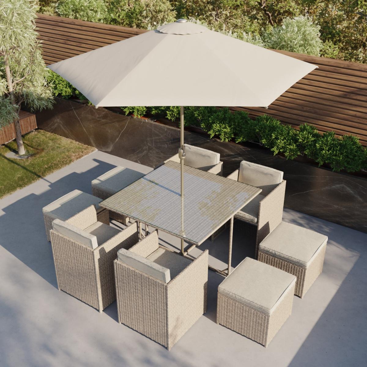 All about me Make the most of your garden with this modern 8-seater dining cube set. It's practical thanks to its compact design; when you're not using, the footstools slide under the seats, and the seats tuck neatly under the table, forming a tidy cuboid shape, saving you on garden space. In addition, it includes a parasol with an easy crank mechanism to protect you from sun and light showers. It slots easily into the parasol hole in the centre of the table, so there's no need to worry about securing a freestanding one. It'll make a fab addition to your garden all year round. Enhance the life of your garden furniture- This product has been designed to be used outdoors. To make the most of your furniture, we recommend that you store it indoors, move it to a sheltered position or protect it by covering it up in bad weather and over the winter period. Why not invest in one of our garden stores? They keep upholstery, such as cushions, dry to prevent mould or mildew from forming. Need to know Table dimensions: W115 x D115 x H74 cm Each chair dimensions: W56 x D56 x H68 cm Each footstool dimensions:W49 x D49 x H36 cm Max supported weight per seat: 120kg Overall weight: 75.7kg Seats: 8 Tabletop thickness: 5mm Cushion thickness: 5cm Colour: Natural and cream (upholstery) Finish: Rattan & upholstery Material: Synthetic woven rattan, powder-coated steel (frames), polyester fabric (upholstery), foam fill (cushions) and tempered glass (tabletop) For use: Indoors & outdoors (suitable for wooden floors) Assembly required:Yes Total number of boxes: 3 What's included? 1 x Table 4 x Chairs 2 x Footstools 8 x Seat cushions 4 x Back cushions 1 x Parasol 1 x Parasol cover