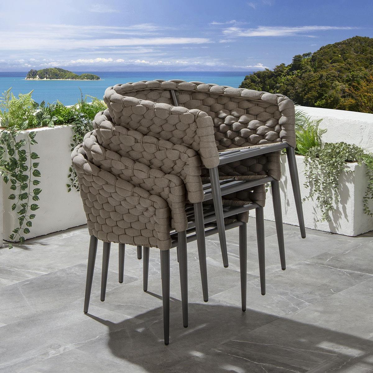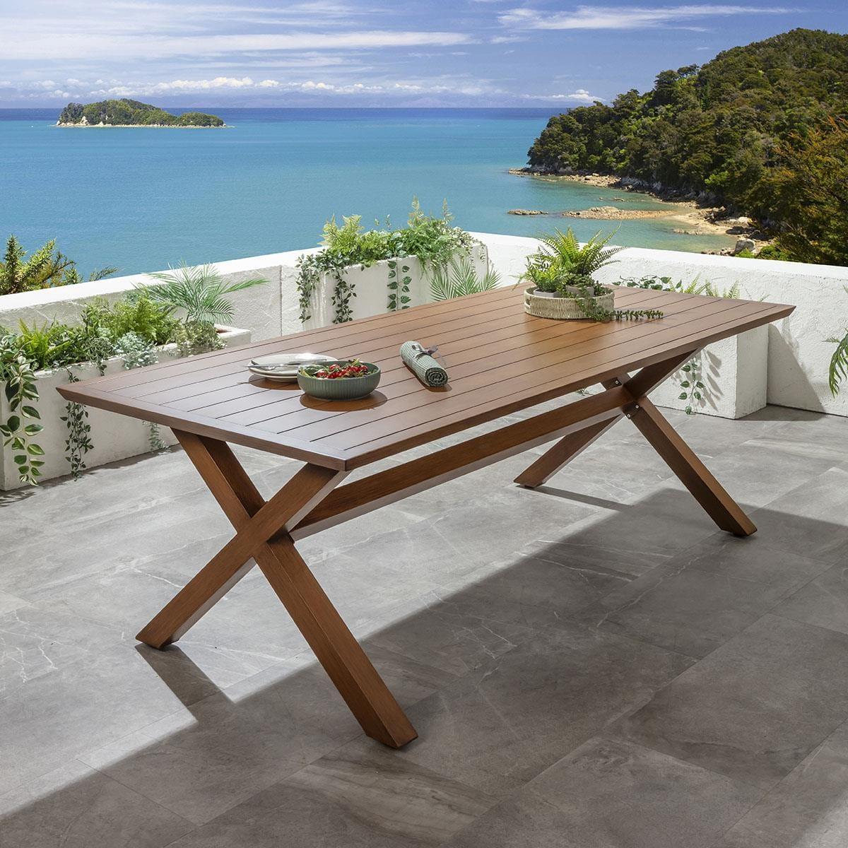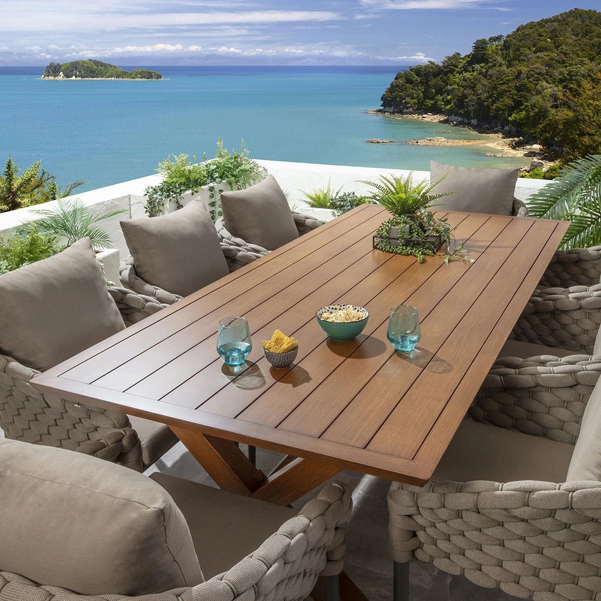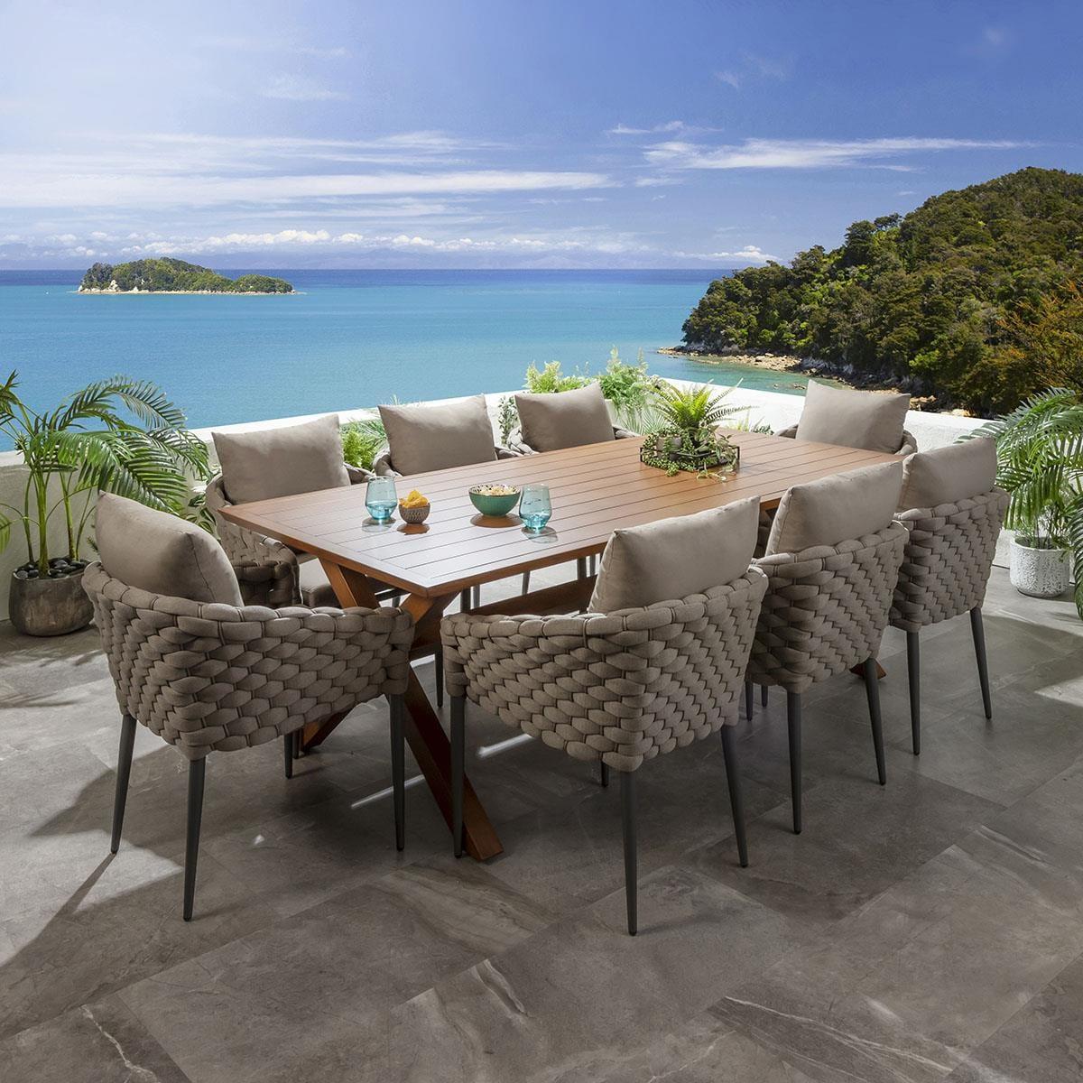 This 8 seater garden dining table and chairs set includes a farmhouse-inspired dining table, featuring an oak finish and X-legs, crafted from full aluminium, with luxury aluminium garden dining chairs in an elegant beige and the signature thick rope weave. This outdoor dining set is crafted for durability and comfort. The Star 220cm modern garden dining table boasts a farmhouse-inspired design, featuring a rustic oak wood effect finish, and distinctive Cross X-leg design. Crafted from full aluminium, this weatherproof 8-seater outdoor table is designed to withstand the elements, allowing you to leave it uncovered year-round. The 8 garden dining chairs feature sleek charcoal aluminum frames, is complemented by the Sundowner signature thick rope weave in beige, creating a contemporary look for your patio. These outdoor chairs promise luxury comfort, with a seat pad and back cushion upholstered in coffee beige fabric. This 8 seater dining set combines modern Sundowner chairs with the stunning Star table. Whether you love the Sundowner chairs and would like to purchase them individually, or you think the Star table would complete your outdoor dining space better with another chair, you can easily mix and match our garden tables and chairs to curate something truly unique. Table Size W220cm D93cm H76cm Chair Size W61cm D62cm H74cm Modern Garden Dining Set for 8