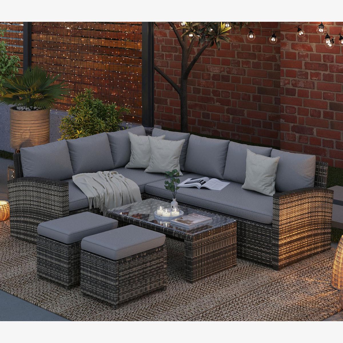 Transform your garden, patio, or terrace into a luxurious retreat with our 8 Seater Outdoor Grey Rattan Corner Sofa Set, accompanied by a stylish coffee table. Designed with elegance and comfort in mind, this exquisite set is the ideal addition to any outdoor space, promising unparalleled relaxation and a chic aesthetic touch. The PE rattan is weather-resistant, maintaining its elegant grey hue and structural integrity through various weather conditions. Experience ultimate comfort thanks to the ergonomically designed curved back of the sofa. The meticulous attention to detail ensures that your outdoor furniture not only looks beautiful but stands the test of time.