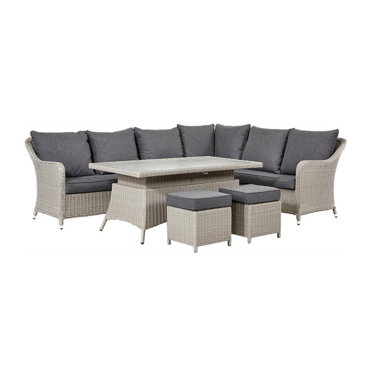 The Antigua Corner Set combines beautiful, elegant design within a set that offers you ultimate practicality and can be displayed with either a long left or right arm. This Antigua relaxed dining outdoor furniture set comprises of an adjustable table, 1 left arm sofa, 1 right arm sofa, 1 corner section, 1 armless section and 2 footstools. The set is crafted from a synthetic half round rattan weave ensuring a modern look, and durable weather resistant finish. This outdoor corner set also features a powder-coated aluminium frame, which ensures its high-quality and robustness. The stylish, adjustable table is topped with premium ceramic for a heavy duty, quality finish. The adjustable table can be used as either a low coffee table or higher relaxed dining table by using the simple discrete gas pump mechanism, making this table hassle-free to adjust. The season proof, fire retardant cushions are water repellent, allowing the water to run off the cushion. In the rare event that any moisture does penetrate the outer fabric there is a ventilation section in each cushion which allows it disperse. We suggest using a cover to protect your set while not in use to maintain its quality