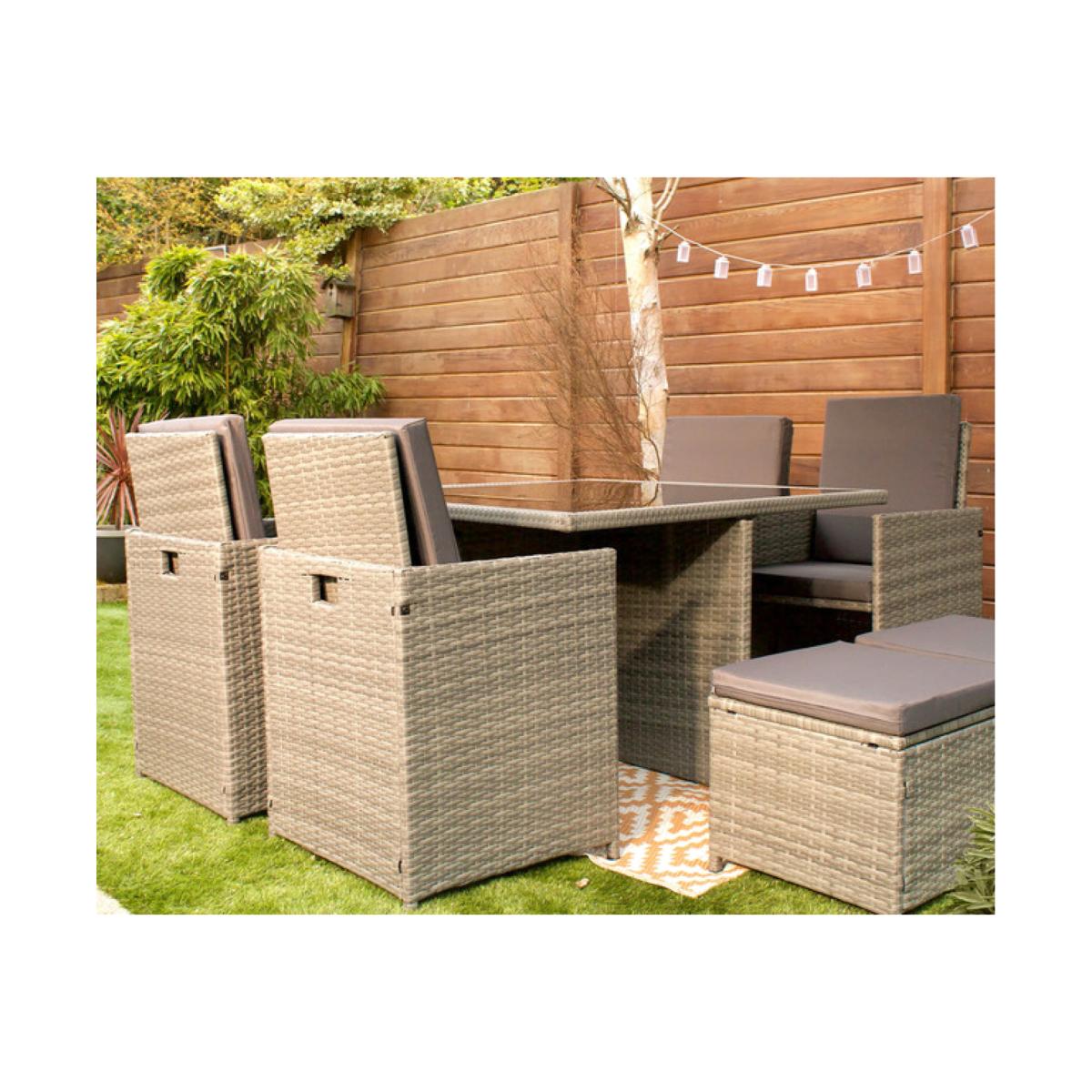 This set is comprised of four high-back armchairs, four stools, and a black tempered toughened glass-topped table. Made from a UV-treated and weather-resistant rattan weave with cushions with removable and machine-washable covers. The stools and chairs have fold-down backs that allows them to fit neatly underneath the table to easily store them away and maximise your space when the table is not in use. Assembly time is approximately 90 minutes. 8-Seater Rattan Cube Garden Furniture Dining Set - Grey