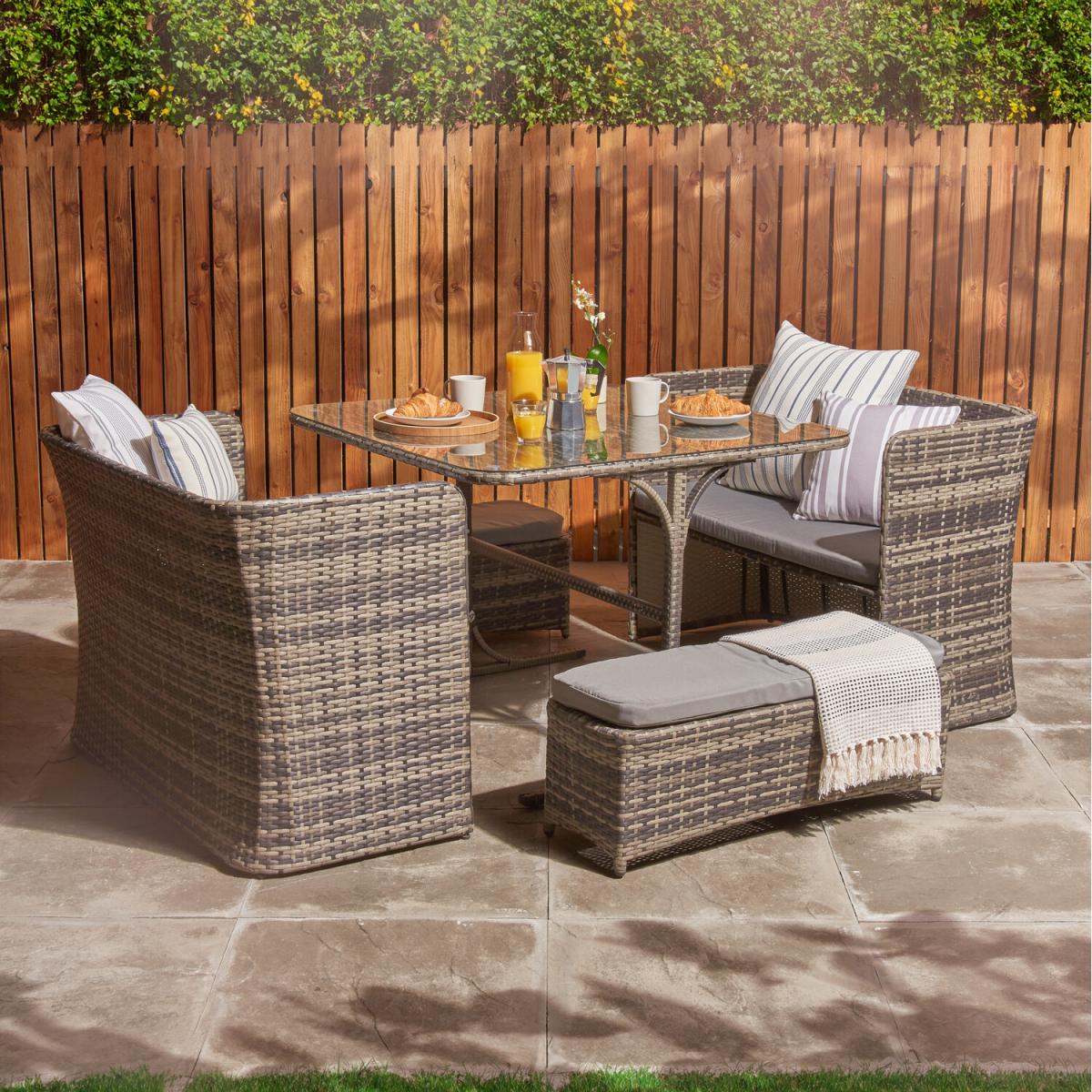 Drink and dine outdoors with friends & family, seat up to 8 people in style. Relax in Style - Make the most of your outdoor space and create a compact, comfy space to enjoy sunny days in the great outdoors. A perfect addition to any patio, garden, lawn area conservatory or courtyard to area eat outdoors. Extra plush 8cm thick cushions in ashen grey, easy clean zip cushions that are padded & damp resistant. Rattan furniture set has an extra supportive backrest, cushions & armrests. Small footprint when not in use, benches & chairs slot under table for easy storage and made from strong aluminium that's rust proof, corrosion proof & UV resistant. Maintenance-free garden furniture set made from thick 8mm polyester rattan weave designed to last for years to come. Scratch-proof, heat-proof 5mm tempered safety glass-topped table. Quick & easy partial assembly with all tools & instructions included. Easily wipe clean & removable cushion covers keeps the furniture looking the best all year round.