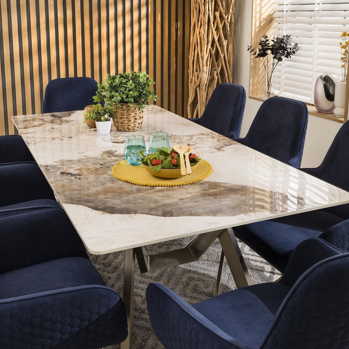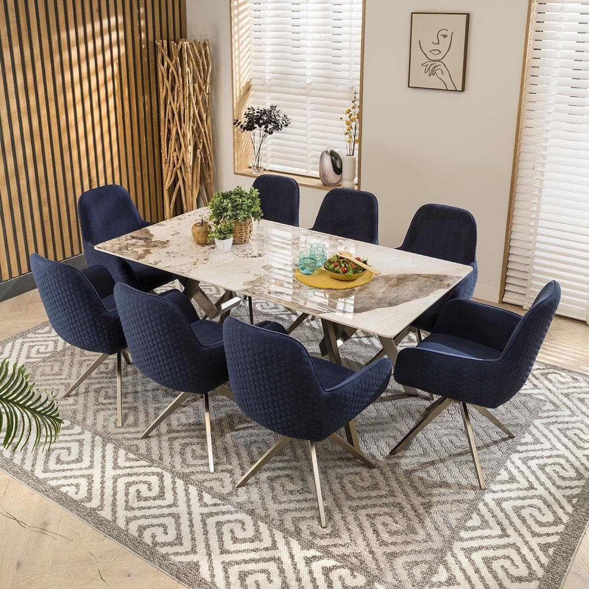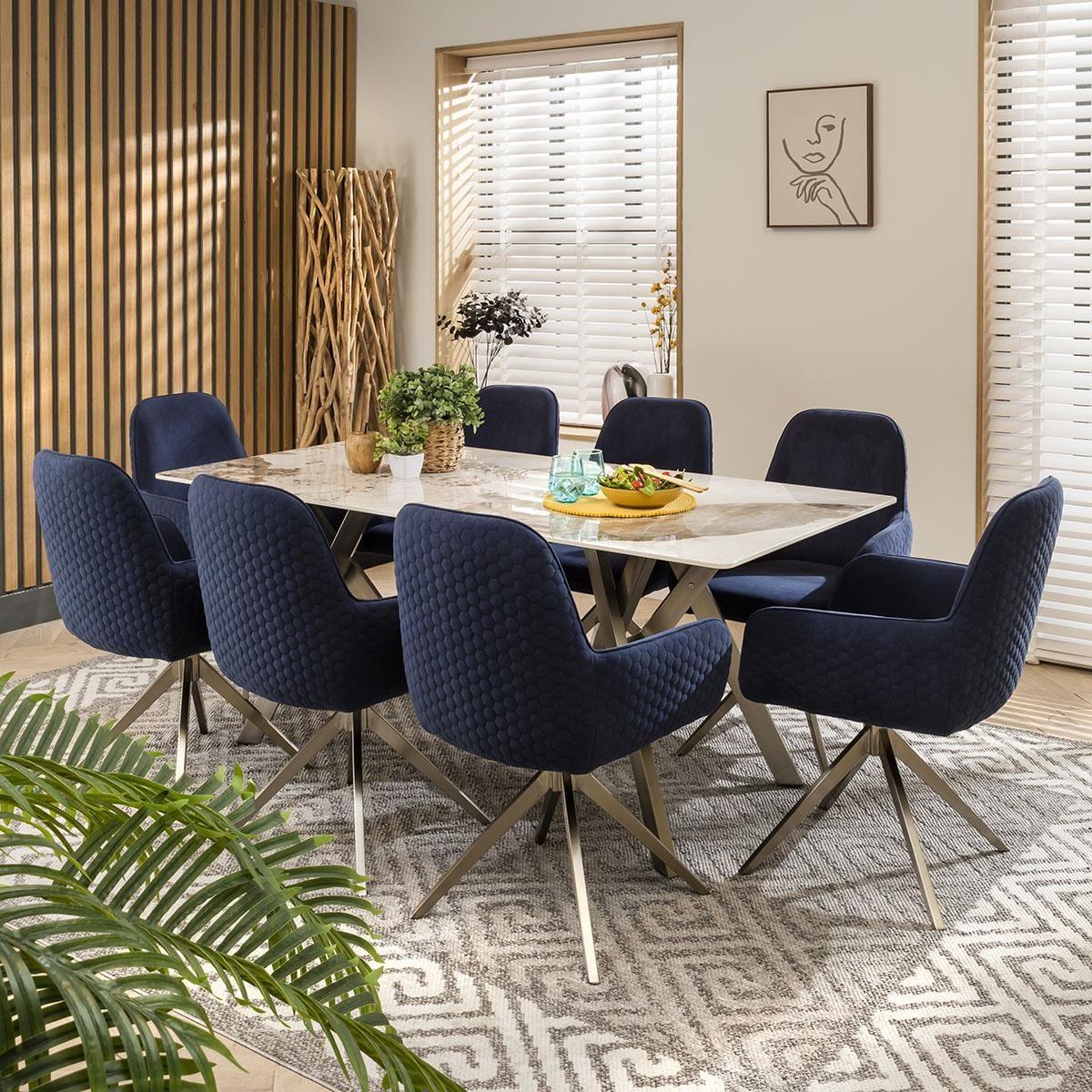 Experience the allure of cutting-edge design meeting opulent charm in our modern dining ensemble. Centred around the Aldgate white ceramic marble dining table are eight of our Emma dining chairs, upholstered in a rich navy blue velvet fabric. Transform your kitchen or dining space with this modern 8 seat dining set. Our ultra-modern, ultra-luxurious Aldgate marble-effect dining table has a high-quality white ceramic top that is scratch, stain and heat resistant. The brushed stainless steel legs have an edgy design, perfect for any contemporary kitchen or dining space. This 180cm dining room table will comfortably accommodate the 8 chairs in this set. Crafted with a simple yet thoughtful outline, the Emma carver dining chairs with arms are designed for comfortable dining. Upholstered in navy velvet that adds a touch of opulence to any setting. The dining room chair features a swivel base with a brushed metal finish for a blend of modern aesthetics and plush comfort. This 8 seater dining set combines modern Emma chairs with the stunning Aldgate table. Whether you love the Emma chairs and would like to purchase them individually, or you think the Aldgate table would complete your interior scheme better with another chair, you can easily mix and match our modern dining tables and chairs to curate something truly unique. Table Size W180cm D90cm H76cm Chair Size W62cm D62cm H87cm Dining Table And Chair Set For 8