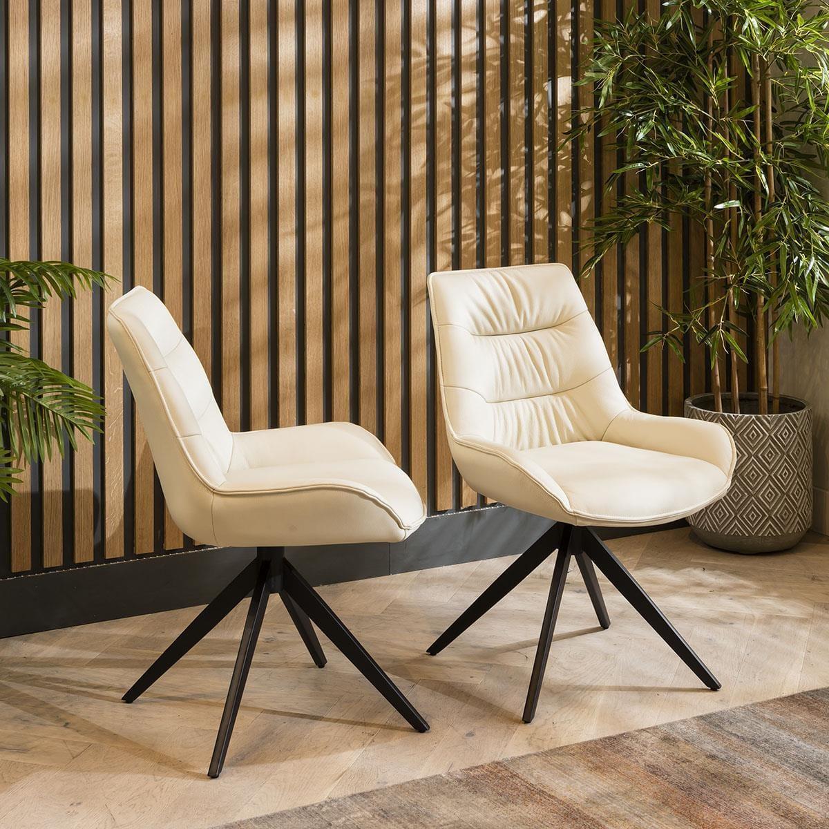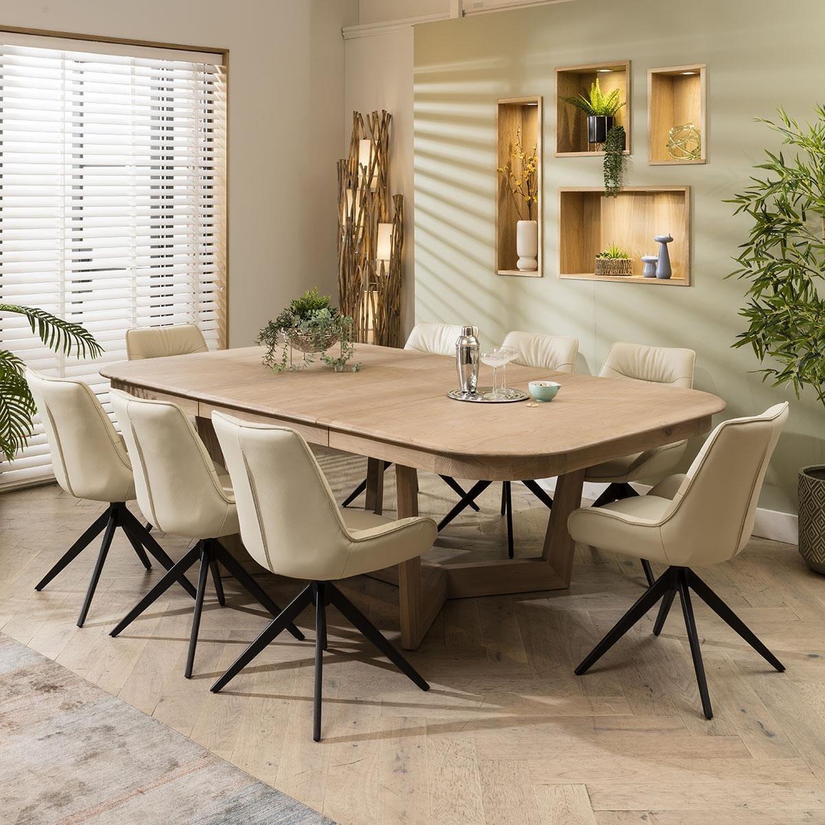 Experience designer luxury with our Nora modern 8 chair dining set. Crafted with a stunning wooden extendable dining table in a natural finish, this set includes eight chairs upholstered in soft genuine cream leather. Perfect for gatherings, the modern dining room chairs feature metal swivel bases for added conveniece. This dining set for 8 includes the Scorpio Extendable Wooden Dining Table with its blend of modern design and rustic farmhouse charm. Crafted from premium ash wood, this kitchen table boasts a natural finish that showcases its timeless appeal. The 8 seater dining room table includes a drop-in leaf, expanding the length from 160cm to a generous 230cm. Elegance with comfort is effortlessly blended with the 8 Nora leather dining chairs in this set, crafted with genuine cream leather. These cushioned dining room chairs feature a sleek 4-point swivel base that ensures stability and ease of movement, making the chairs a perfect addition to any contemporary kitchen or dining space. This 8 seater dining set combines modern Nora chairs with the stunning Scorpio table. Whether you love the Nora chairs and would like to purchase them individually, or you think the Scorpio table would complete your interior scheme better with another chair, you can easily mix and match our modern dining tables and chairs to curate something truly unique. Table Size W160-230cm D140cm H76cm Chair Size W58cm D64cm H85cm Dining Table And Chair Set For 8