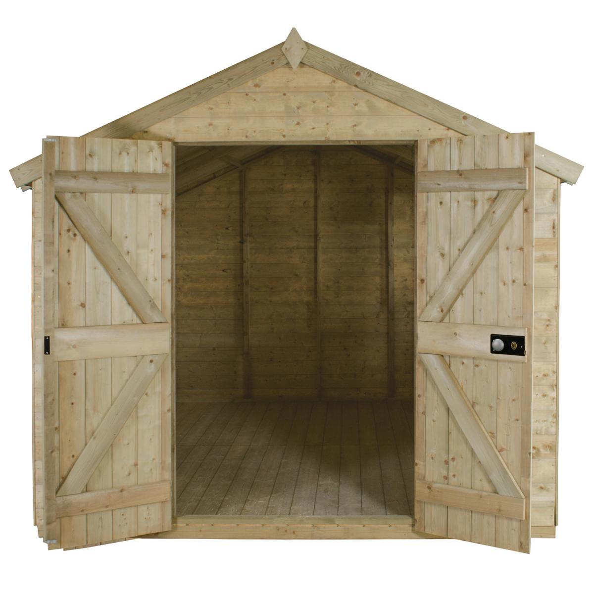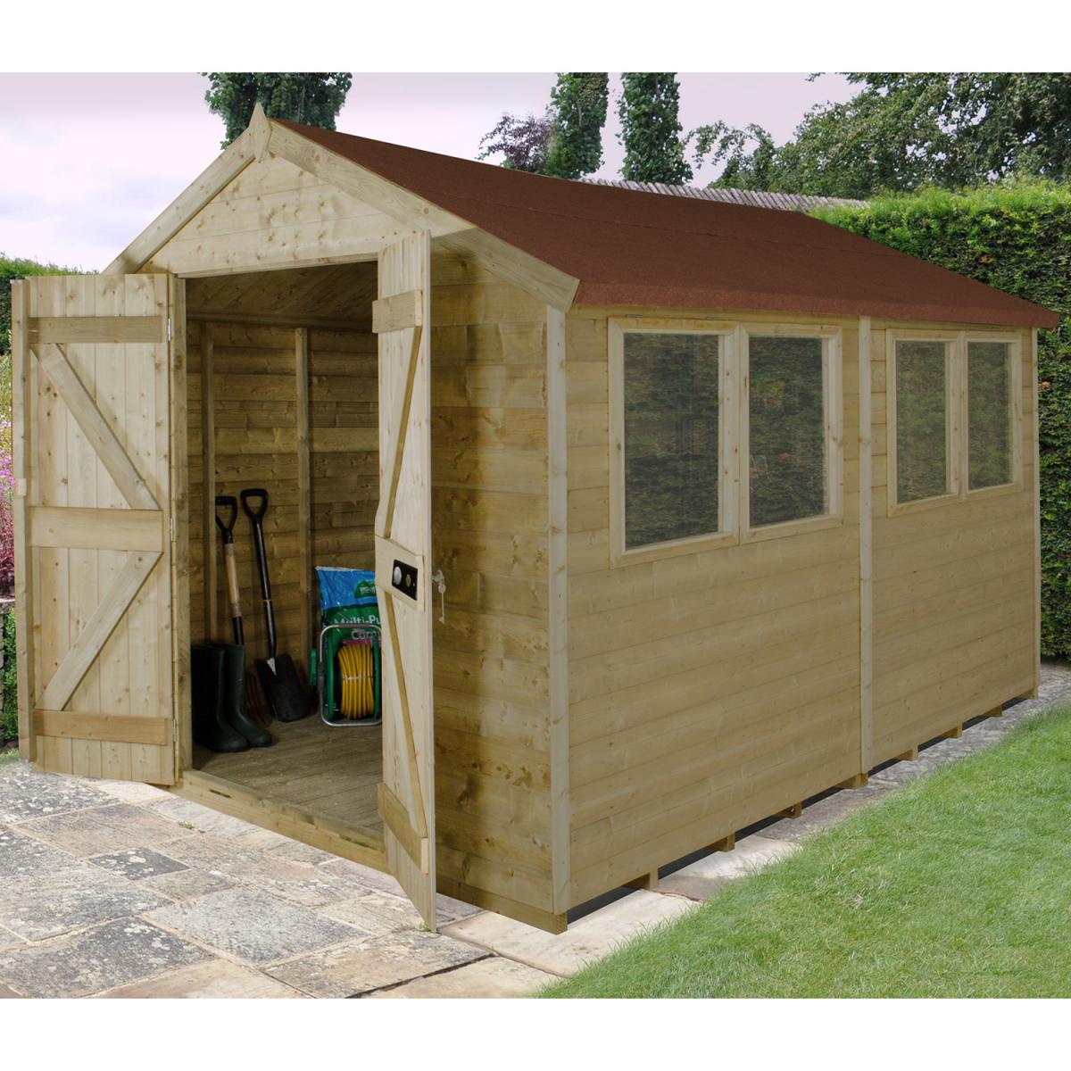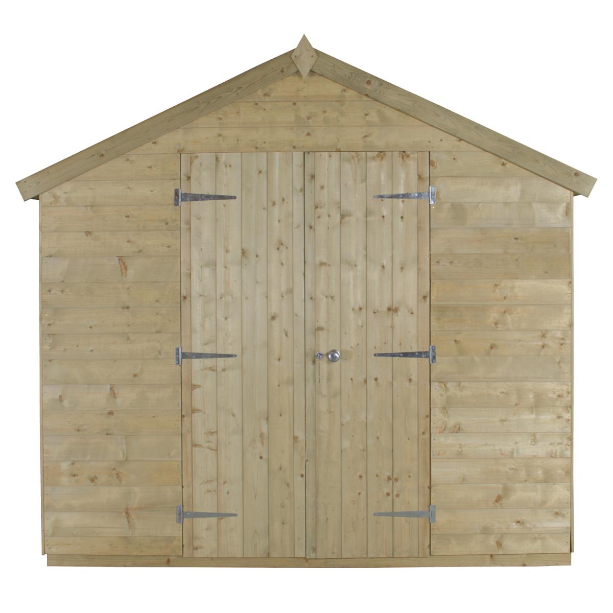 Whether wanting to create your own workshop or simply looking for some extra outdoor storage space, this Tongue and Groove Pressure Treated Double Door Apex Shed Frame will be a great addition to your garden. This premium quality shed has a sturdy and smart tongue and groove construction throughout, including the robust floor and roof. The roof also features a high quality red mineral felt for extra protection from the elements. The strong, fully braced door is fitted with rim-lock fastening for added security, while opening acrylic windows with quality stainless steel catches can provide ventilation if required. The shed has been pressure treated to eliminate the need for annual re-treatment and is guaranteed against rot for 15 years, so you can enjoy this excellent shed year after year.