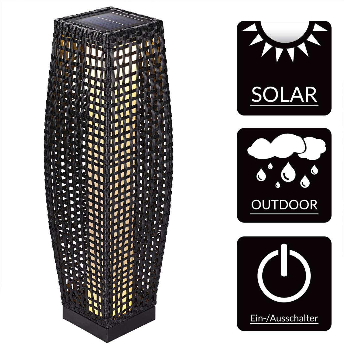 This elegantly designed solar standard lamp fits well in your garden or on your patio. With its splashproof protection type IP44 it's ideally suitable for the outdoor area. Enjoy coming summer nights under the gentle glow of this lovely 25 LEDs rattan light with integrated solar module. Weather resistant, UV resistant, easy care and very durable poly rattan braiding.