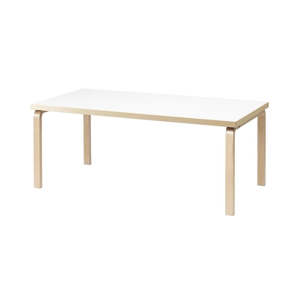 Originally designed by Alvar Aalto in 1935 for Artek, the birch Dining Table 83 is a timeless design that would complement any dining area. Marrying beauty with exceptional craftmanship, the table is crafted in Finland from solid Finnish birch wood. Available with a natural birch veneer, black linoleum or white laminate table top, the elegant table top rests on Aalto's signature L-legs. Created by bending a piece of birch to a curved 90° angle, the L-leg can be fastened directly to the table top, eliminating the need for complicated framework or support and creating Aalto's signature streamlined and simple aesthetic. Alvar Aalto was one of the founding members of Finnish manufacturer, Artek, and embraced strong individuality with focus on designing predominantly for humanity, creating functional and dynamic pieces for public and personal spaces alike.
