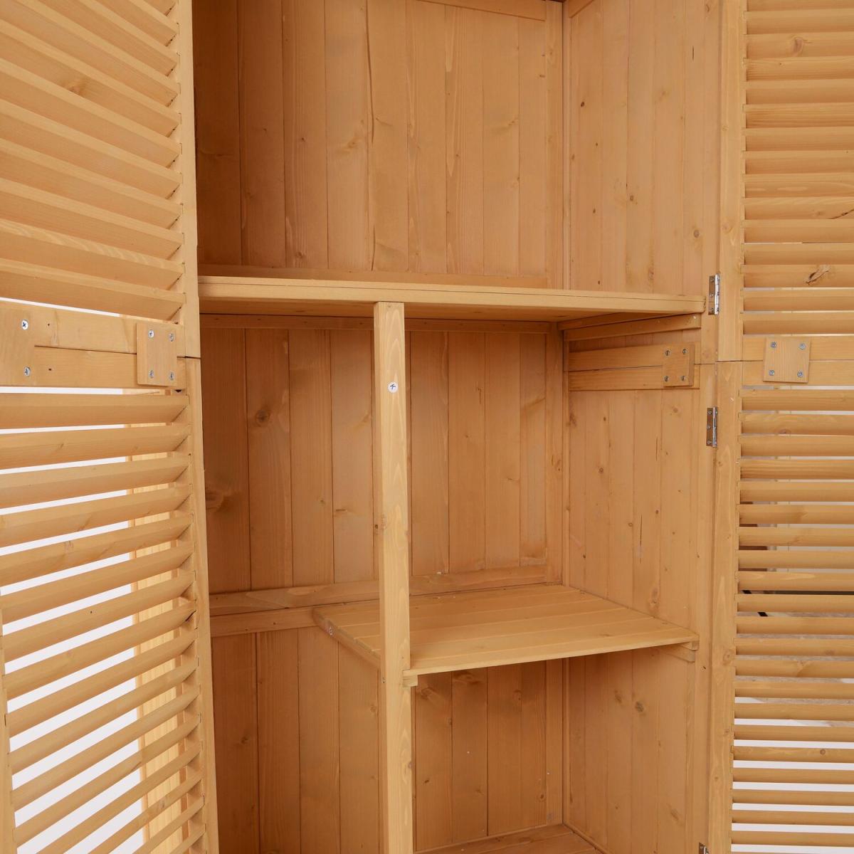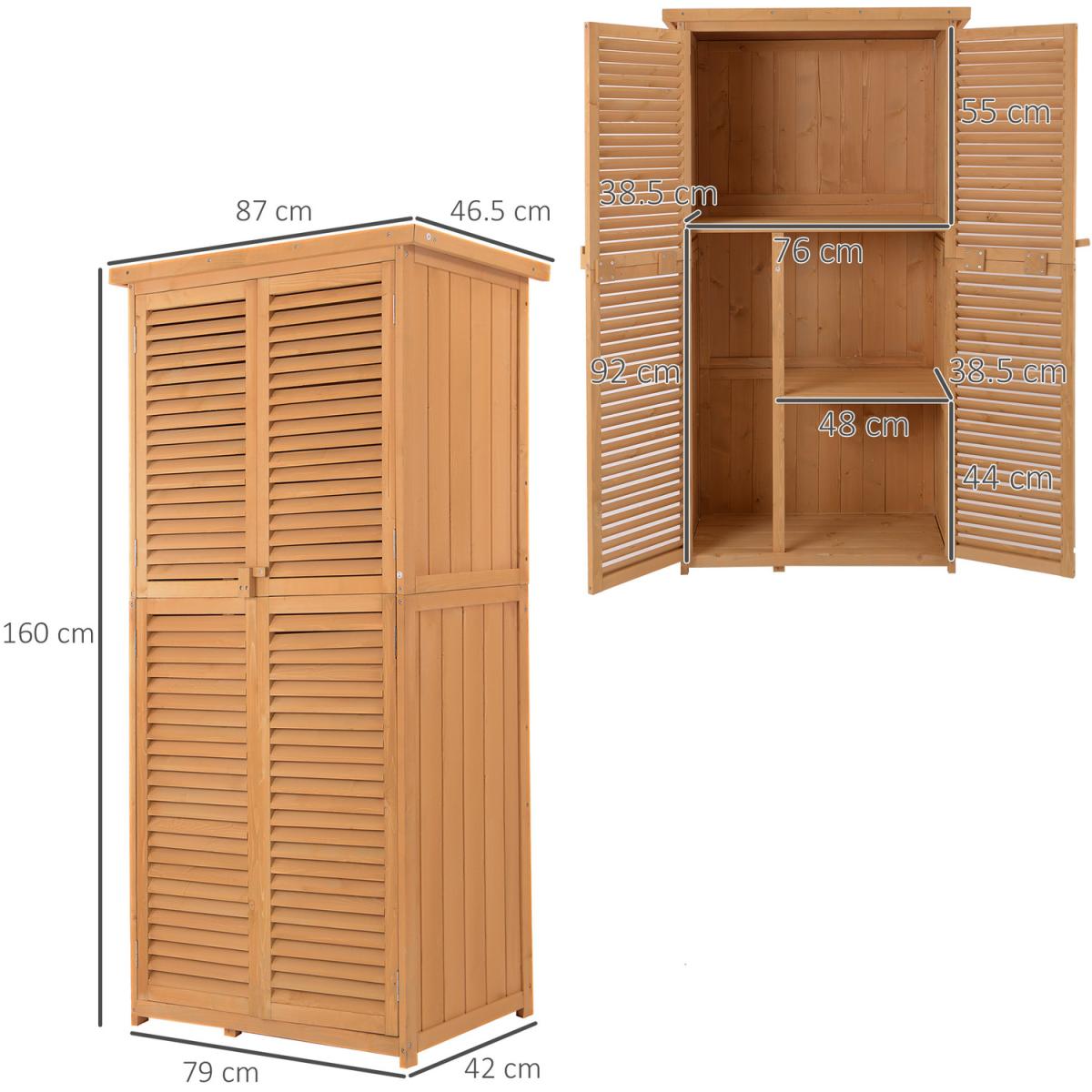 Give your gardening tools and outdoor essentials storage and organization with these outdoor wood sheds from Outsunny. We made sure to have plenty of space with three shelves at the bottom and a larger space on top. The slanted asphalt roof doesn't allow for water to pool, while the material ensures no water seeps into the tool cabinet. The two wooden doors of the backyard storage have a wooden lock to secure your tools. Check out these storage sheds for outside, and get organized in your yard.