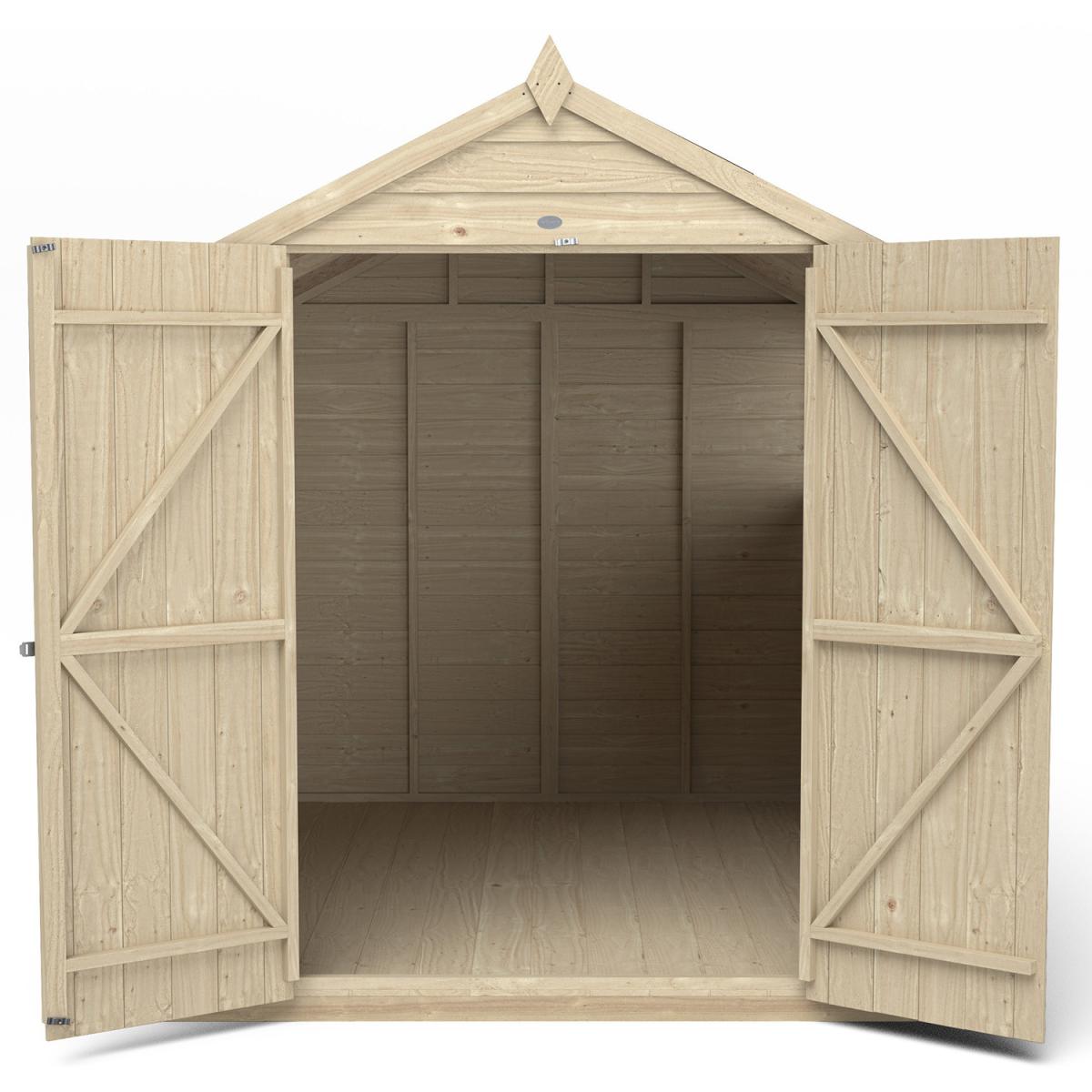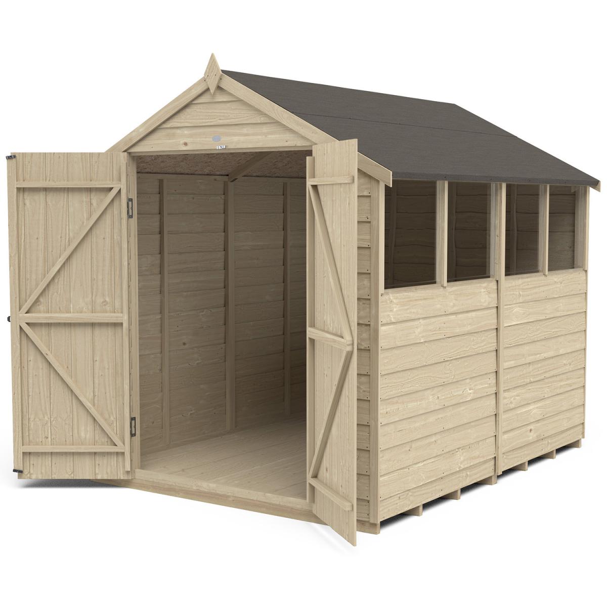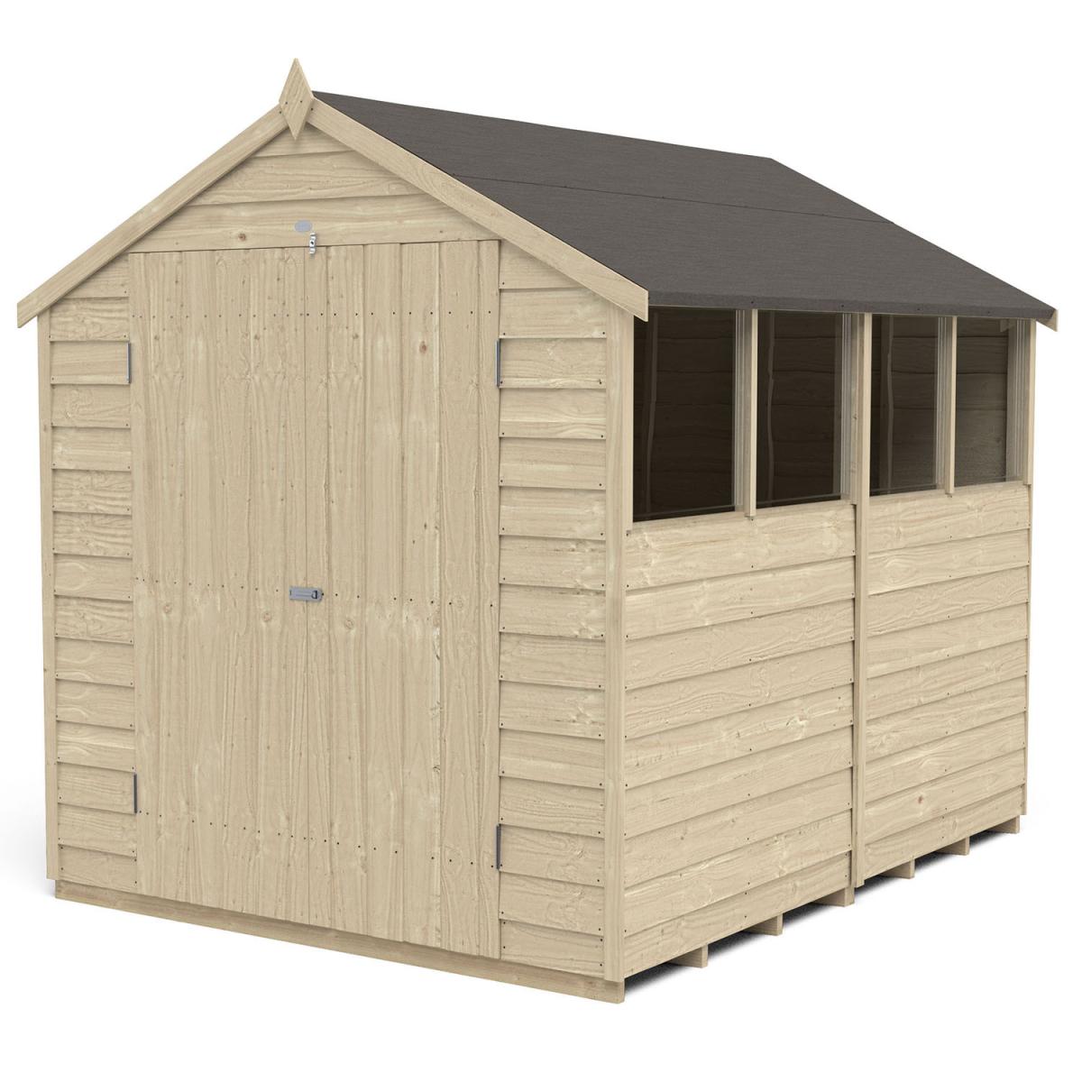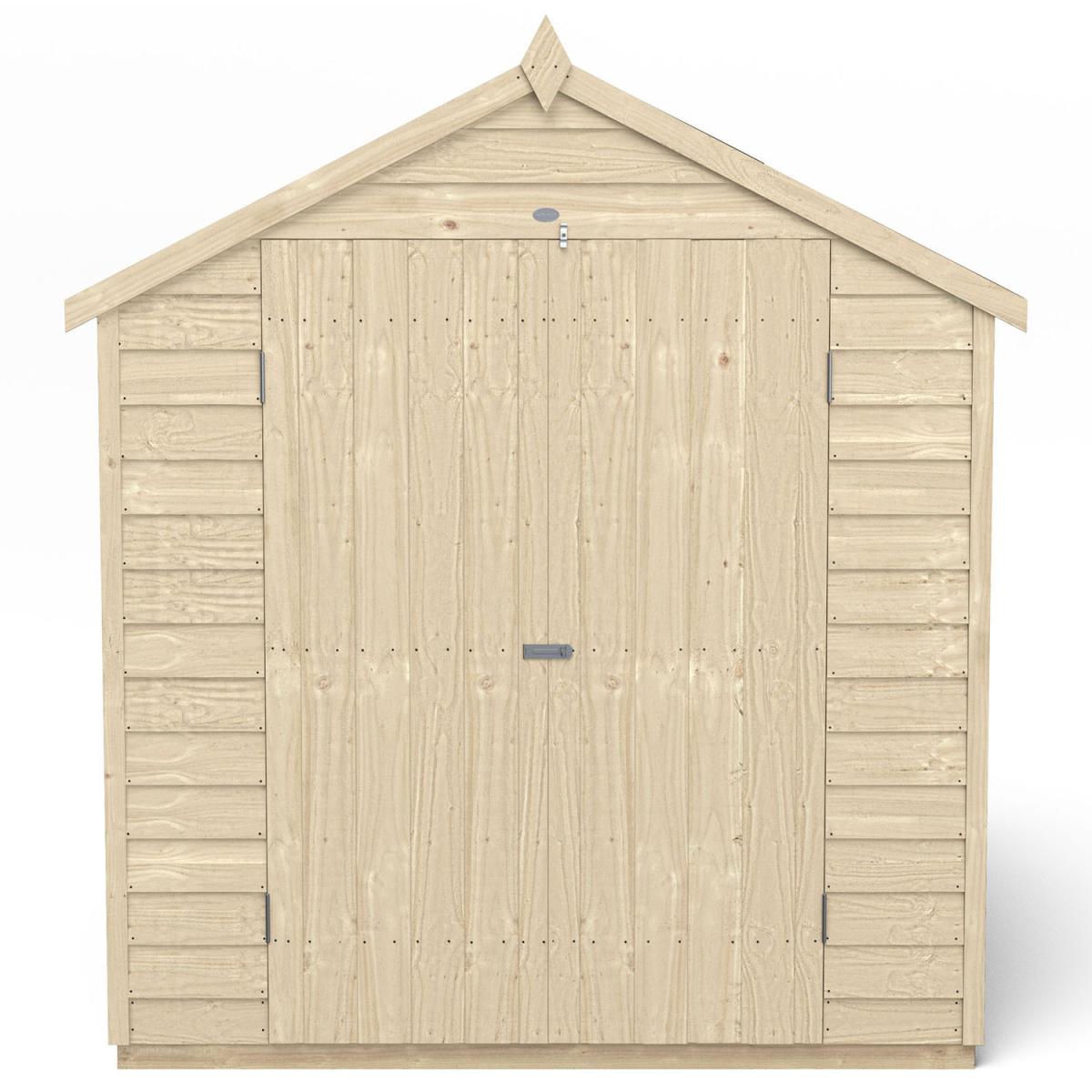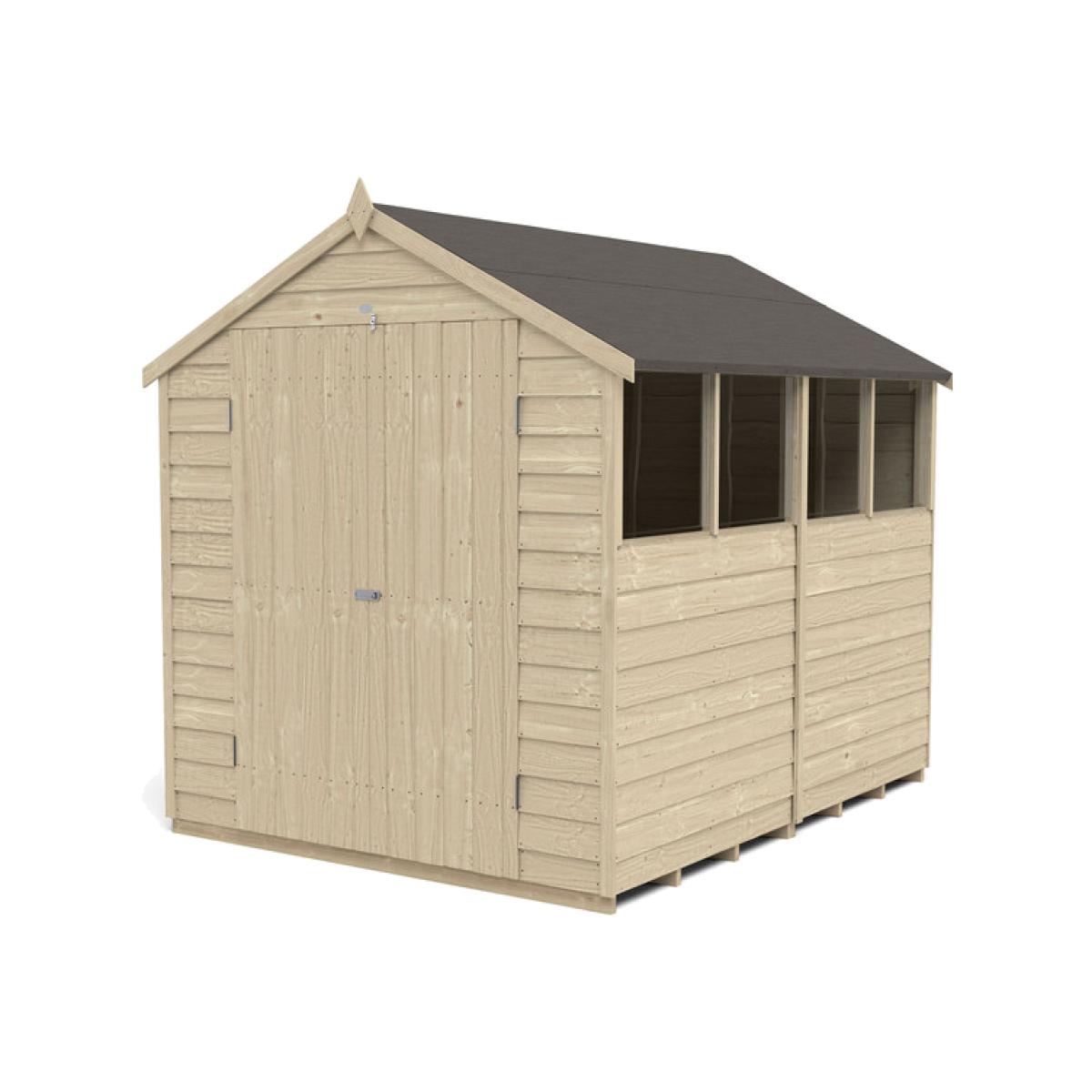 Keep your garden neat, tidy, and organised with the Overlap Pressure Treated Apex Shed. The traditional apex roof, generous headroom, and decorative touches ensure this shed will look fantastic in your garden, as well as being extremely practical. Available in an array of sizes to help you find one that's perfect for your needs and outdoor space, the Overlap Apex Shed is perfect for storing away garden machinery and tools, bikes, kids' outdoor toys, and much more. Constructed using pressure treated timber, this shed will stay strong and durable for years to come. It is resistant to rot and fungal infections, and the overlap design of the timber boards allows for natural movement of the timber during changing weather conditions and aid in water run-off. With increased framing to give the building a stronger construction, the shed comes with a solid timber floor, which is much harder than more common OSB, making it ideal for storing heavier gardening equipment. The shed also comes with hidden security measures, featuring anti-tamper hinges that can't be seen or accessed from the outside, as well as a hasp and staple latch that allows you to padlock the door. The Overlap Apex Shed is available either with or without windows, allowing you to personalise your shed to your own taste. If you intend to use the shed for purely storage needs, then a shed without windows may be the best one for you. It will keep prying eyes away from your garden goods, and keep everything inside protected from UV rays. A shed with windows, however, would be perfect for anyone intending to make a workshop out of their shed, or intend to spend some amount of time in it. The windows are made from shatter-proof PET glazing, which won't become yellow and brittle over time, making sure your shed always looks attractive. With a light, natural woody colour from the pressure treating, contrasting with the black sand felt roof, this shed won't only be a great storage place, but help to bring a sense of understated charm and elegance to your garden. The diamond-shaped finial at the peak of the roof helps create even more height from the outside, while the natural grain found throughout the wooden beams ensures this shed will fit in with any natural garden decor. Installation by a team of professionals is available for an extra yet affordable price, and all fittings and fixtures are included with this shed, as well as easy-to-follow instructions are included for any DIY hobbyists who want to really make this shed their own by building it themselves.