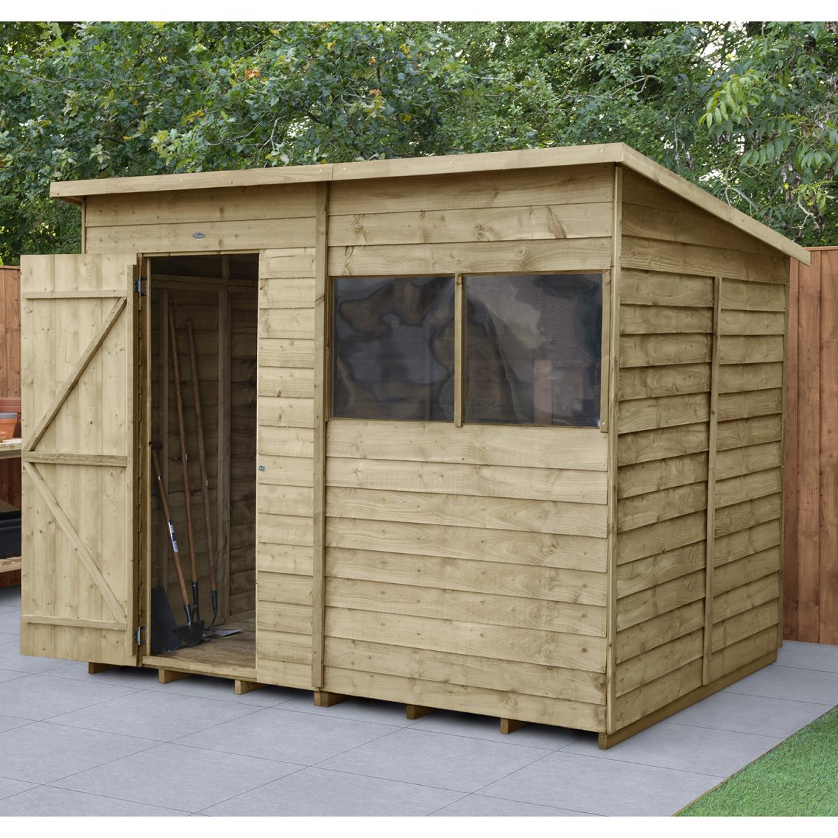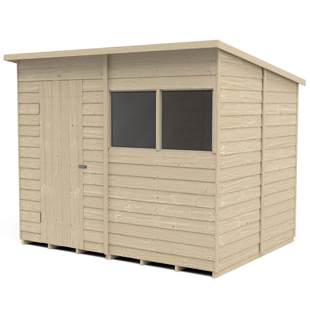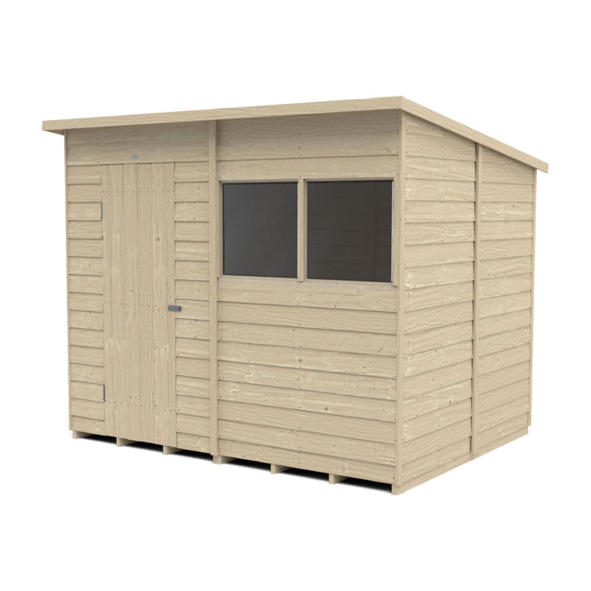 The 8x6 Overlap Pressure Treated Pent Shed is the ideal garden storage shed, helping you keep your garden neat, tidy, and stylish. The slanted pent roof is perfect for placing this shed against a wall or fence and will look brilliant in your garden. Available in an array of sizes to help you find one that's perfect for your needs and outdoor space, the Overlap Pent Shed is perfect for storing away garden machinery and tools, bikes, kids' outdoor toys, and much more. Constructed using pressure treated timber, the Overlap Pent Shed will stay strong and durable for years to come. It is resistant to rot and fungal infections, and the overlap design of the timber boards allows for natural movement of the timber during changing weather conditions and aid in water run-off. With increased framing to give the building a stronger construction, the shed comes with a solid timber floor, which is much hardier than more common OSB, making it ideal for storing heavier gardening equipment. The windows are made from shatter-proof PET glazing, which won't become yellow and brittle over time, making sure your shed always looks attractive. The shed also comes with hidden security measures, featuring anti-tamper hinges that can't be seen or accessed from the outside, as well as a hasp and staple latch that allows you to padlock the door. The pressure treating of the timber allows for the pale gold colour and natural wood grain to really shine through. This paired with the understated yet stylish construction will help this Pent Shed become a decisively sweet and charming structure within your garden, complimenting all natural foliage and any colour scheme of your decor. Installation by a team of professionals is available for an extra yet affordable price, and all fittings and fixtures are included with this shed, as well as easy-to-follow instructions are included for any DIY hobbyists who want to really make this shed their own by building it themselves.