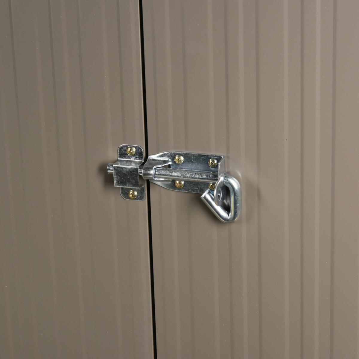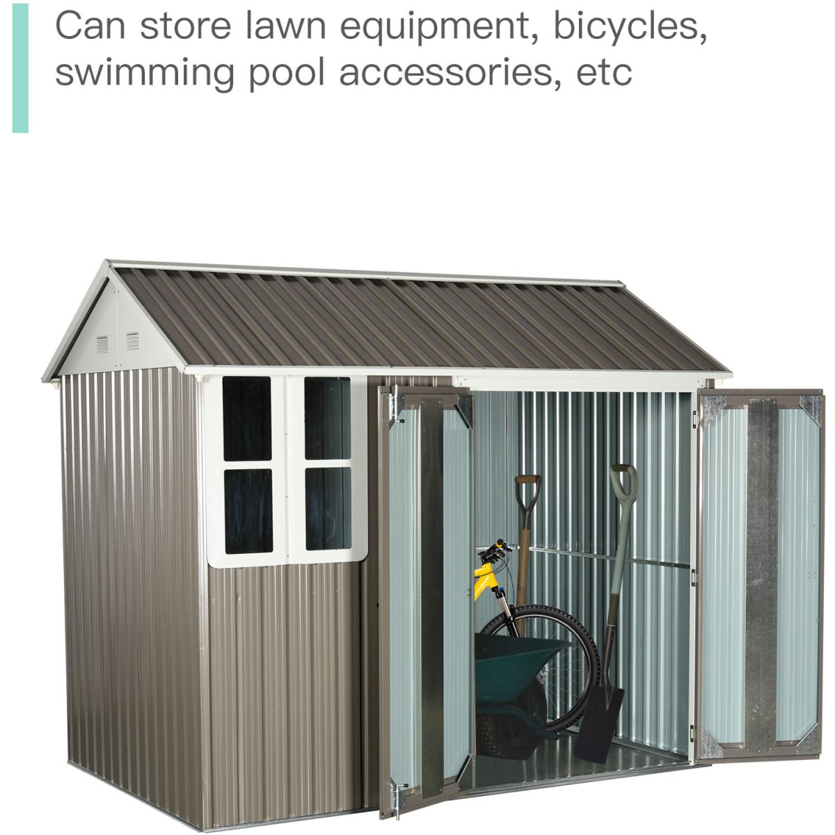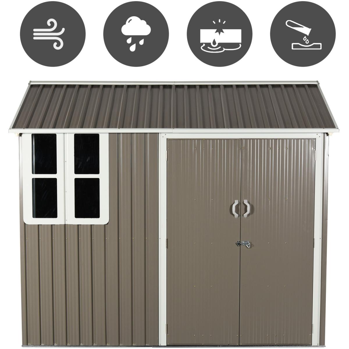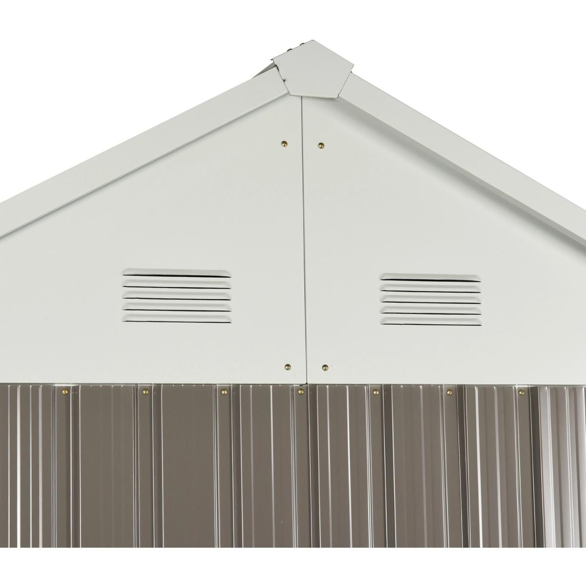 This garden shed from Outsunny is made of galvanized steel, which is durable, resistant to corrosion and will stand proudly in your garden. It is fitted with an inclined steel roof to prevent water build-up, a double door for easy access and four vents for airflow inside to prevent mould and humidity. Measuring 4.5 square meters, it is large enough for your garden storage and outerwear. It is finished with a latch lock for security and does not include a floor foundation.