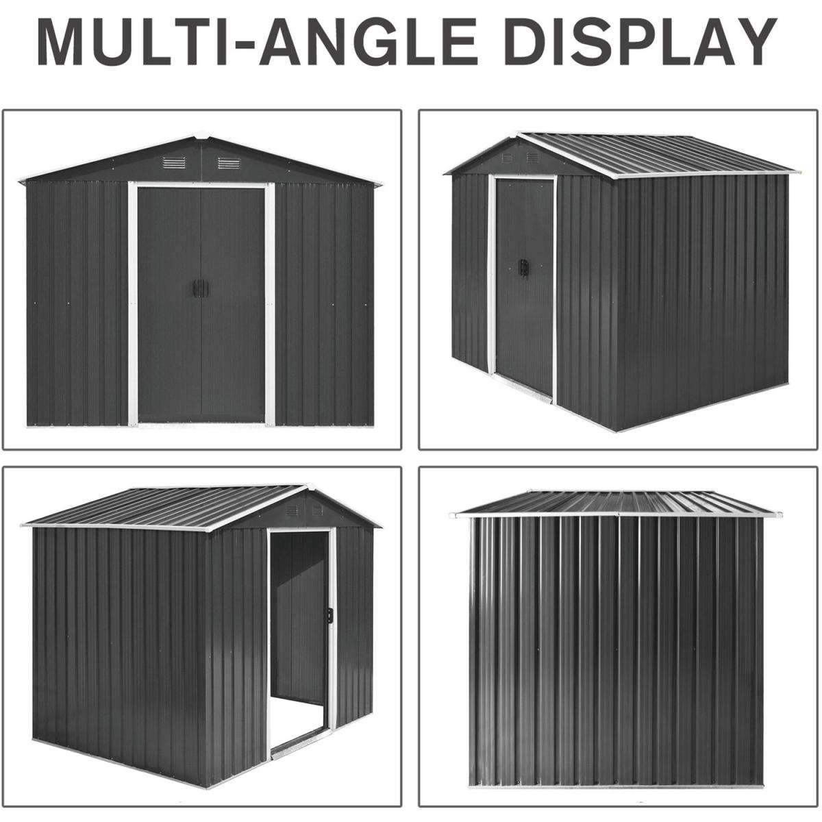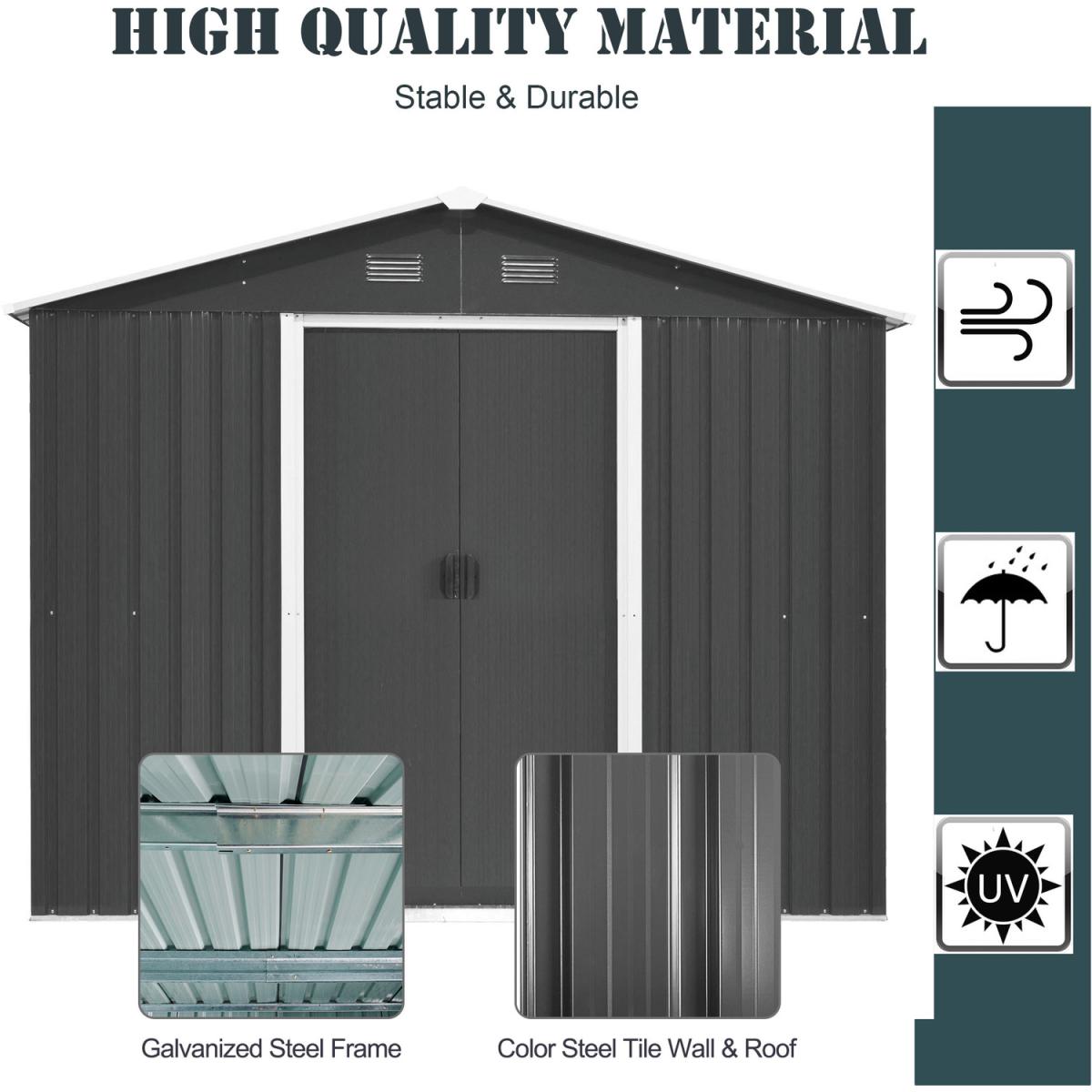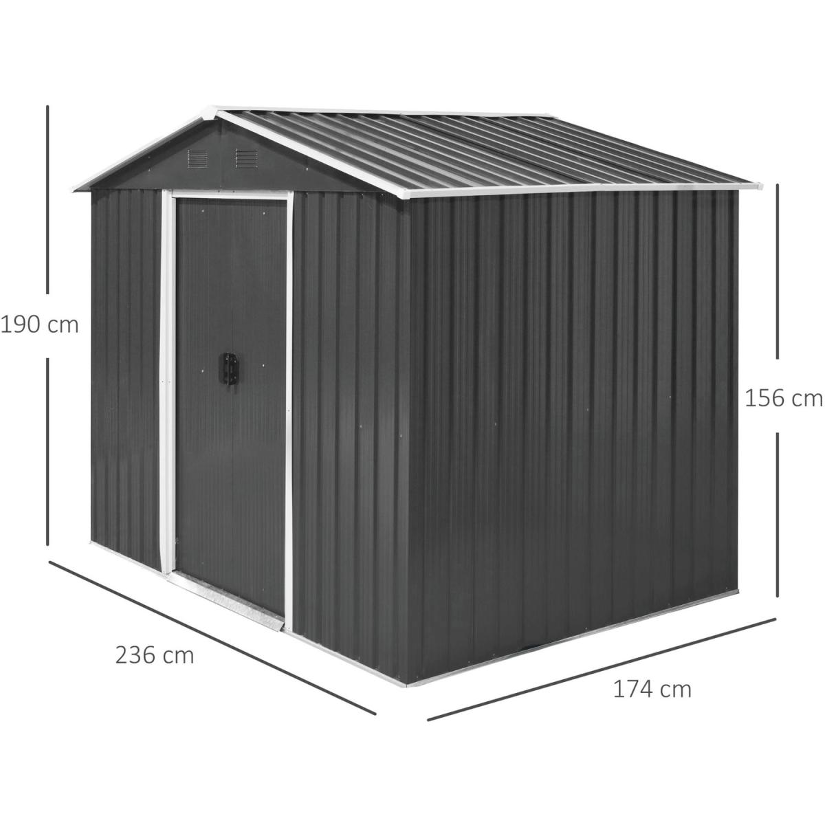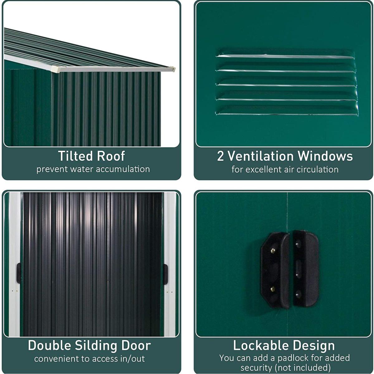 This Outsunny garden shed is made of galvanized steel which is durable and resistant to corrosion - it's a durable addition to your garden. The sloping roof prevents rainwater from collecting on the top and potentially damaging the frame. The double sliding door makes it easier to walk in and out, even with equipment in hand. Large storage space ensures that you can store plenty of garden tools inside. The four ventilation slots keep the inside fresh to prevent mould and moisture build-up.