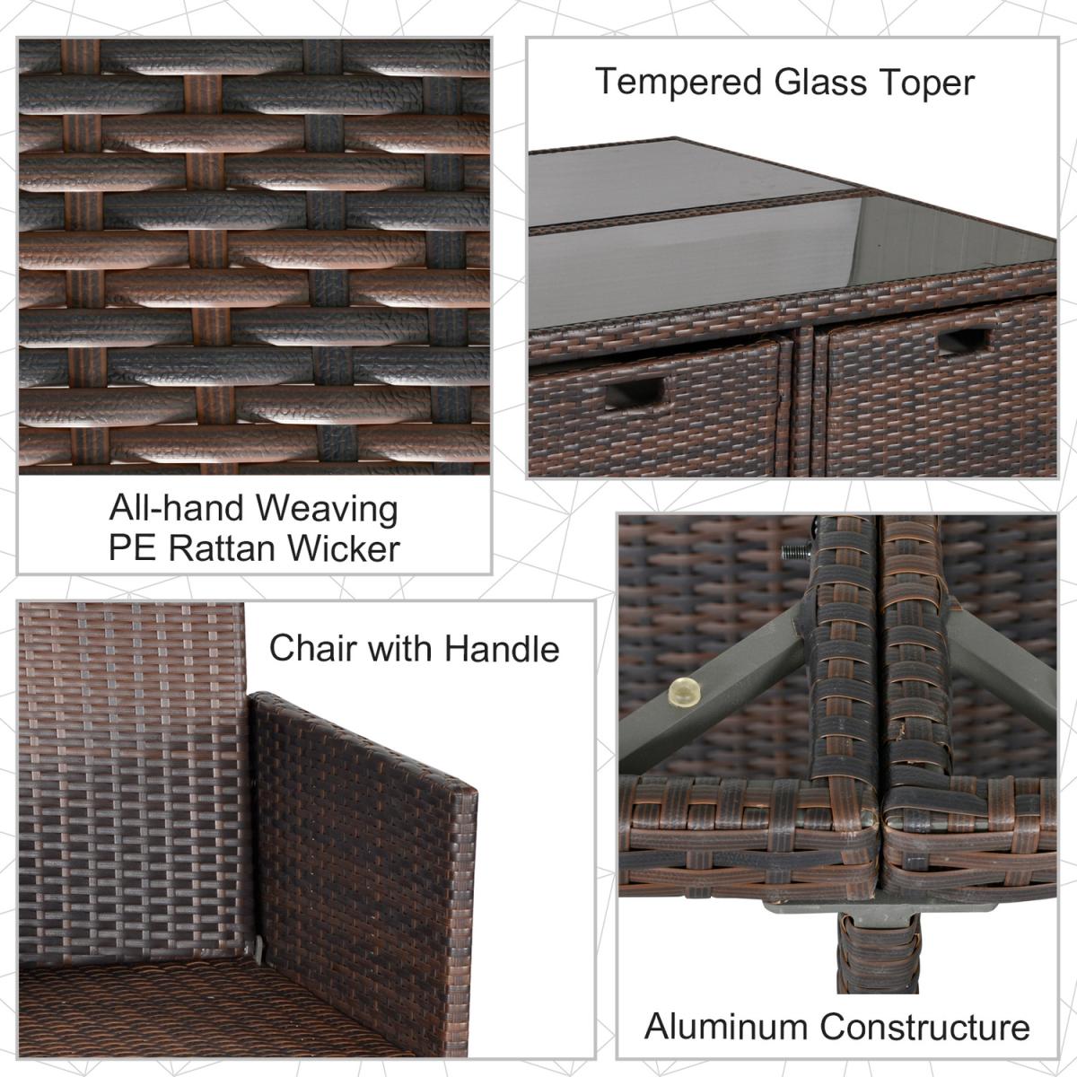 The Outsunny 9-piece outdoor wicker dining set with cushions is suitable for any occasion. The elegant rattan dining set includes 1 table, 4 armchairs and 4 footrests made of aluminium frame and PE rattan. The wicker and tempered glass table combination looks fashionable and create a modern style for your living area.