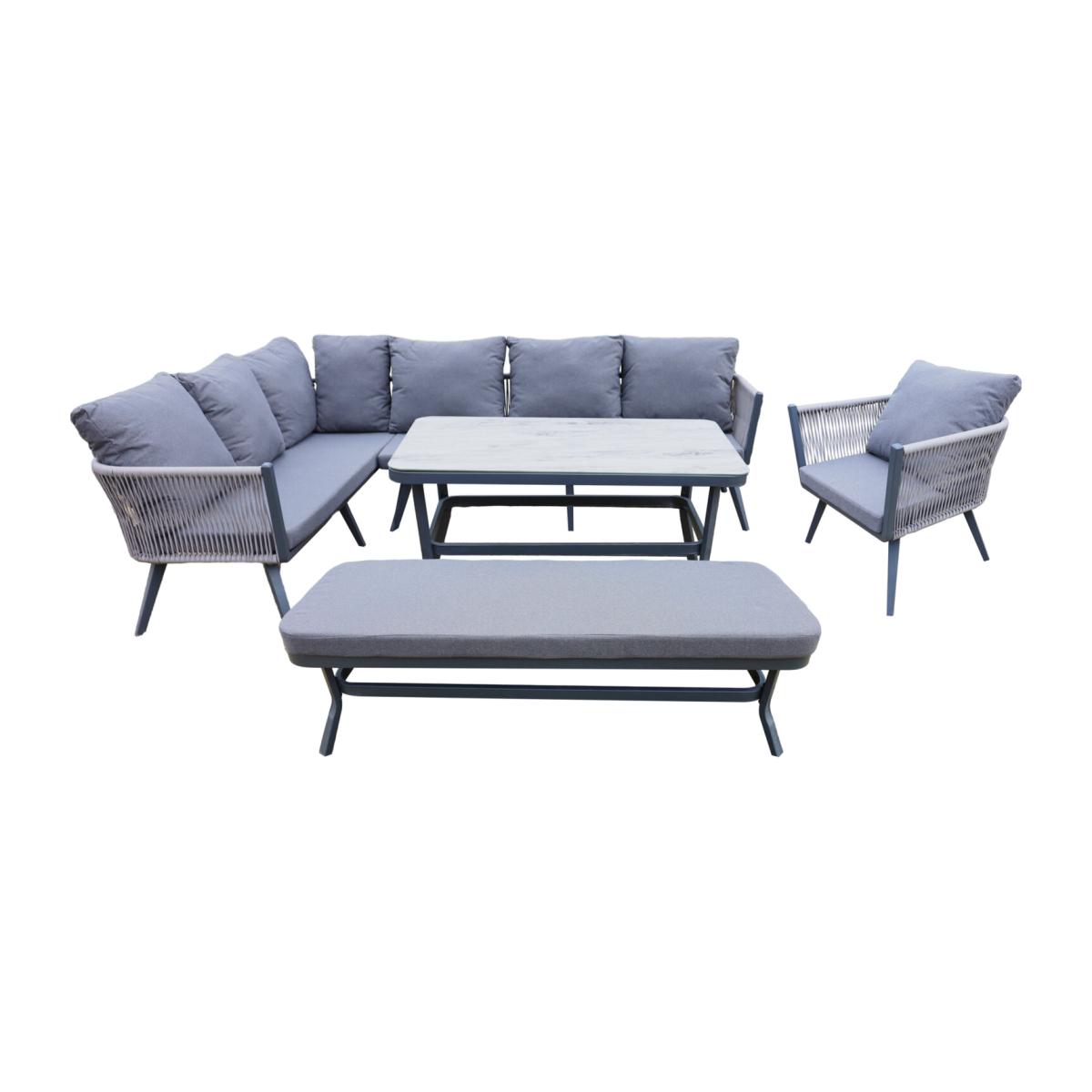 Welcome to our outdoor furniture collection, where comfort and style unite seamlessly to create the perfect oasis for your outdoor living space. Introducing our Grey String 9 Seater Outdoor Furniture Set, designed to elevate your gatherings with friends and family to new heights of relaxation and sophistication. Crafted with meticulous attention to detail and built to withstand the elements, our Grey String 9 Seater Outdoor Furniture Set offers ample seating for all your outdoor entertaining needs. This versatile set includes: x1 Modular 6 Seater Corner Sofa: Featuring a modular design, this spacious corner sofa can be arranged to suit your space and preferences, providing flexibility and comfort for lounging and socializing. x1 Single Seater Chair: Perfect for adding additional seating or creating cozy nooks within your outdoor area, the single seater chair offers comfort and style in equal measure x1 2 Seater Bench: Ideal for intimate conversations or as supplementary seating, the 2 seater bench complements the set with its elegant design and practicality. x1 Dining Table:Complete the ensemble with the stylish and functional dining table, providing a convenient surface for drinks, snacks, or decorative accents.